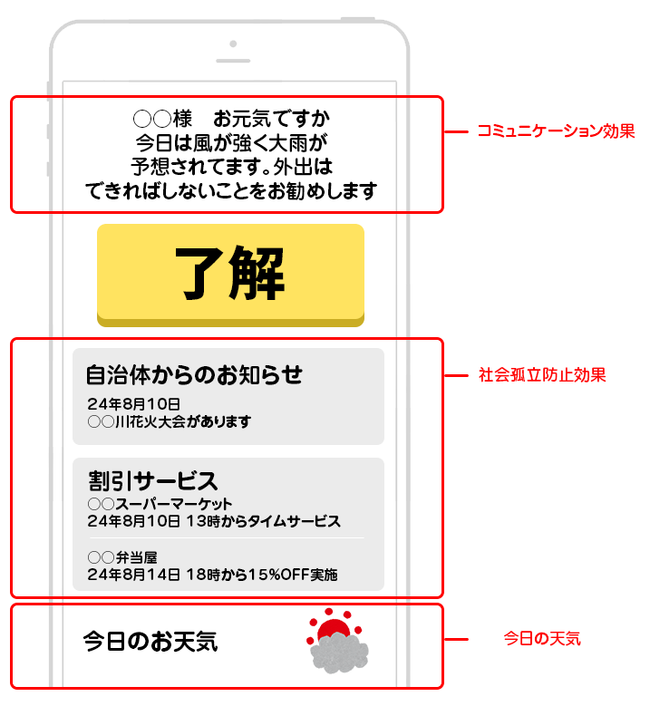 画像にもサンプル文が書いてありますが、単純に了解ボタンを押すだけではなく、その日の大事な情報を読んだり、住まいの地域情報、スーパーのタイムセールなどの情報を確認したり、このような情報表示で、一人暮らしの方が社会に孤立されないよう、取り残されないようにしたいと思います。