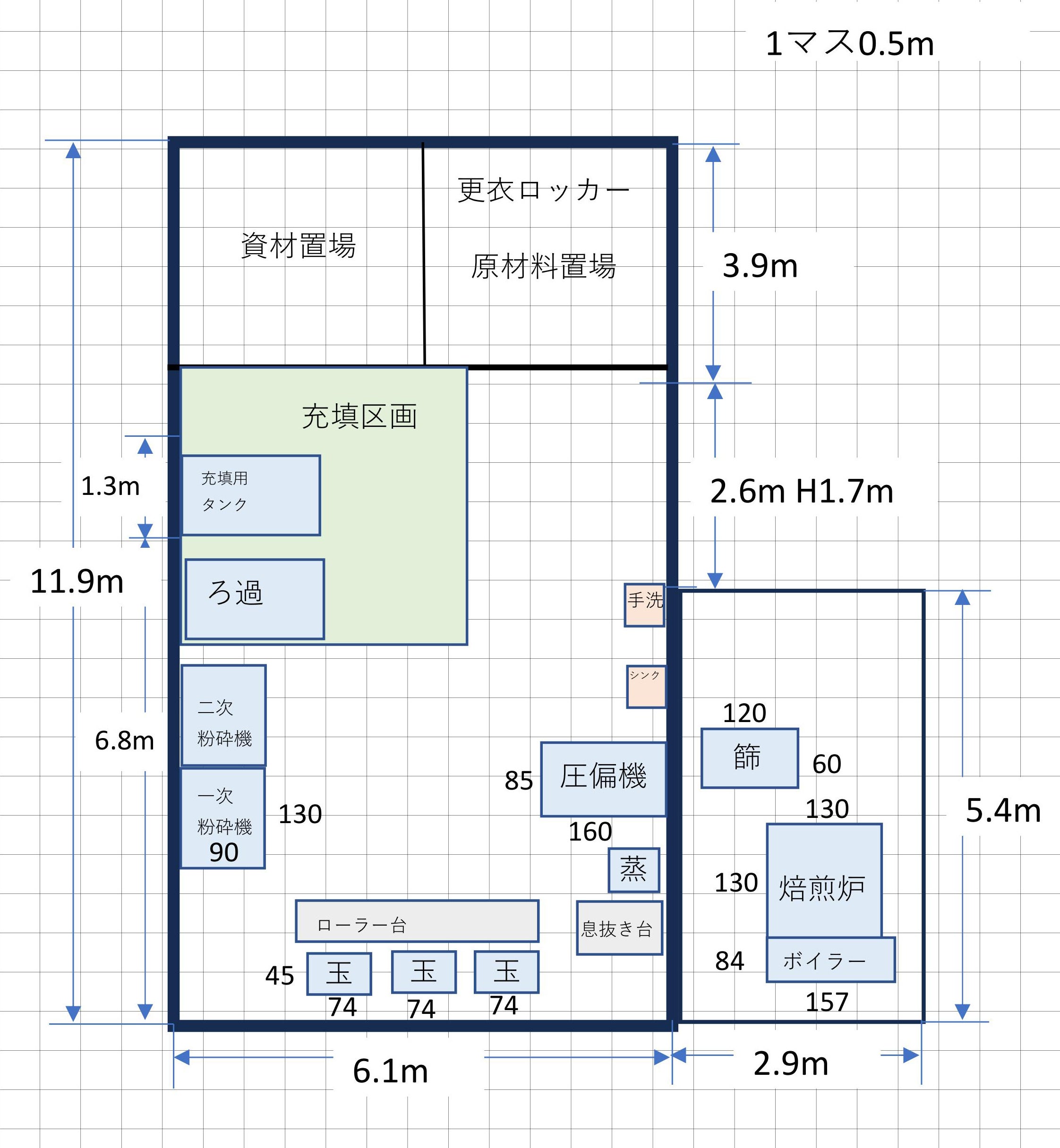 ところが、今回の相談で充填のための部屋を作る必要はなく、スペース(区画)が確保されていればいいとのことでしたしたので部屋は作らないことにしました。トイレは母屋にあるものでよく、更衣用ロッカーも母屋に設置した方がよいとのことでした。その他細かい指摘がありましたので、次回は変更した計画の図面を持っていきます。