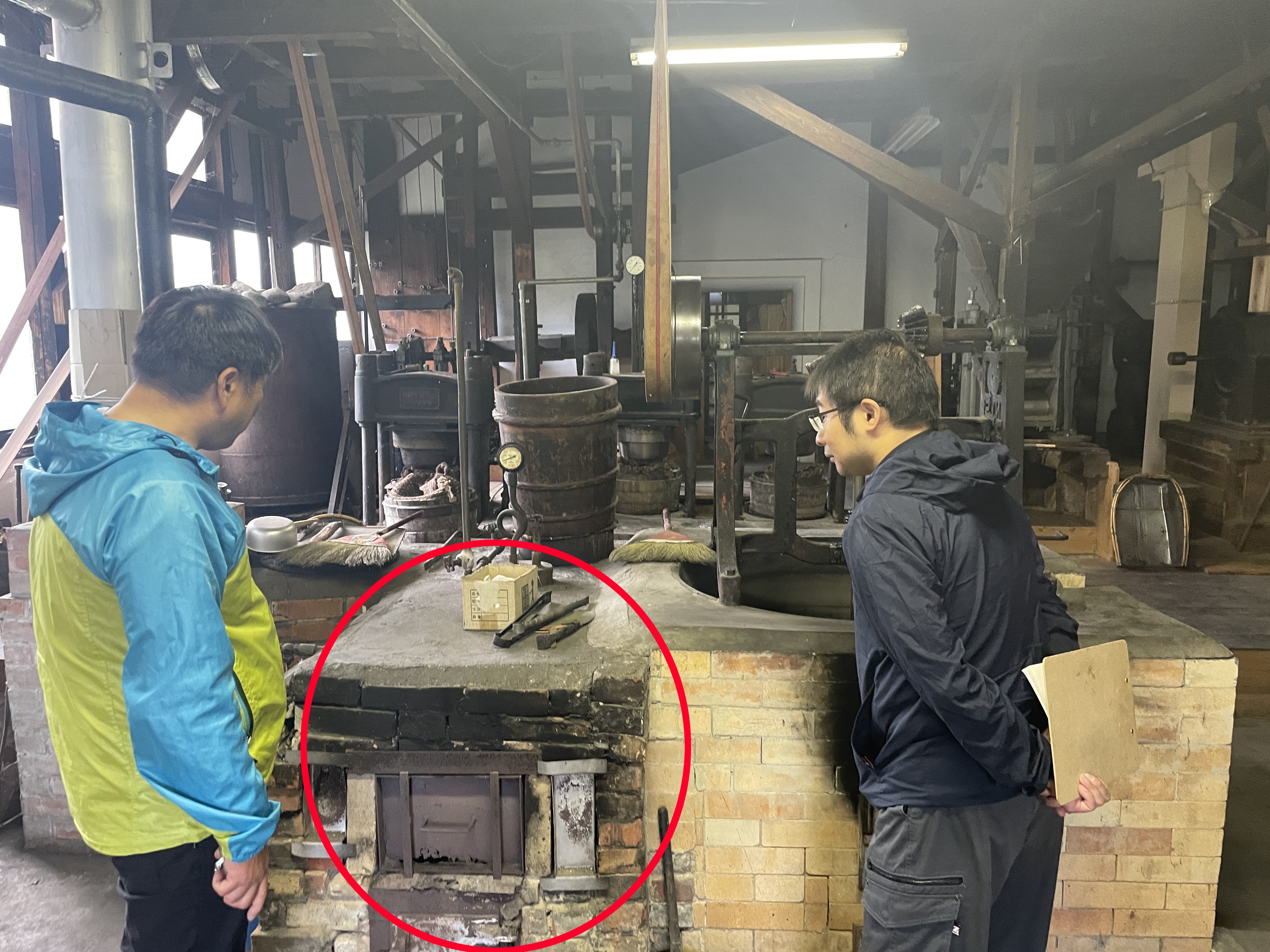 平出さんは、薪で蒸気を発生させるボイラー(上の写真の赤丸部分)でナタネを蒸していました。しかし、老朽化が激しく移設は困難ということで、移設先では新たなボイラーを設置する必要があります。蒸気は灯油ボイラーが一般的ですが(うちの豆腐屋でも灯油の蒸気ボイラーを使用)、できれば薪などの再生可能エネルギーを使いたいとの思いがあります。