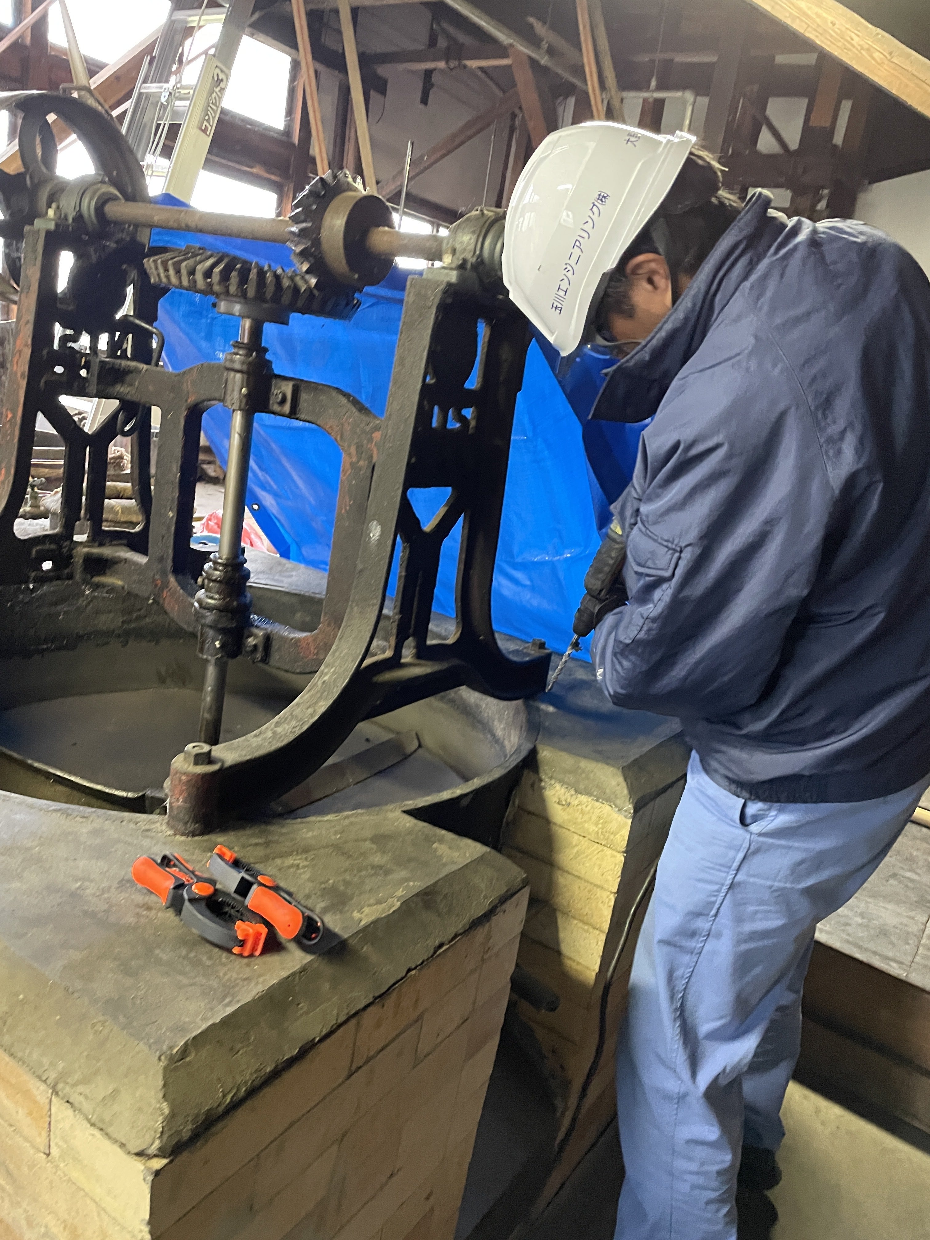 並行して、ナタネを薪の火で炒る焙煎炉を調査するために、一部を解体する作業もしてもらいました。長年の加熱のためか、上部のコンクリートが非常に硬く、ごく一部の耐火レンガを外すことしかできませんでした。次回はさらに強力な機材を用意して再度解体作業をすることになりました。同じものを製作するためには、内部のつくりを確認する必要があります。