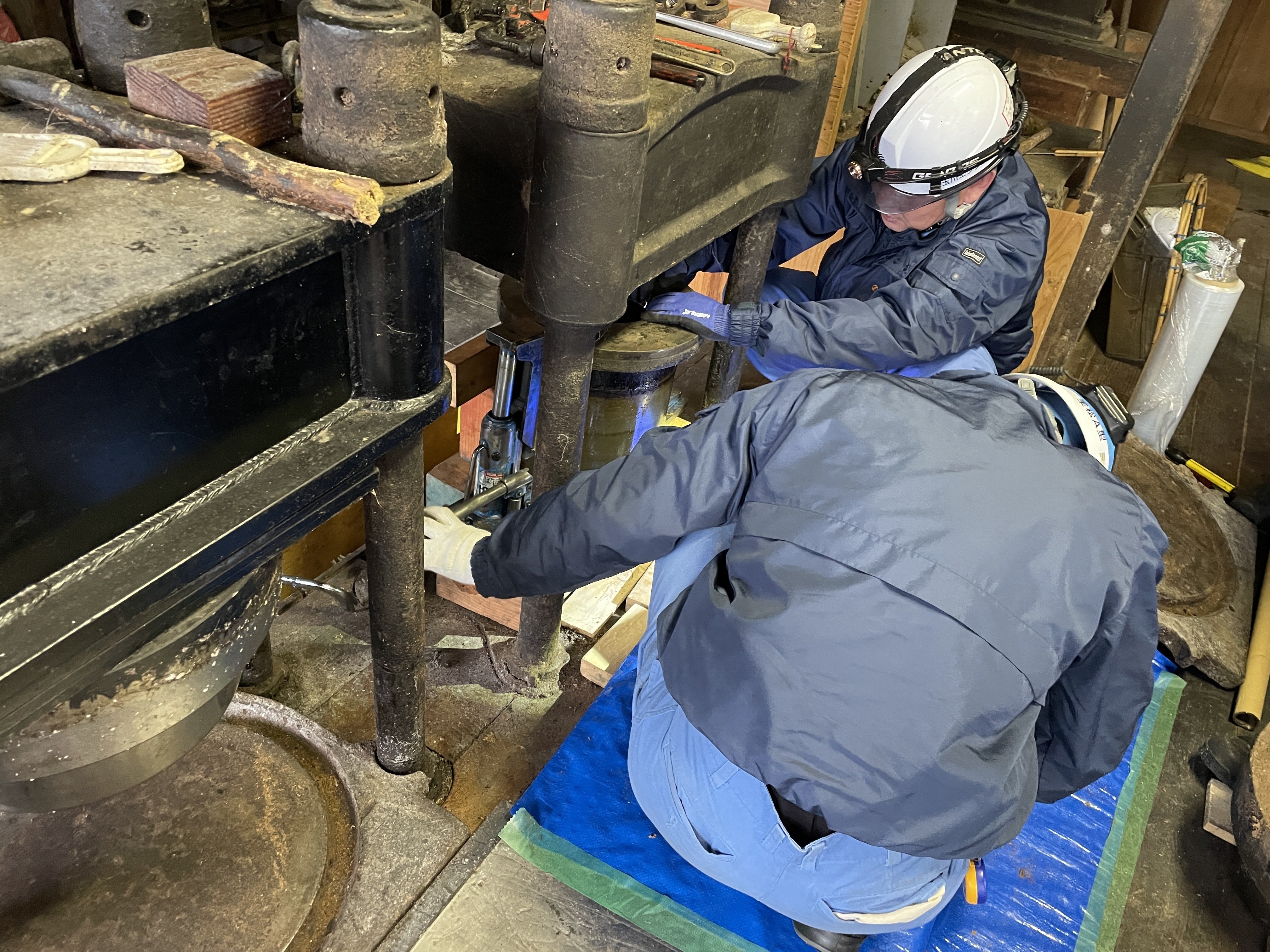 昨日12/9(月)、機材の移設をお願いしているT社(会津若松)に、玉締め機の油圧シリンダに使用されている馬の革製のパッキンを確認するための取り外し作業をしてもらいました。馬の革のパッキンを製造しているところは今はないため、牛の革で製作してくれる業者さんに確認してもらうためです。玉締め機の上部についている「玉」を外し(かなりの重さ。30Kg以上?)、上下するシリンダロッドを抜き取り、油圧に使われている菜種油をくみ出して、シリンダにはめ込まれているパッキンを外すという面倒な作業で、数時間かかりました。