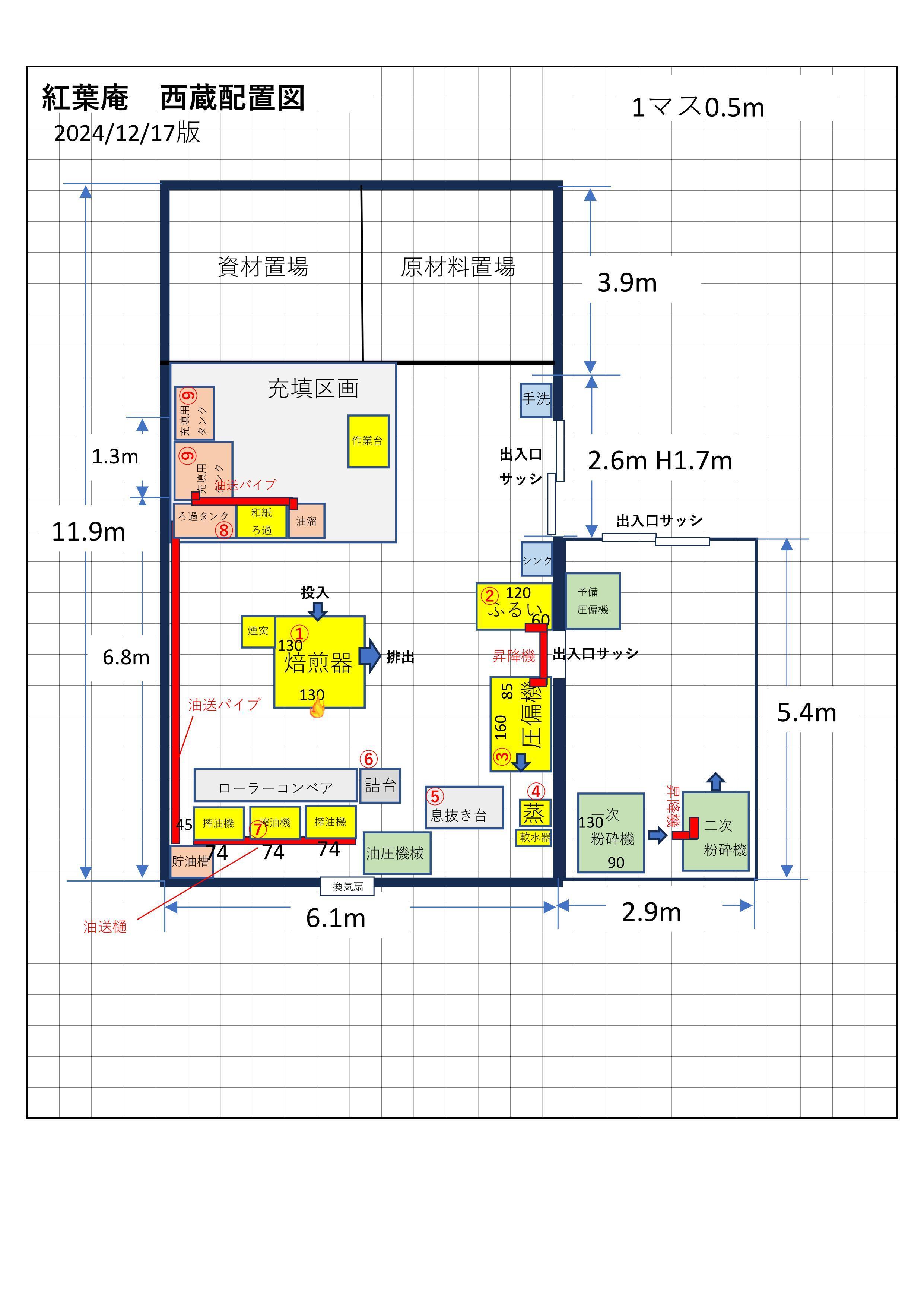 搾油施設は、蔵(上記図面左側)とそれに付随する下屋(右側)からなりますが、2回目のときの配置図では、下屋に焙煎器を配置していました。平出さんが、薪で焚く焙煎釜は夏は暑くなるので、別室の方においた方がよい、とアドバイスしてくれたためです。しかし、下屋の屋根は低いために煙突をどのように設置するかという問題が出て、蔵の内部(上記図面①焙煎器)に変更することになりました。