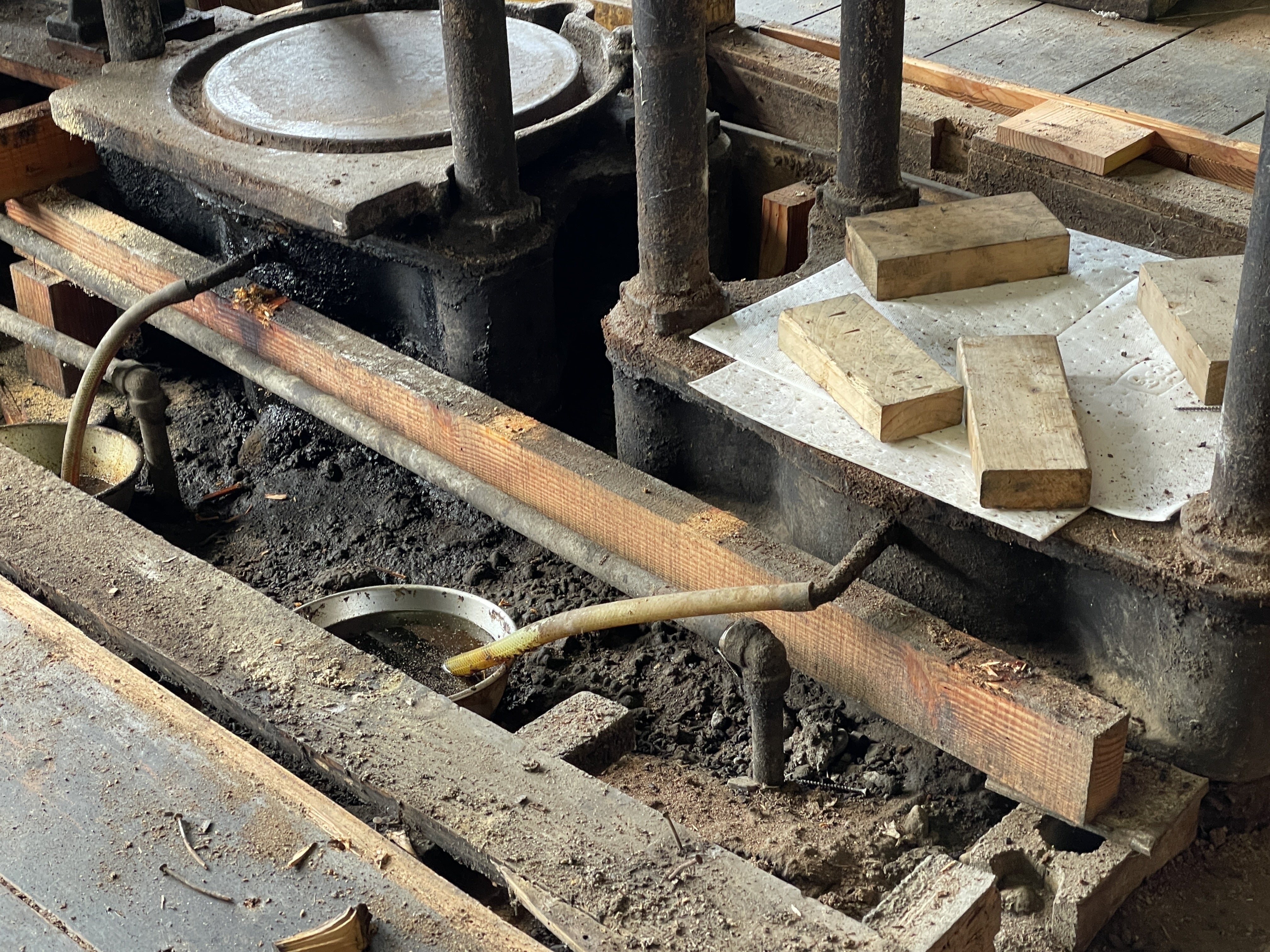 会津の大雪もやっと収まってきた昨日2/10(月)、O社(大桃建設工業)さんに平出油屋の床の解体工事(第1次)をしてもらいました。今回は、設備の搬出の前に半分床に埋まっている玉締め機の下の様子を確認するためです。床下はコンクリではなく土でした。