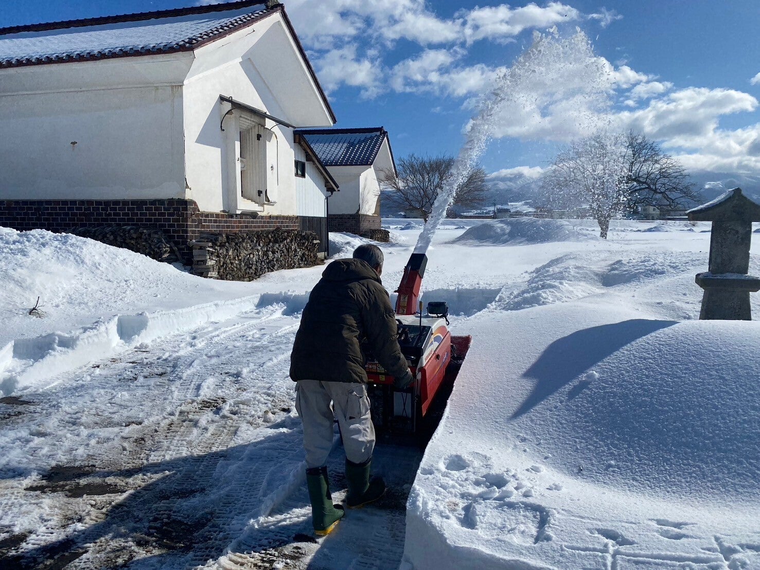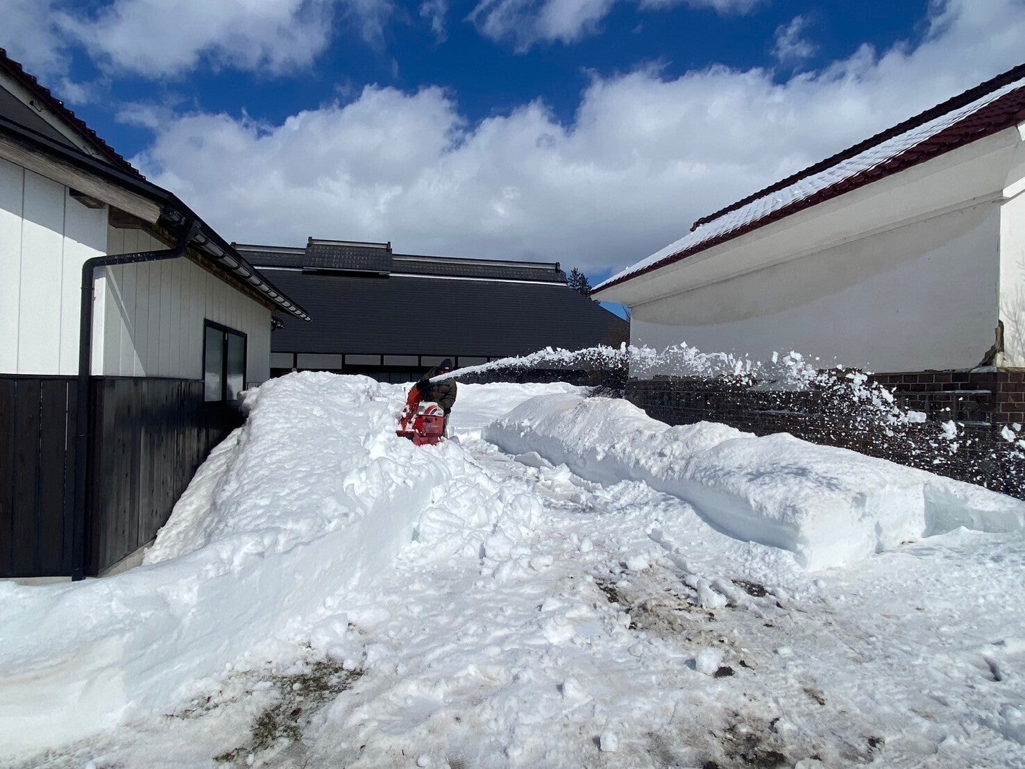 いよいよ古民家(紅葉庵)の蔵で工事が始まるのに先立ち、2/21(金)、大桃建設工業さんにより除雪が行われました。2月の数度にわたる大雪で紅葉庵には60cm以上の積雪。屋根からの雪で雪山のところも。クルマを停めるところもないので、除雪からの作業です。
