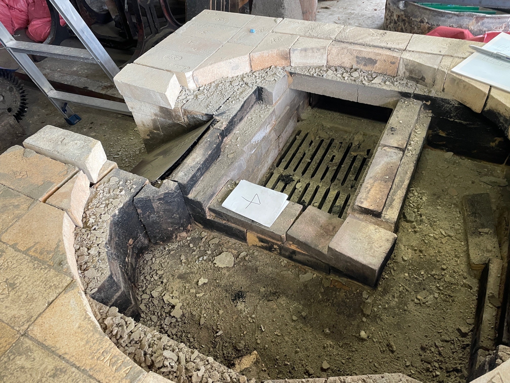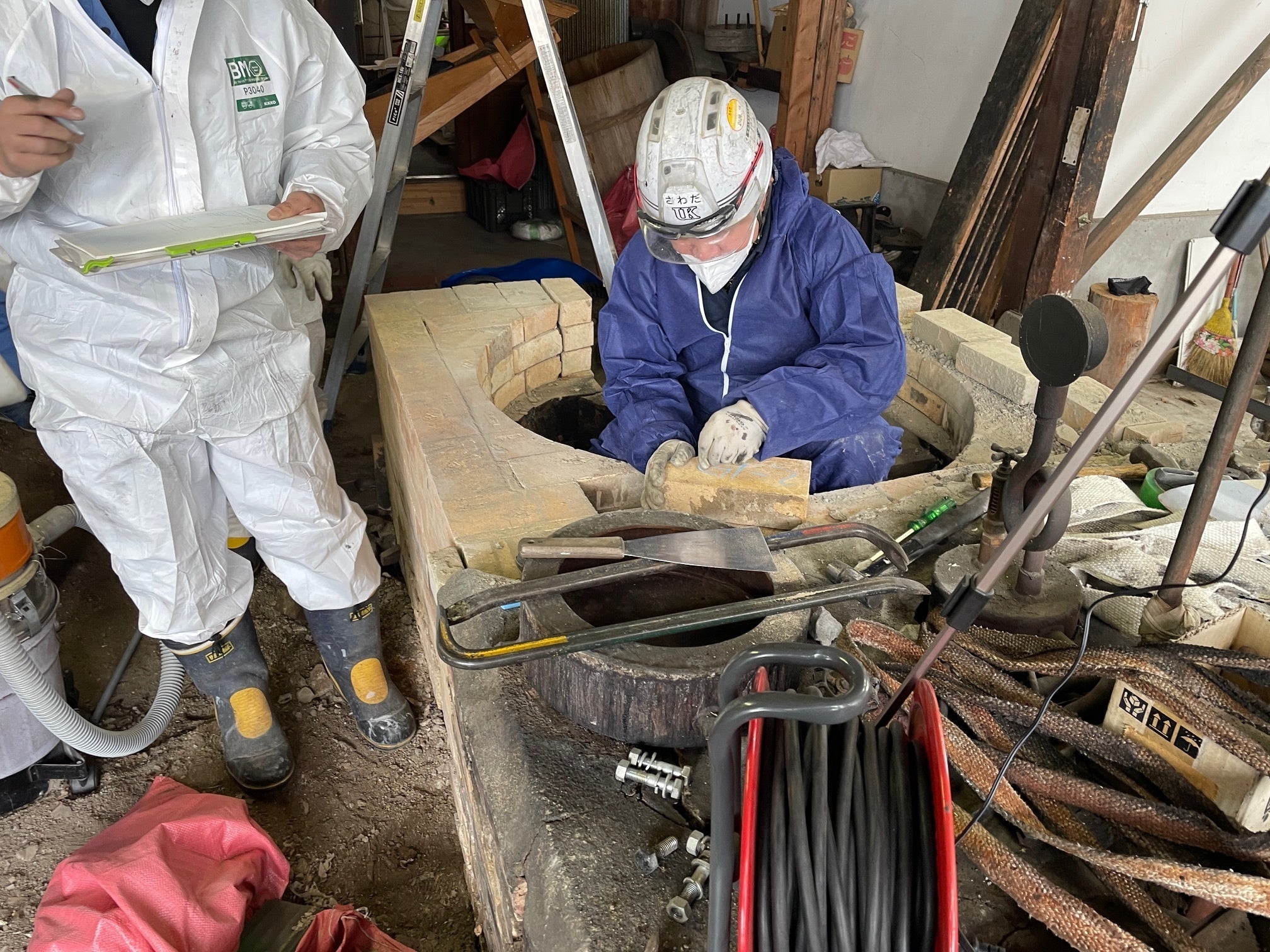 焙煎炉の復元組み立ては、僕がやることになっているので、組み方がどうなってるか朝から見学しビデオ撮影していました。耐火レンガの施工方法について勉強中です。