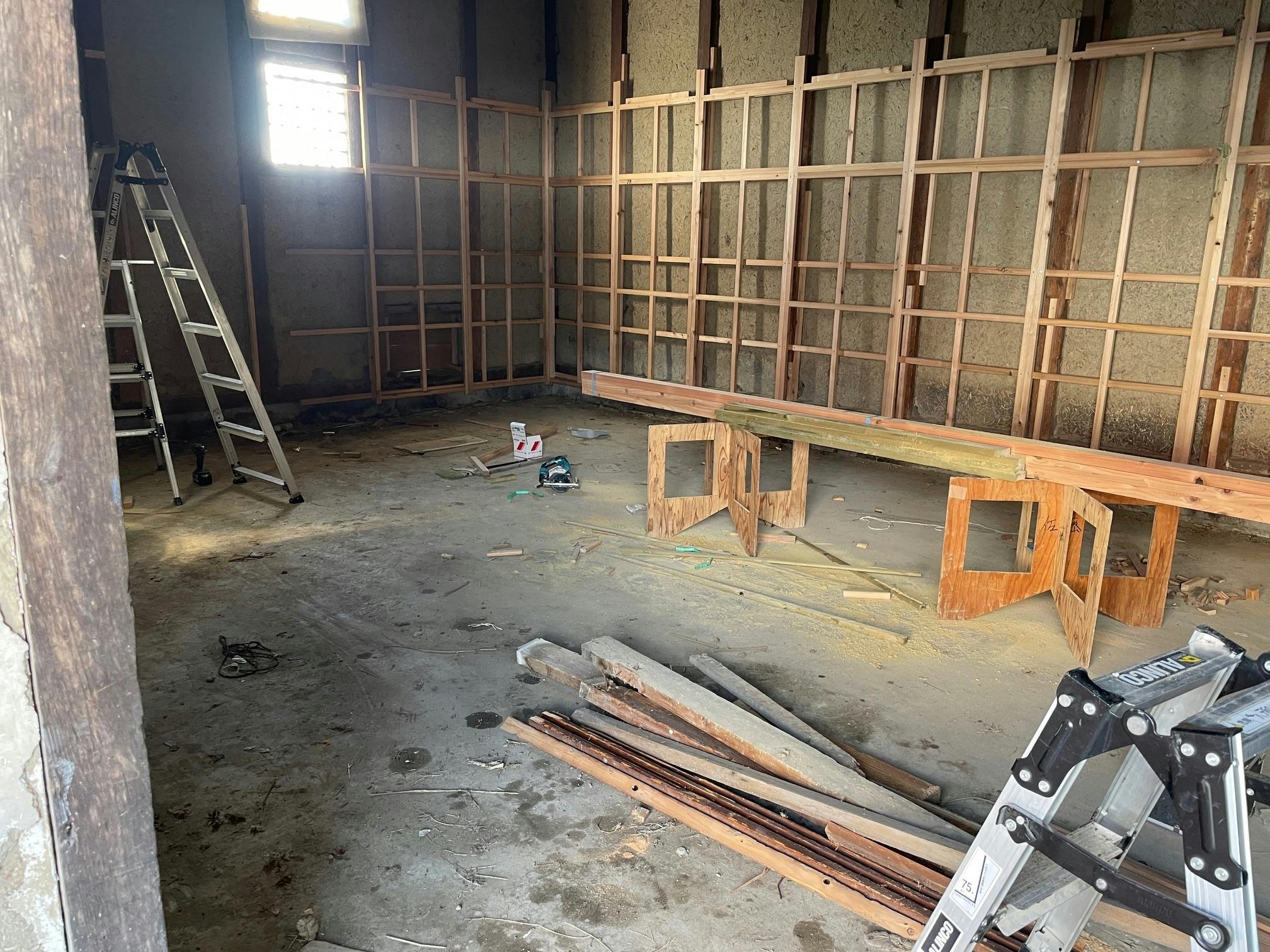 大雪で遅れていた紅葉庵の蔵の改修工事が、本日2/25(火)、大桃建設工業さんによって始まりました。まずは壁の改修。石膏ボードを張るための下地作りからです。