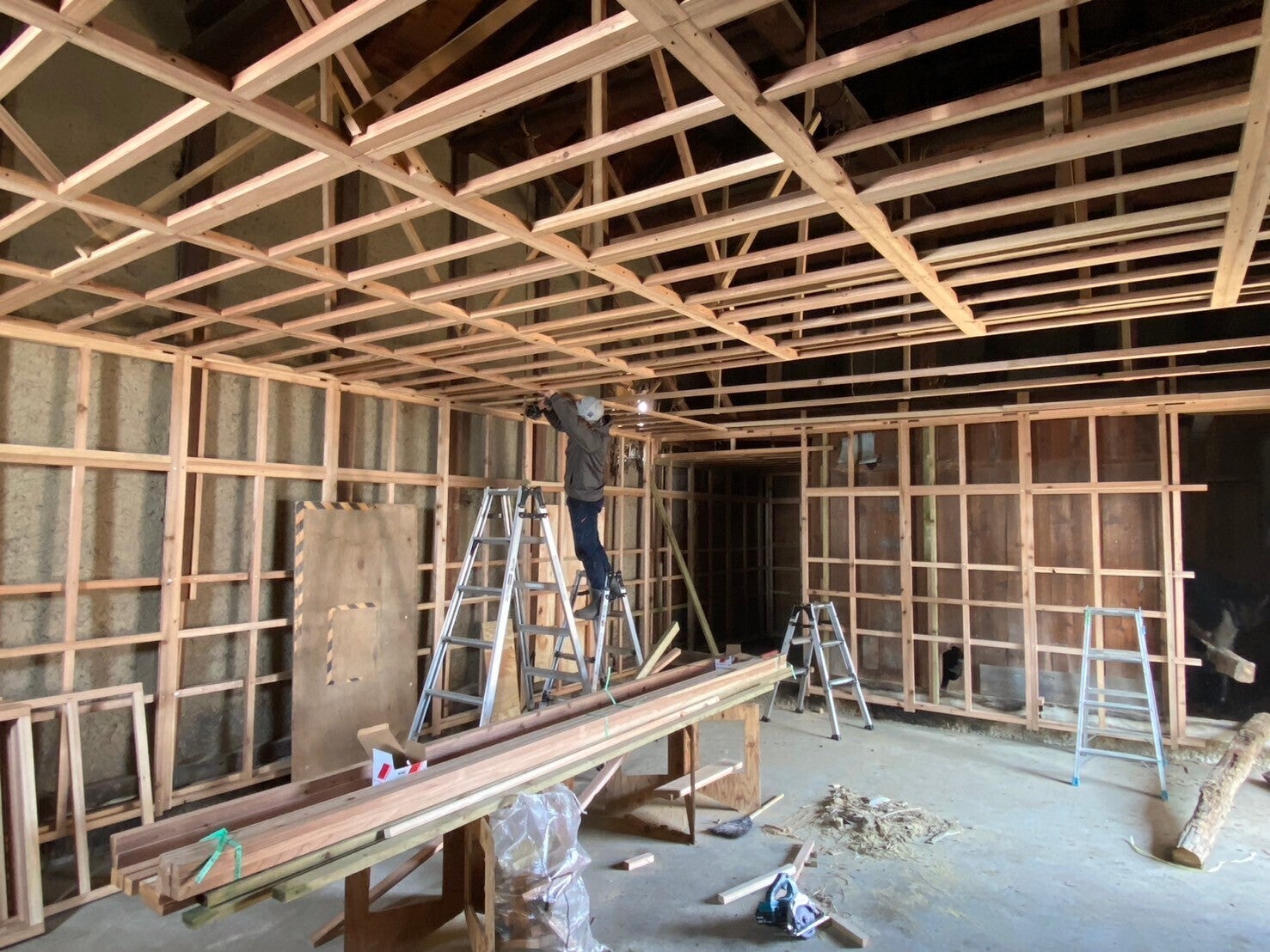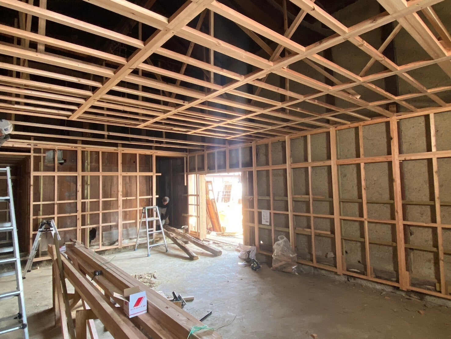 2/25(火)から始まった大桃建設工業さんによる紅葉庵の蔵の工事が2/28(金)までにここまで進みました。蔵の土壁や上部の立派な梁(はり)が見えなくなるのは残念ですが、保健所の指導なので仕方がありません。