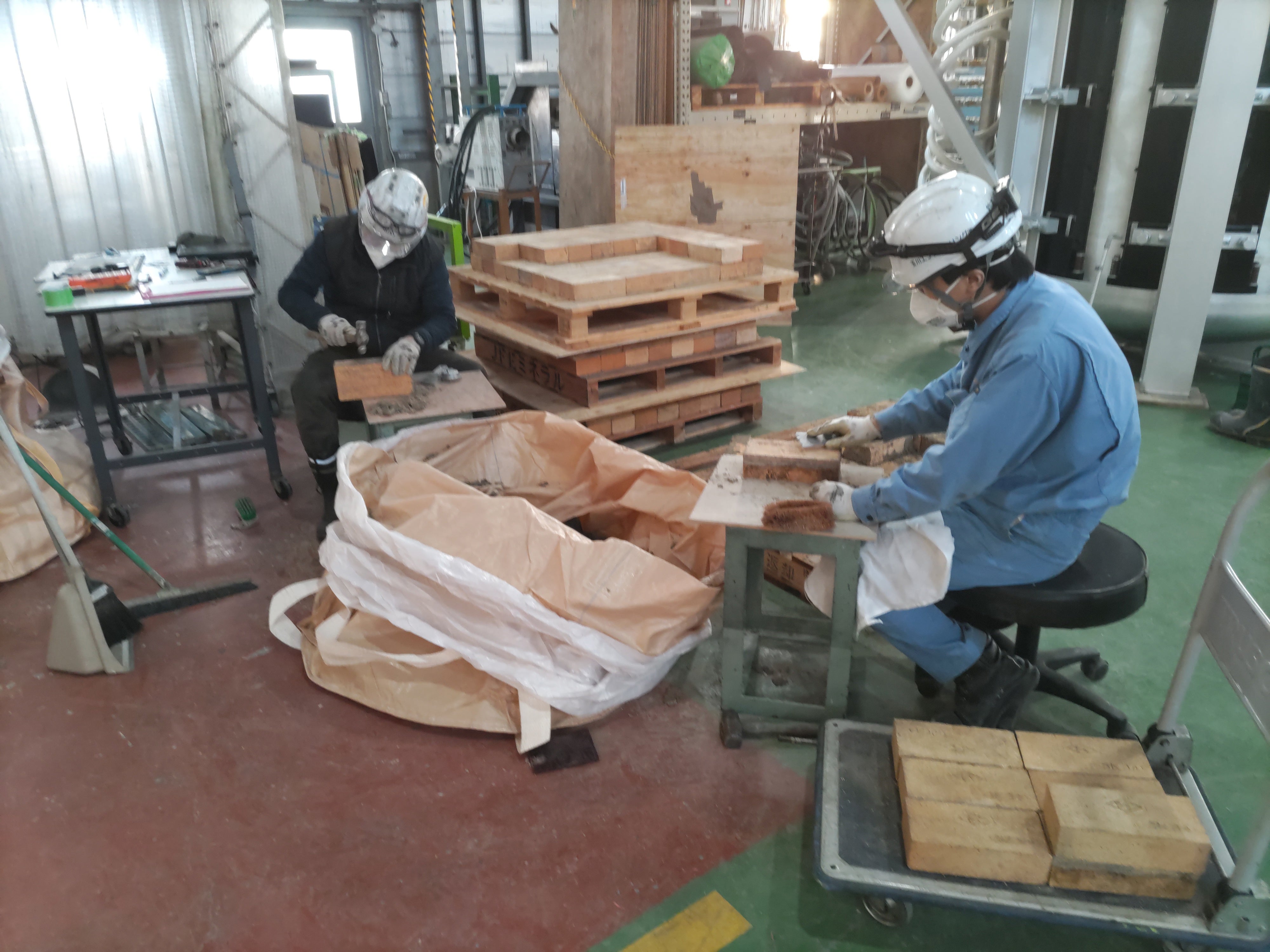 また、先日解体した焙煎炉のレンガは玉川エンジニアリングさんの工場で、再利用に向けてひとつずつきれいにしていただいてます。根気のいる仕事、ありがとうございます。