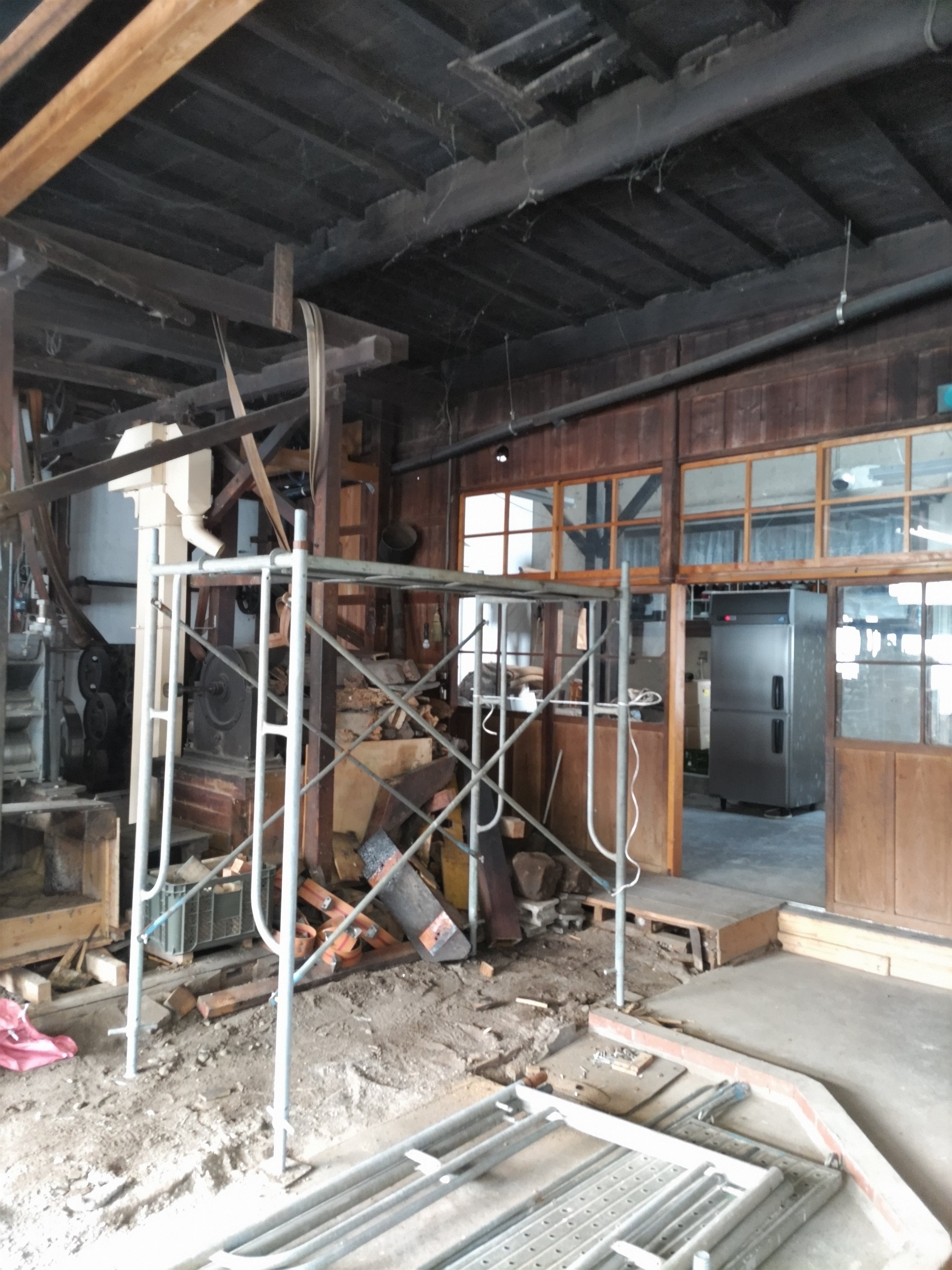 さらに、設備移設担当の玉川エンジニアリングさんも2/27(木)、平出油屋で、木製の昇降機(ナタネをエレベーターのように運び、圧偏機(ナタネをつぶす機械)に入れる)の解体作業をしていただきました。