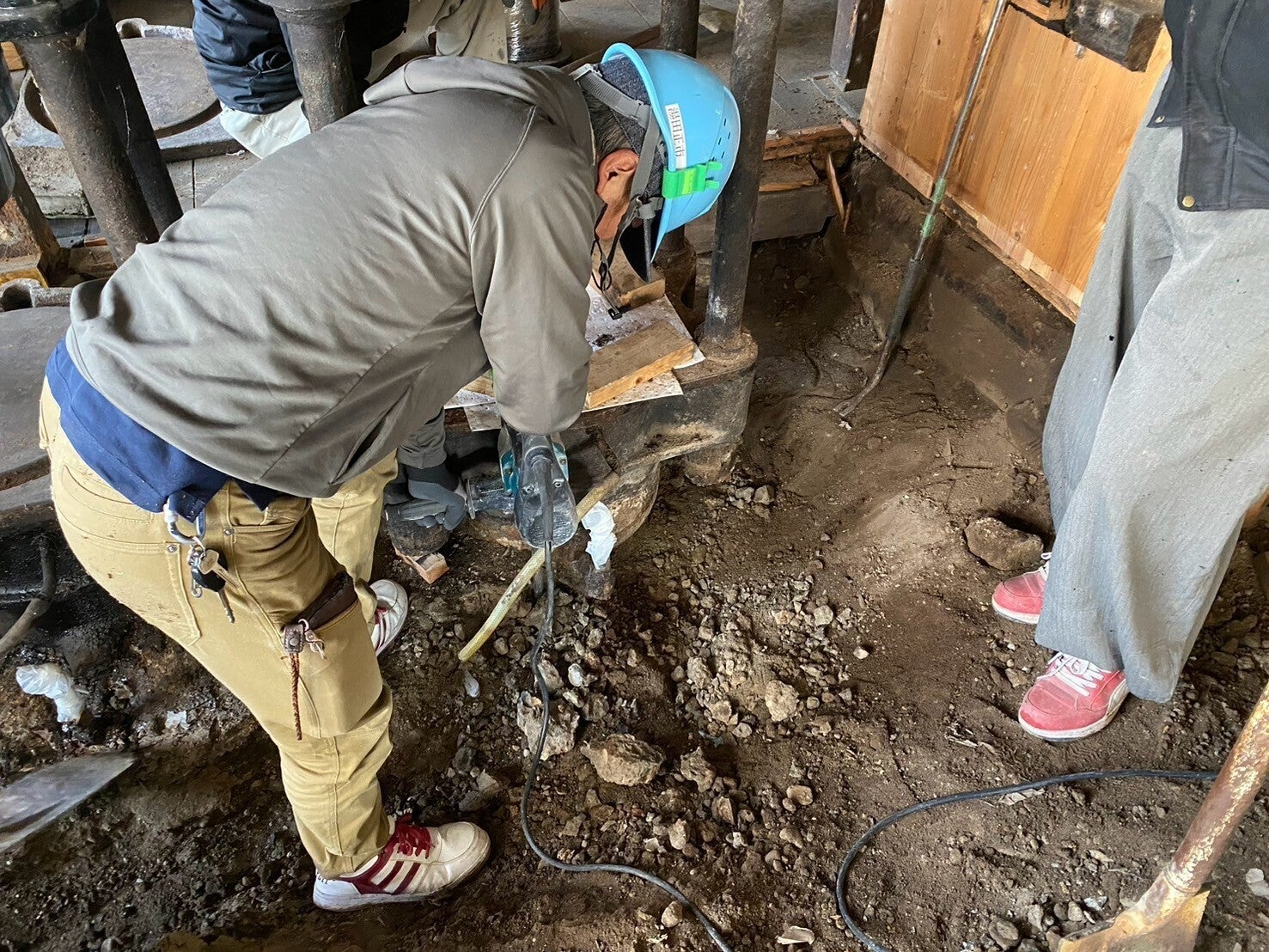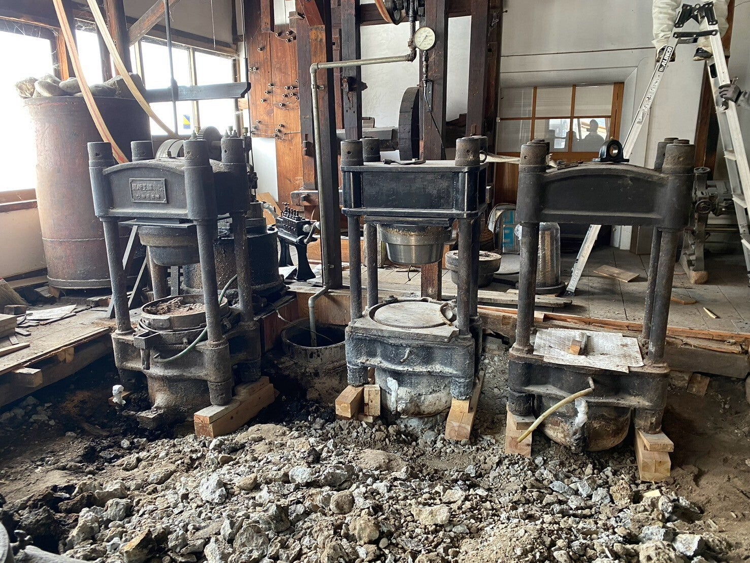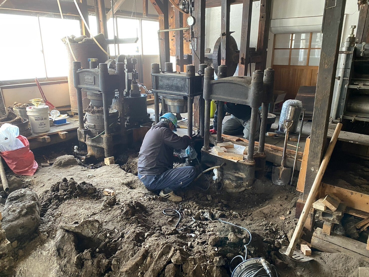 平出油屋さんの床をはがし、玉締め機の下部を調べたところ、コンクリで固めてあることがわかりました。そのため、今後運びだすためにコンクリ斫(はつ)り工事が、3/12(水)~13(木)の両日、大桃建設工業さんによって行われました。