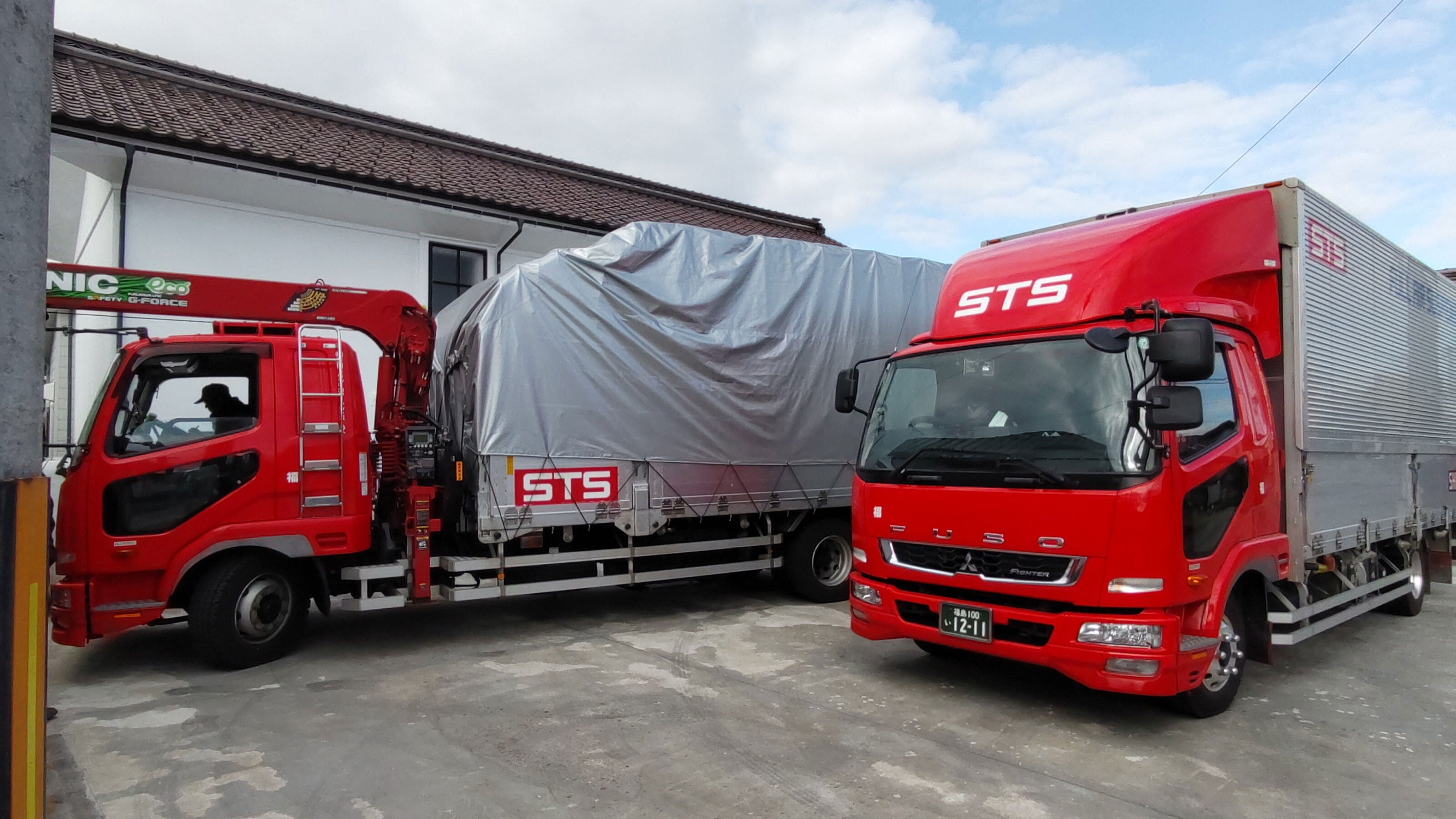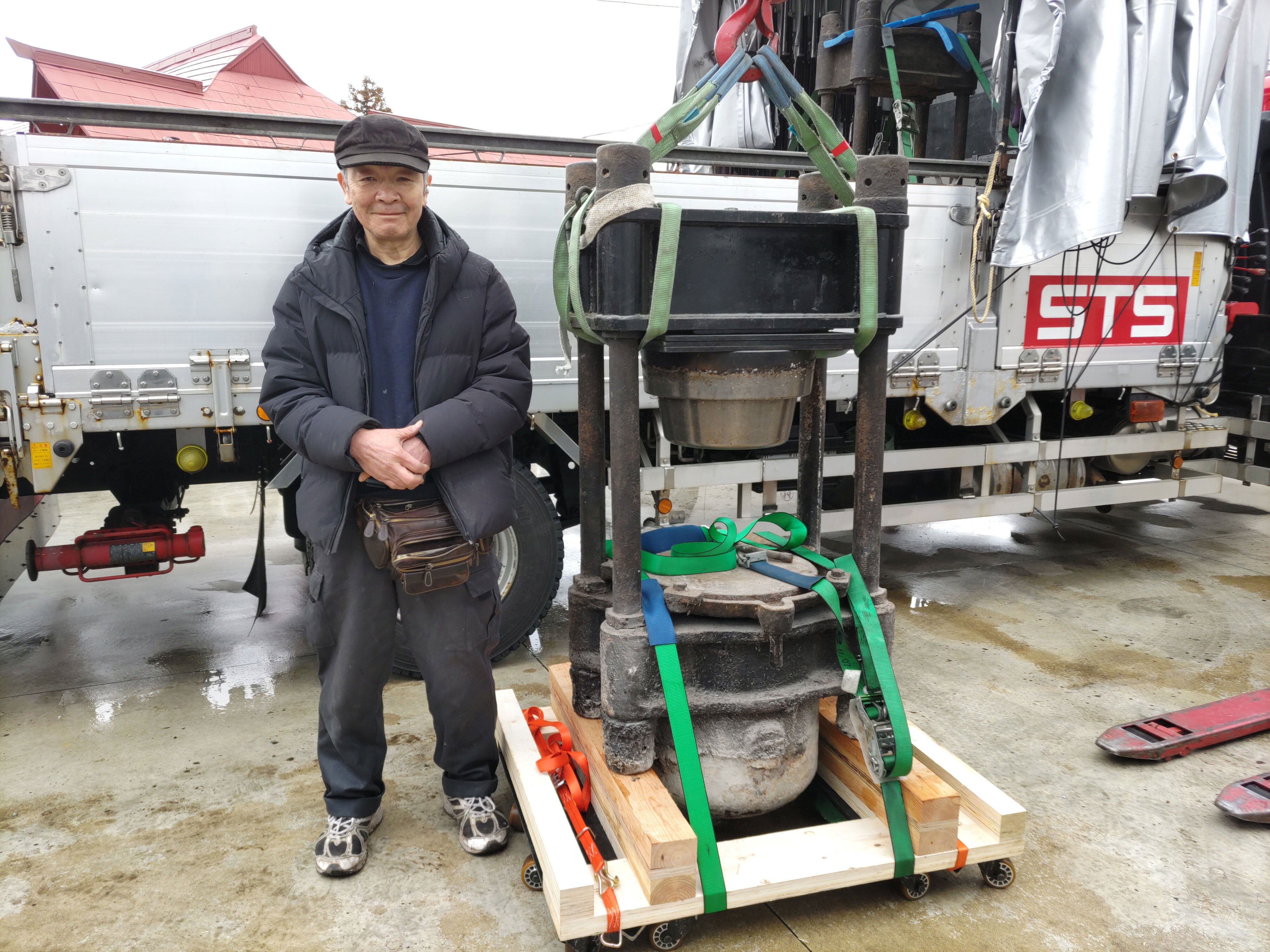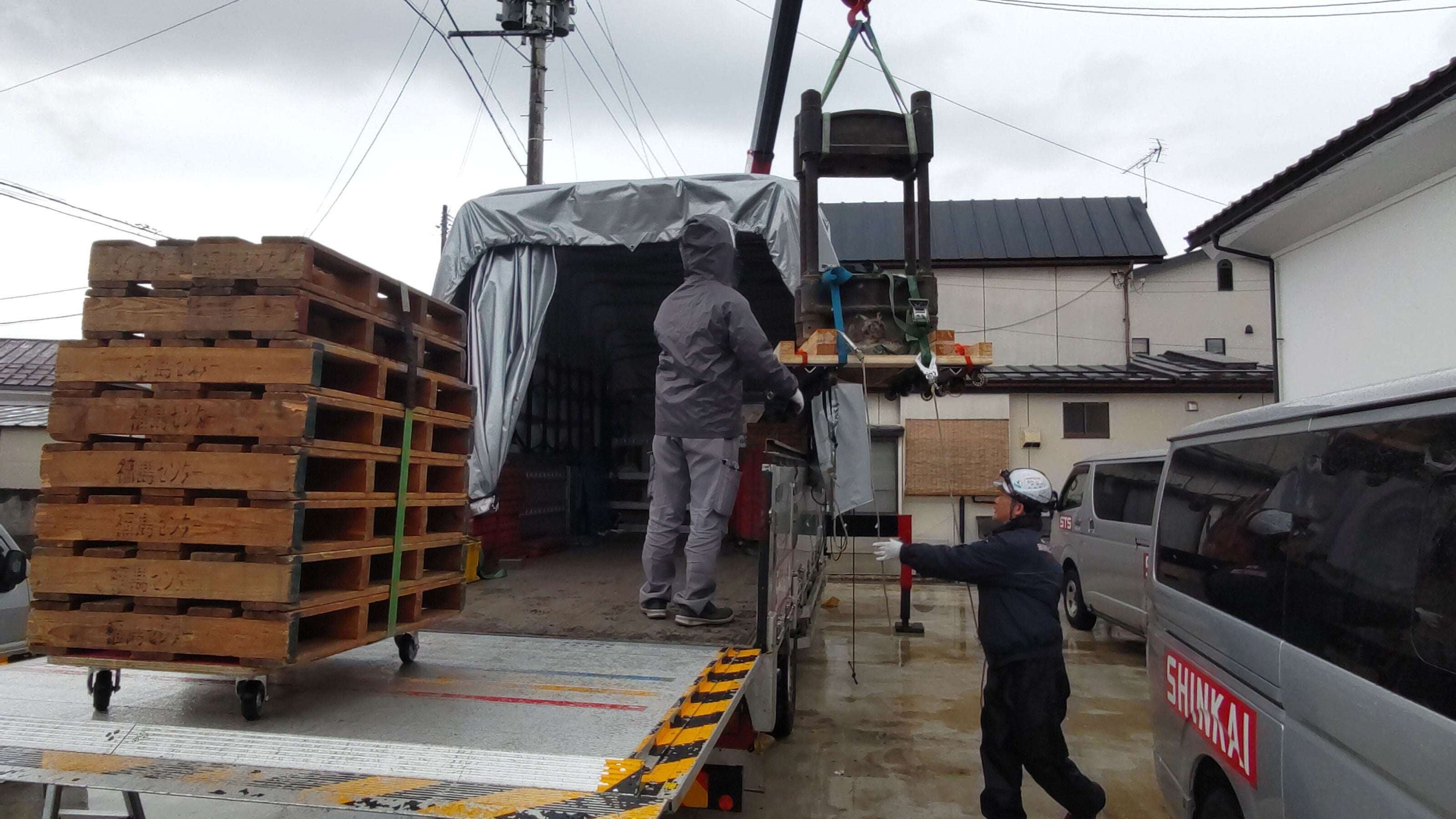 クレーンでトラックに積みます。