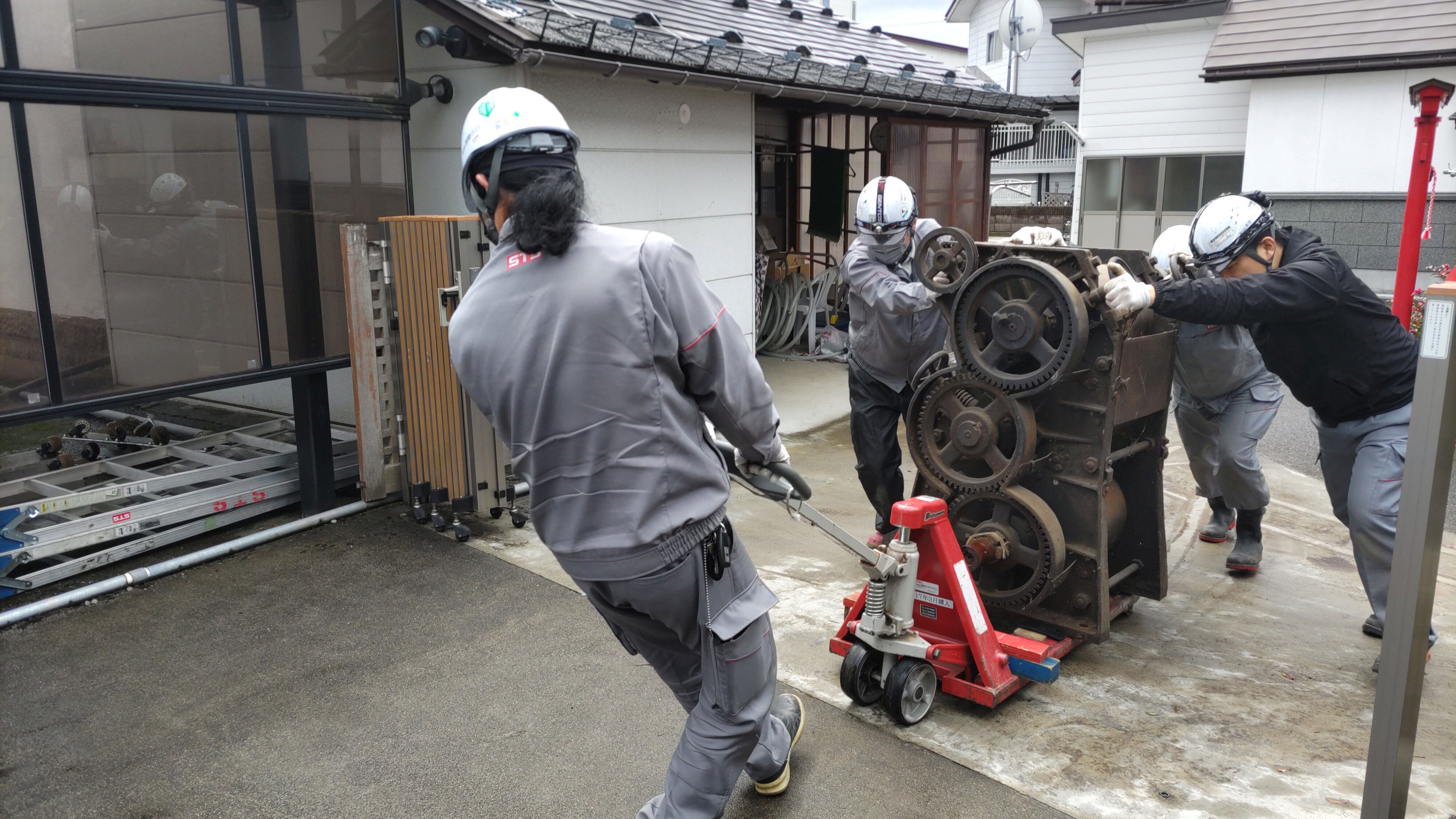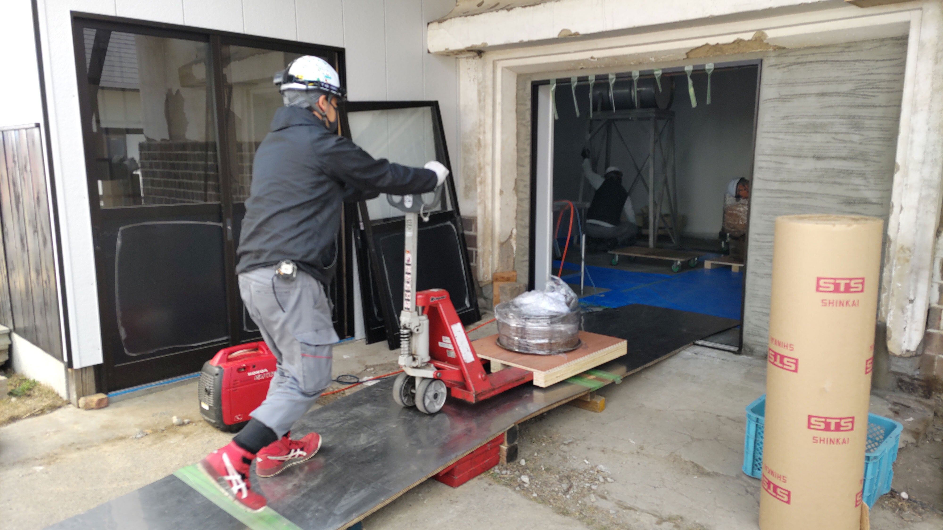 紅葉庵に搬入。重量物はハンドリフトを使います。