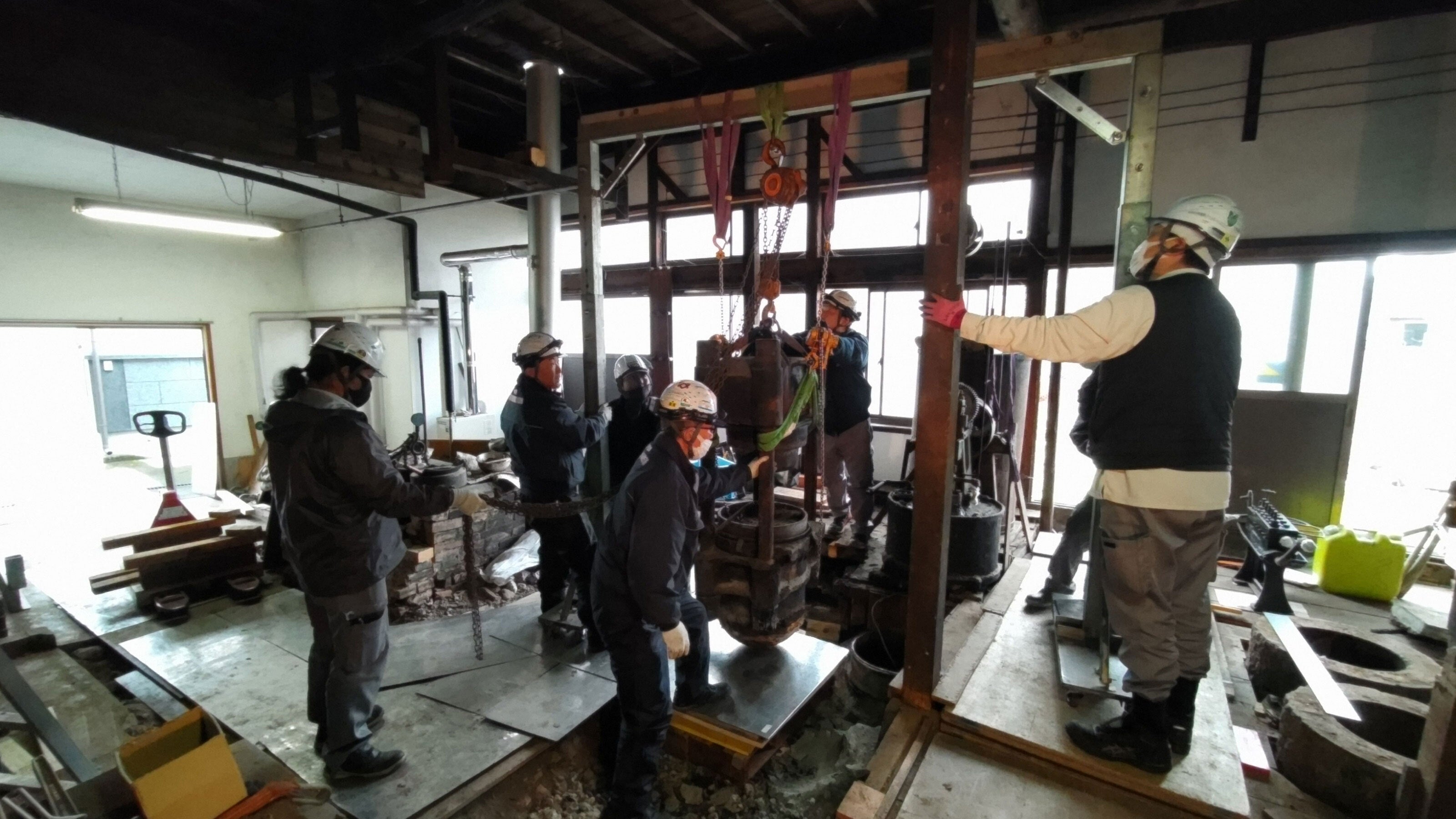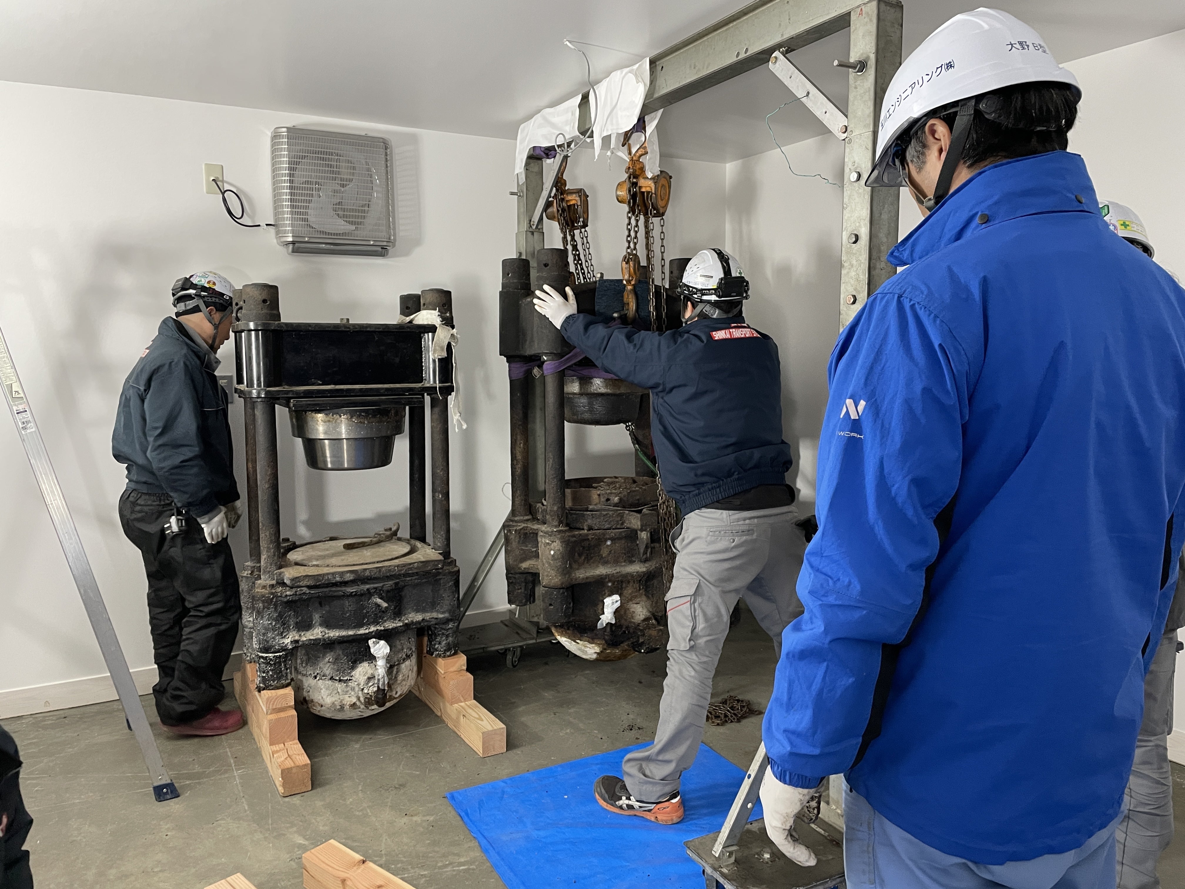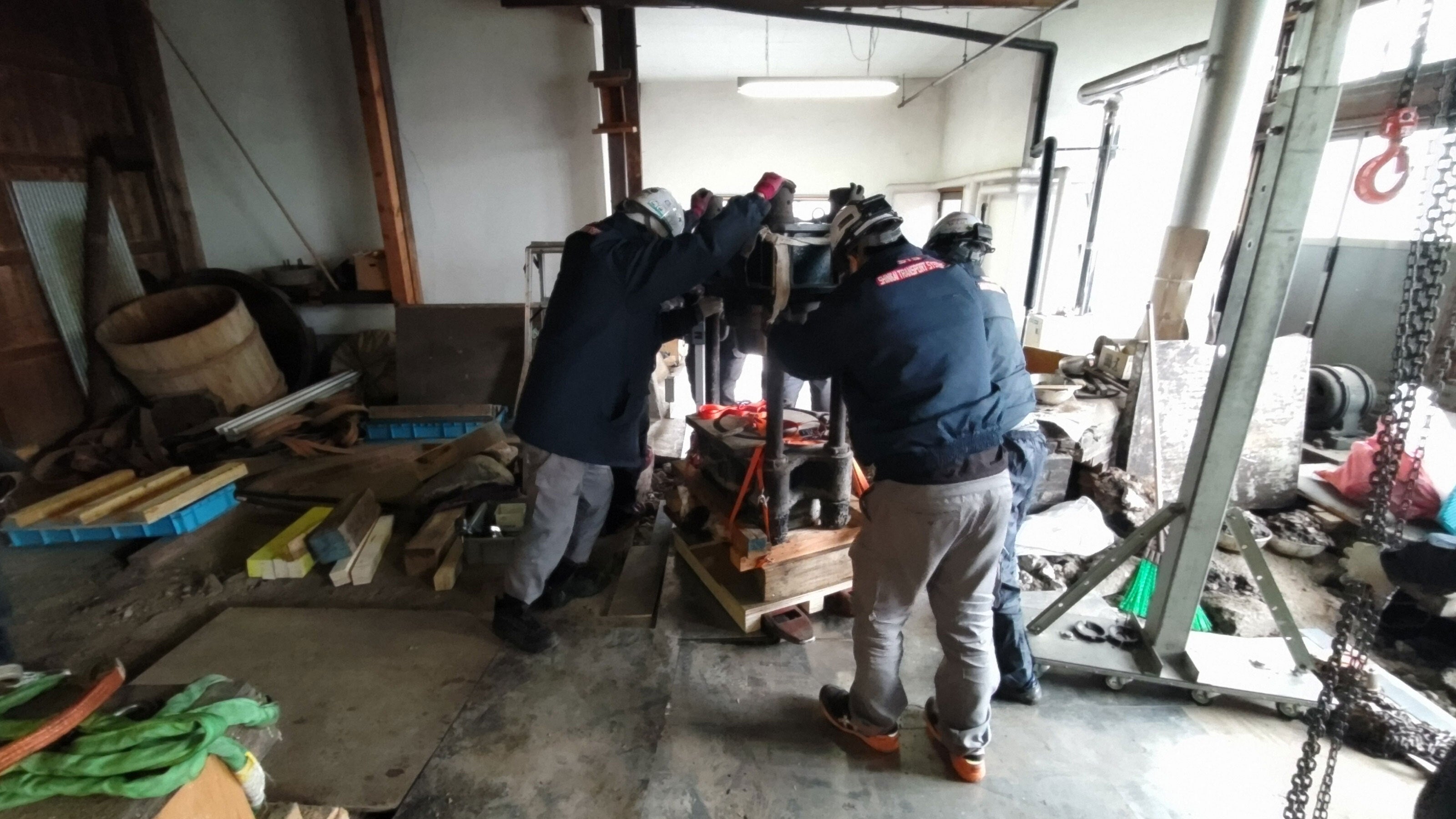 いよいよ、ご神体の玉締め機の移動です。吊り上げ用の枠を設置して、チェーンブロックで慎重に吊り上げます。