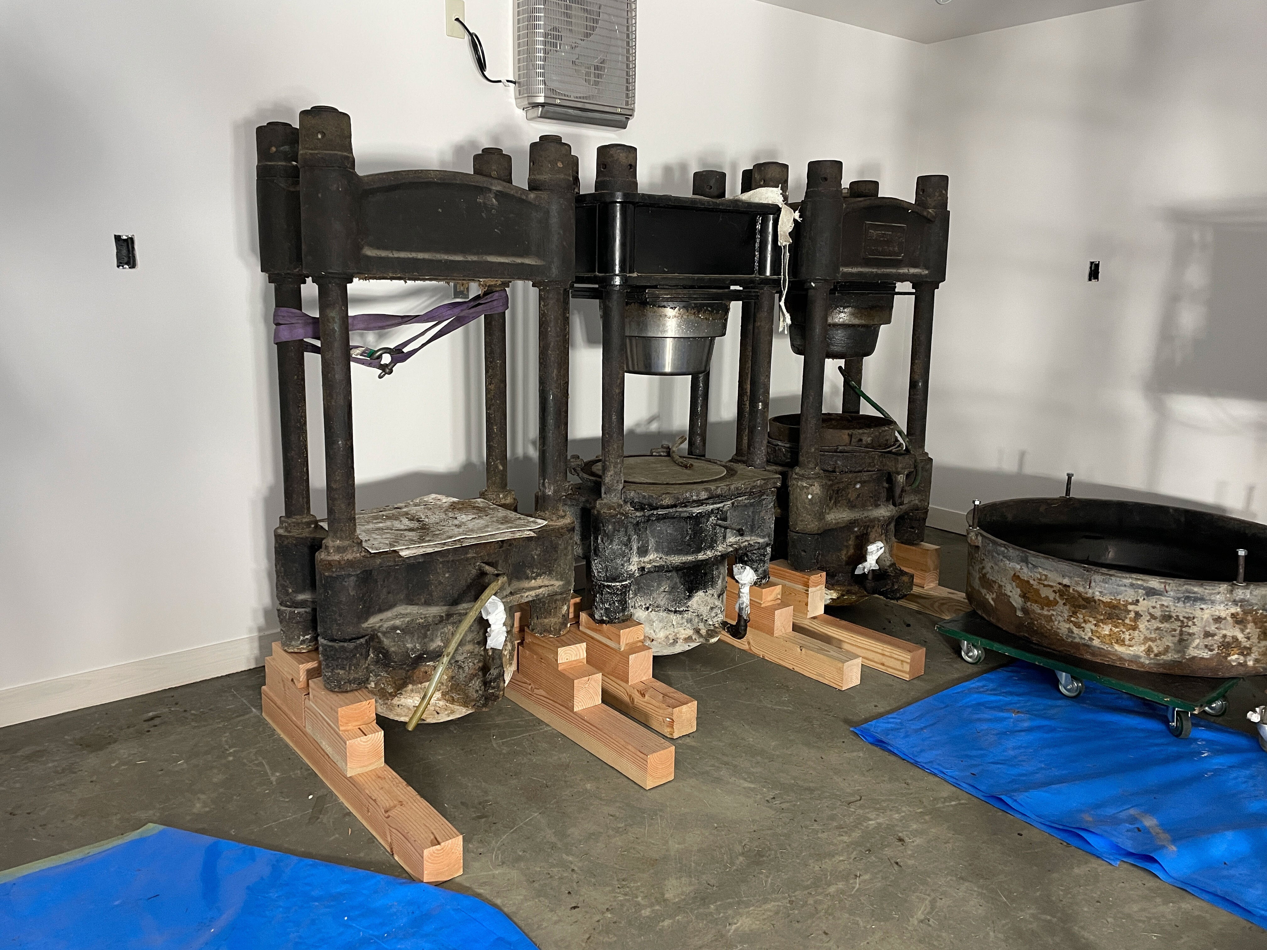 1日がかりで、3台の玉締め機の搬入が無事完了しました。右下に見える丸いのは、ナタネを炒る鉄釜です。