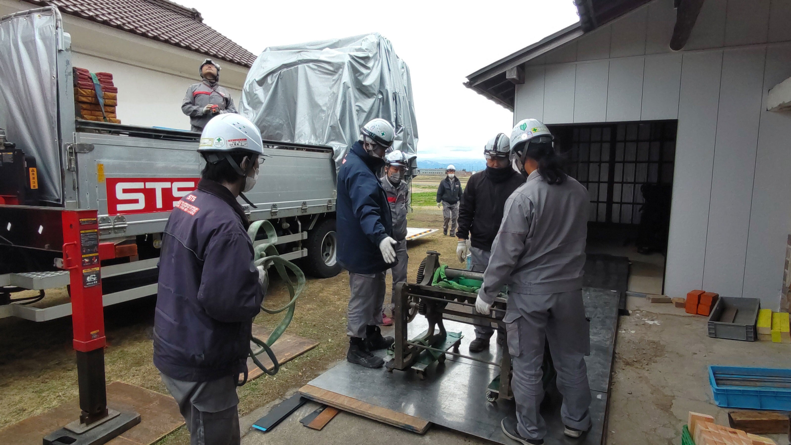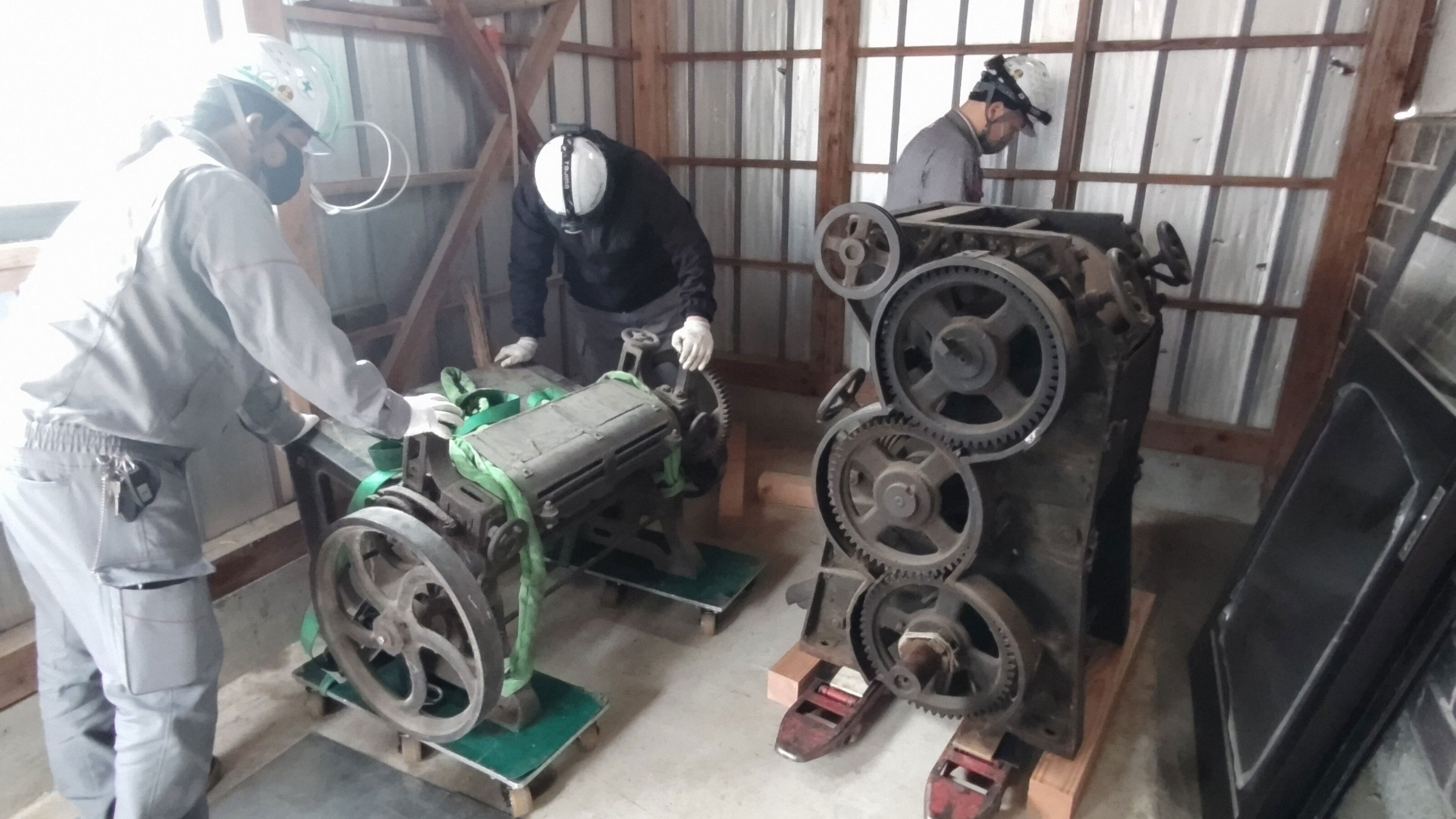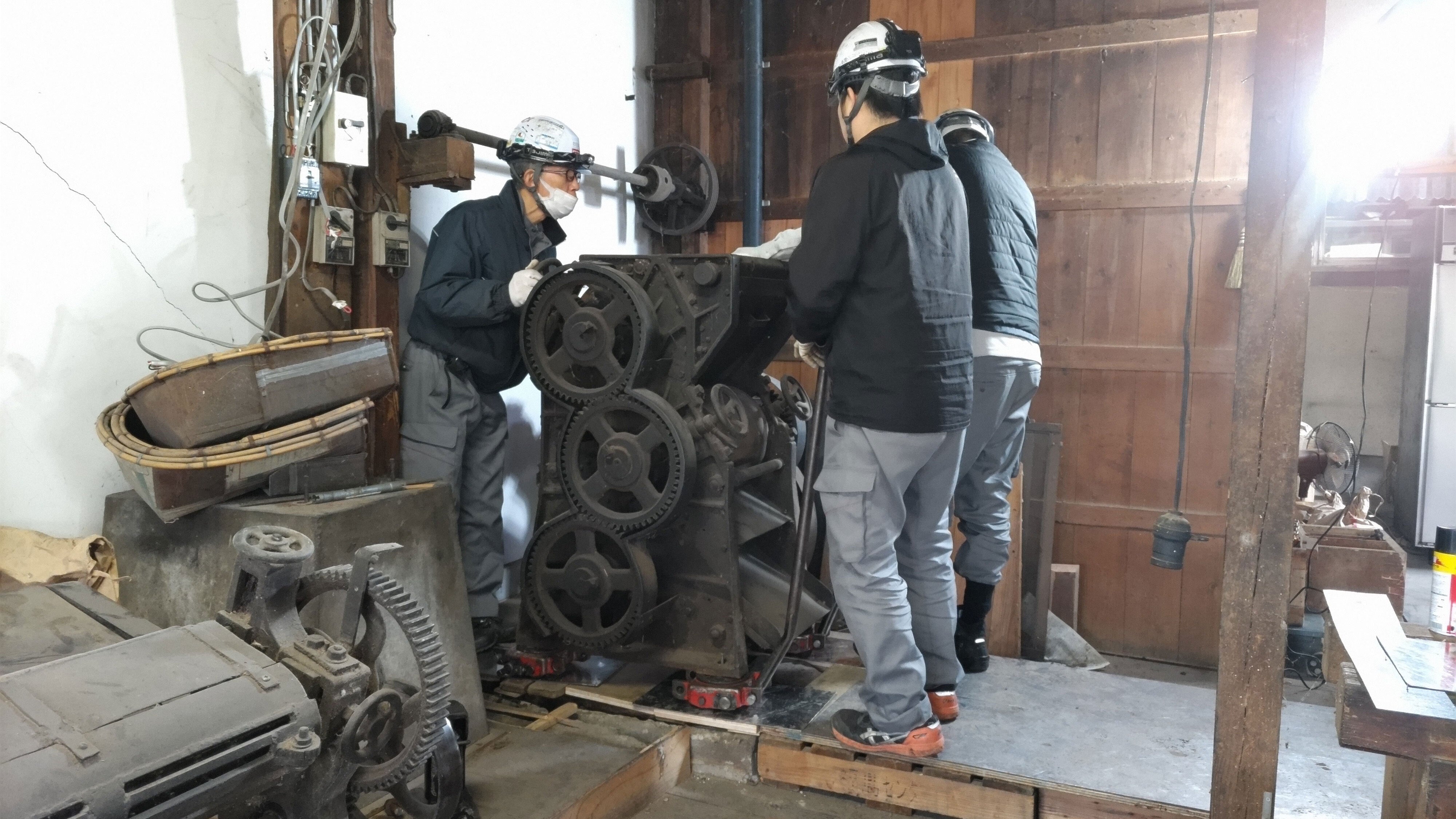 初日は、油のビンや缶への充填用タンクなどかさばるものを中心に運び出しました。玉締め機の搬出の準備のための予行演習も行われました。玉締めの「玉」など、はずせるものははずしても1トンありました。クレーンで重さが計れるとは知りませんでした。