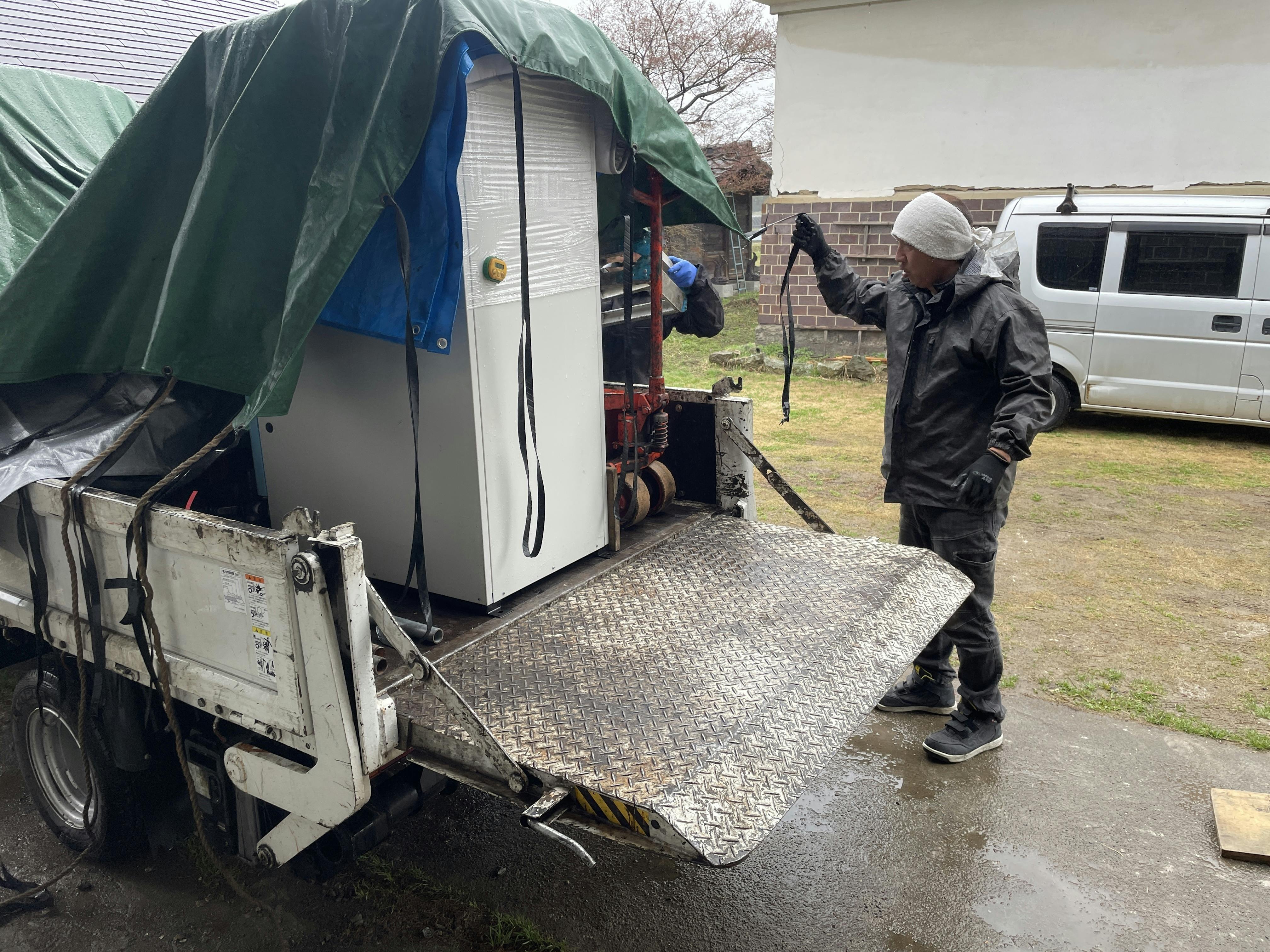 ナタネを蒸すための蒸気ボイラーの設置工事が行われました。豆腐屋でいつもお世話になっている埼玉の業者さんが、状態のよい中古品を持ってきてくれました。