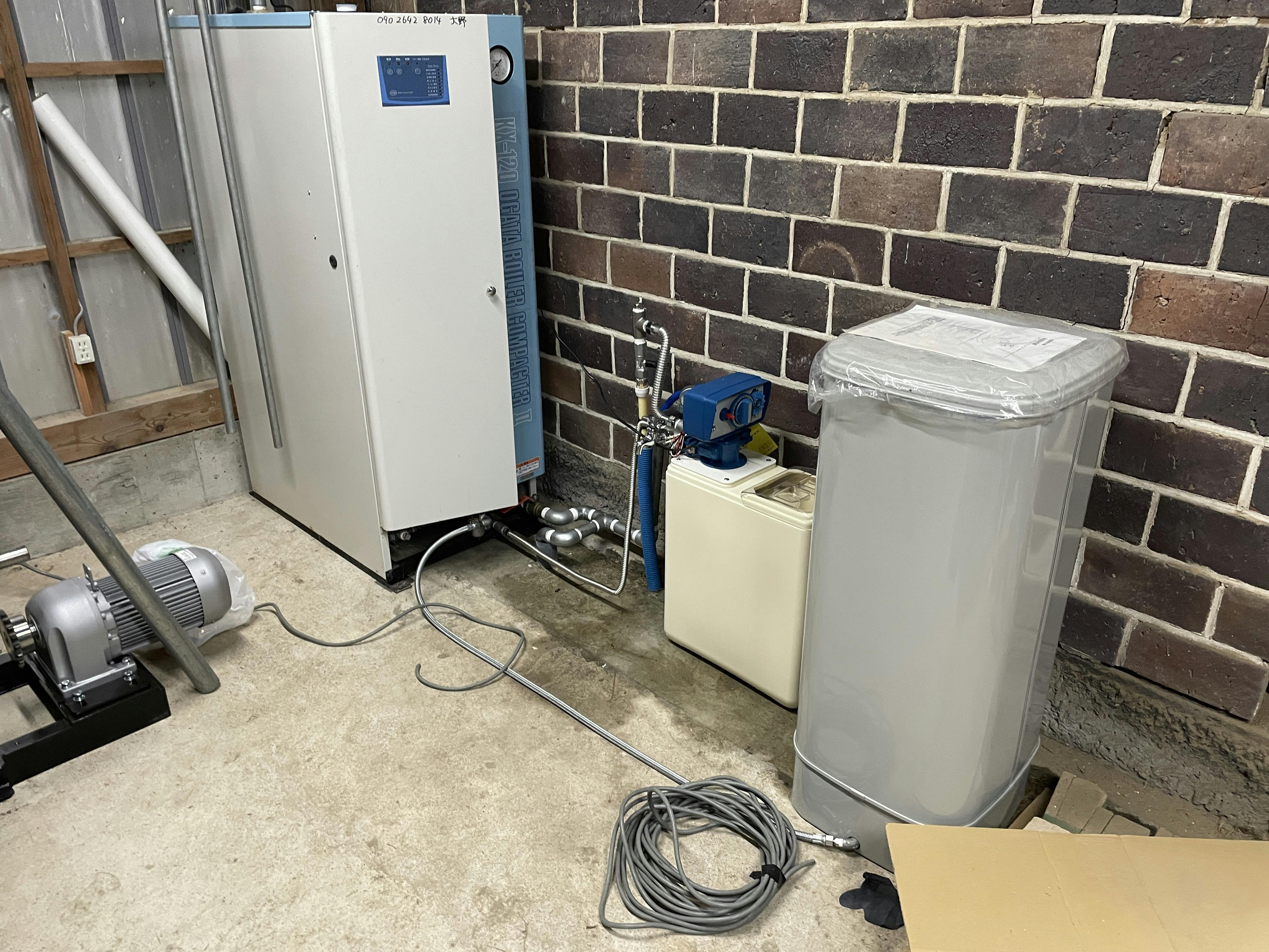 ボイラーの設置完了 奥からボイラー本体、軟水器(水道水からミネラル分を除去)、灯油タンク。蔵の隣の下屋に設置してもらいました。