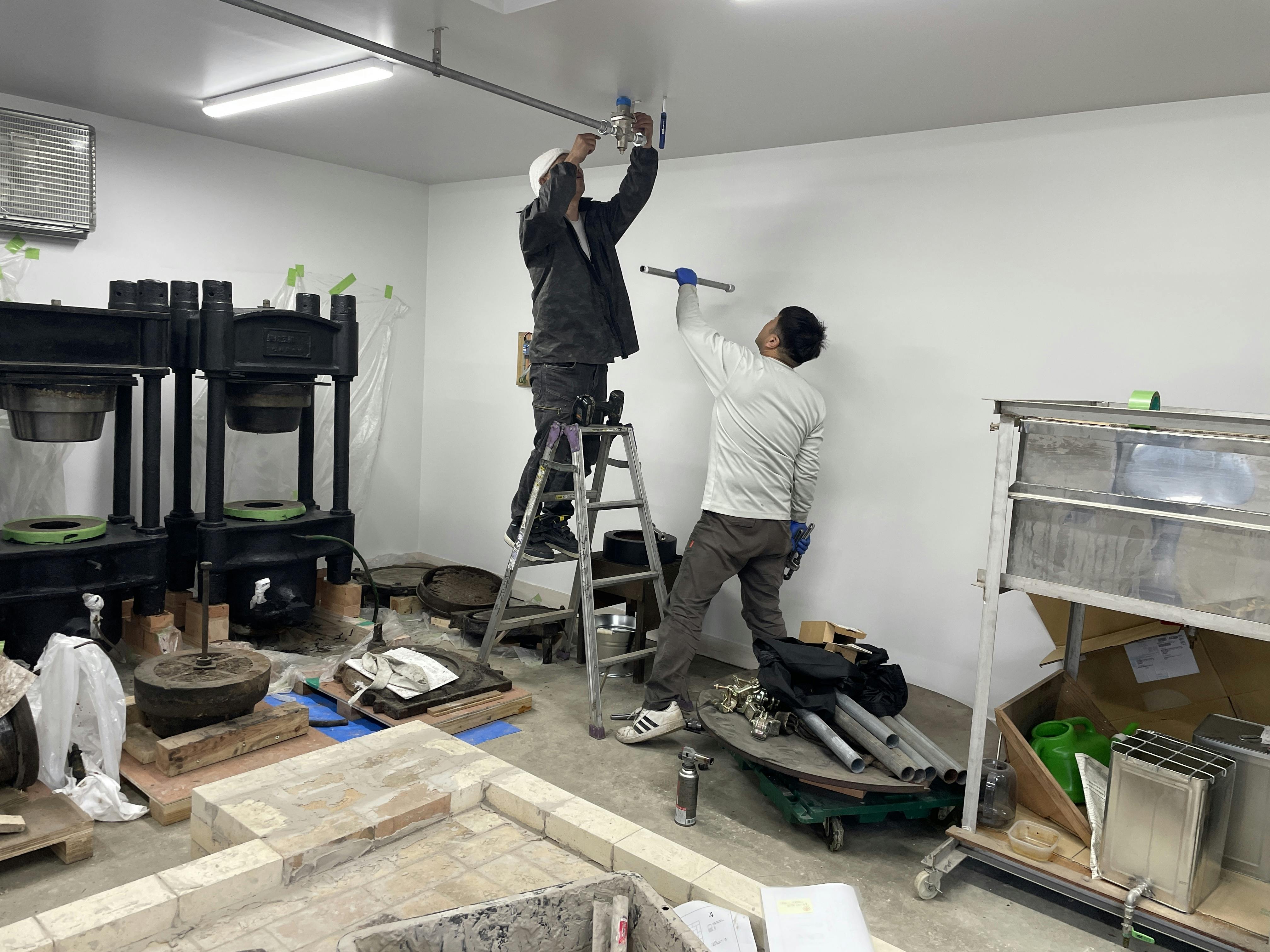 4/13(土)から4/19(土)の間に、焙煎炉の組み立ての続き、ボイラーの設置工事、焙煎炉用の煙突の屋根部分の工事、玉締め機のパッキン取り付け、など沢山の工事がありました。作業別に報告します。