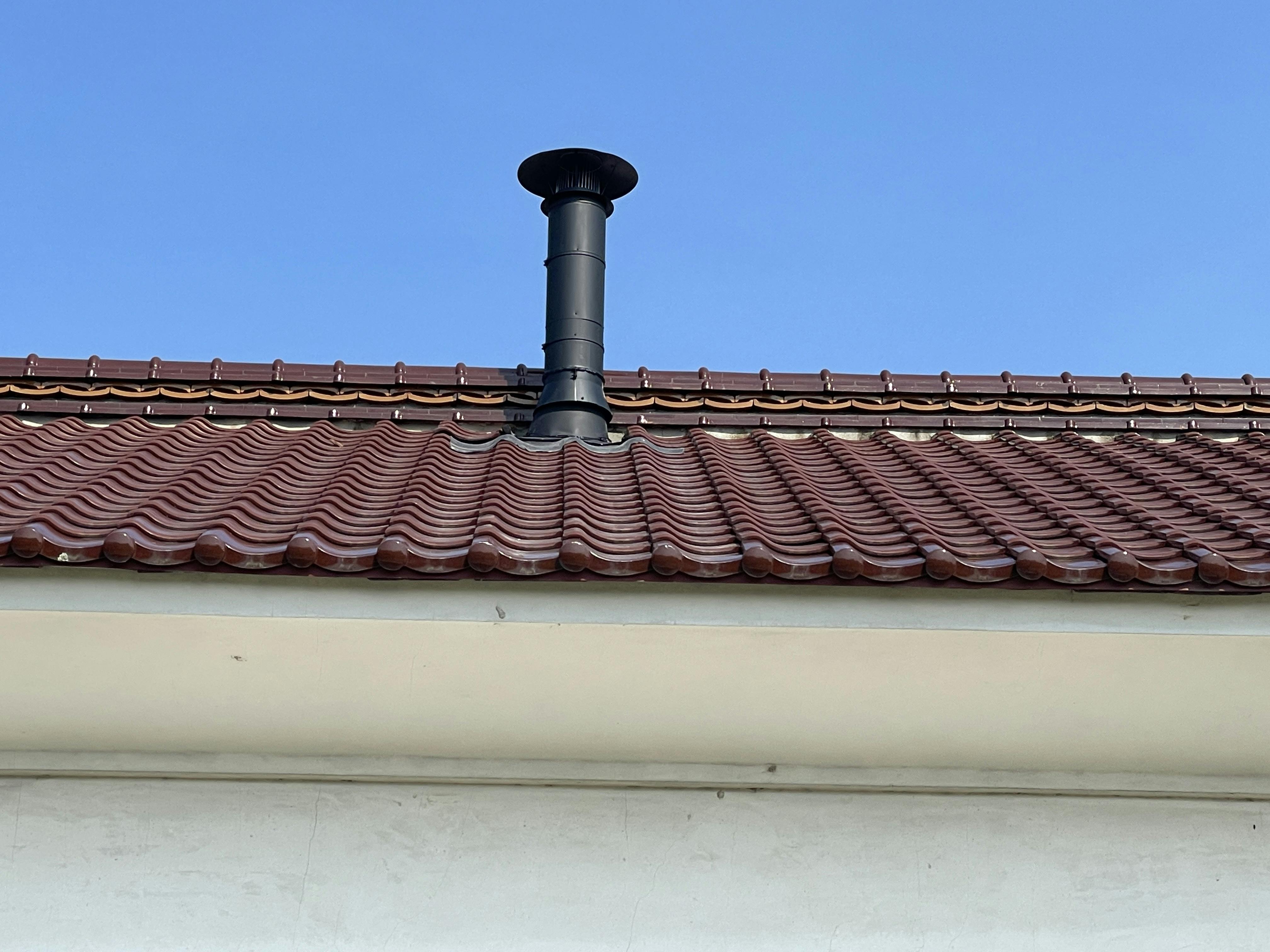 おしゃれな煙突トップ(最上部)がつきました。下は焙煎炉ができてから。