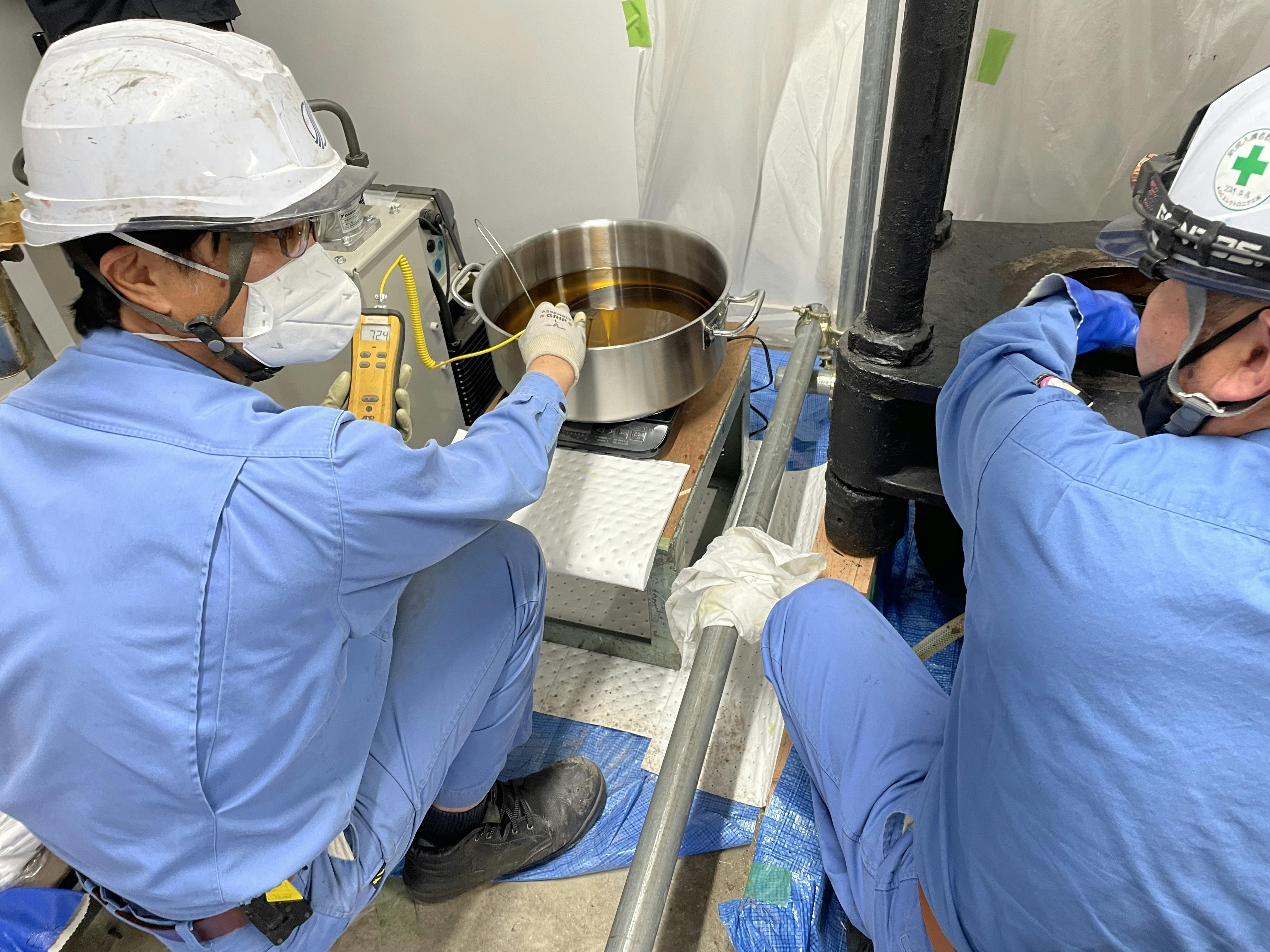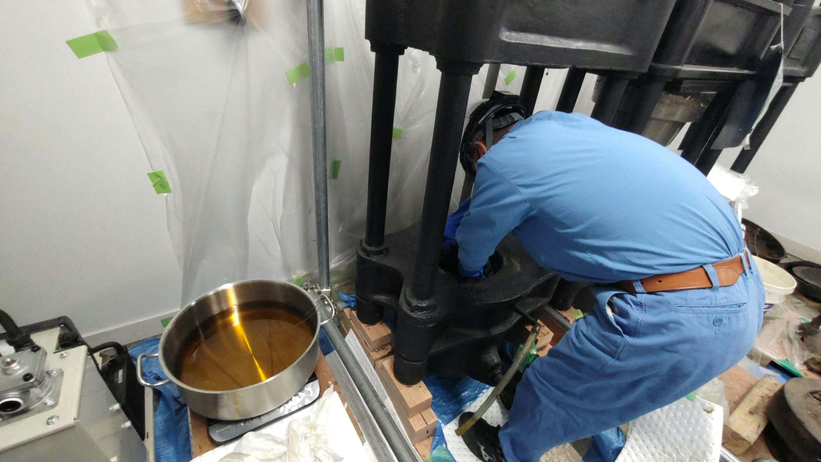 玉川エンジニアリングさんにより、玉締め機に新しく新調した牛革製のパッキンを取り付けてもらいました。常温ではプラスチックのようにカチカチなので、温めた菜種油に入れて柔らかくします。