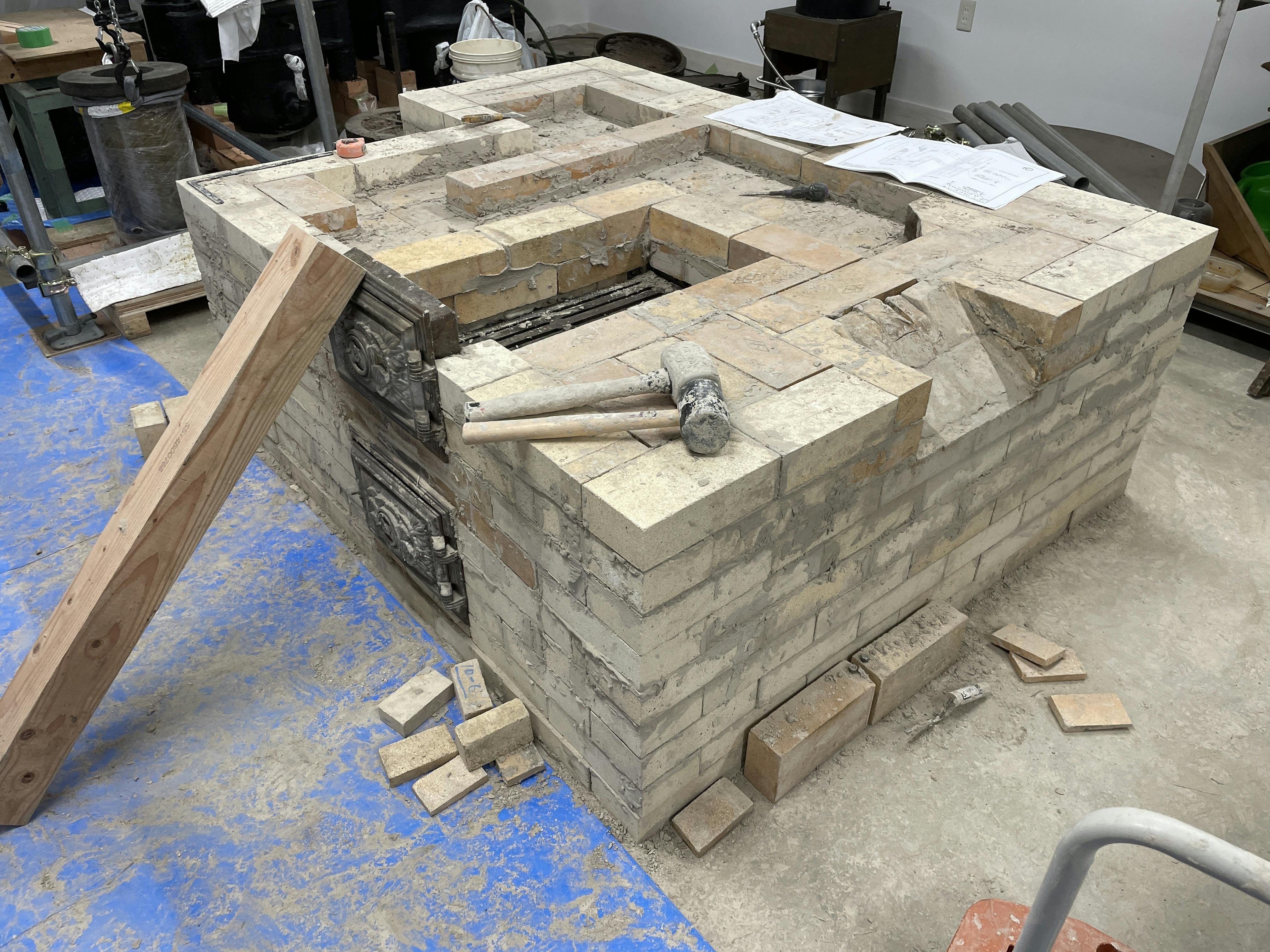 4/19(土) ぐるぐるしたへこみは、煙道です。11段目完成。この上に釜を載せて、まわりを埋めるようにレンガを積んでいきます。