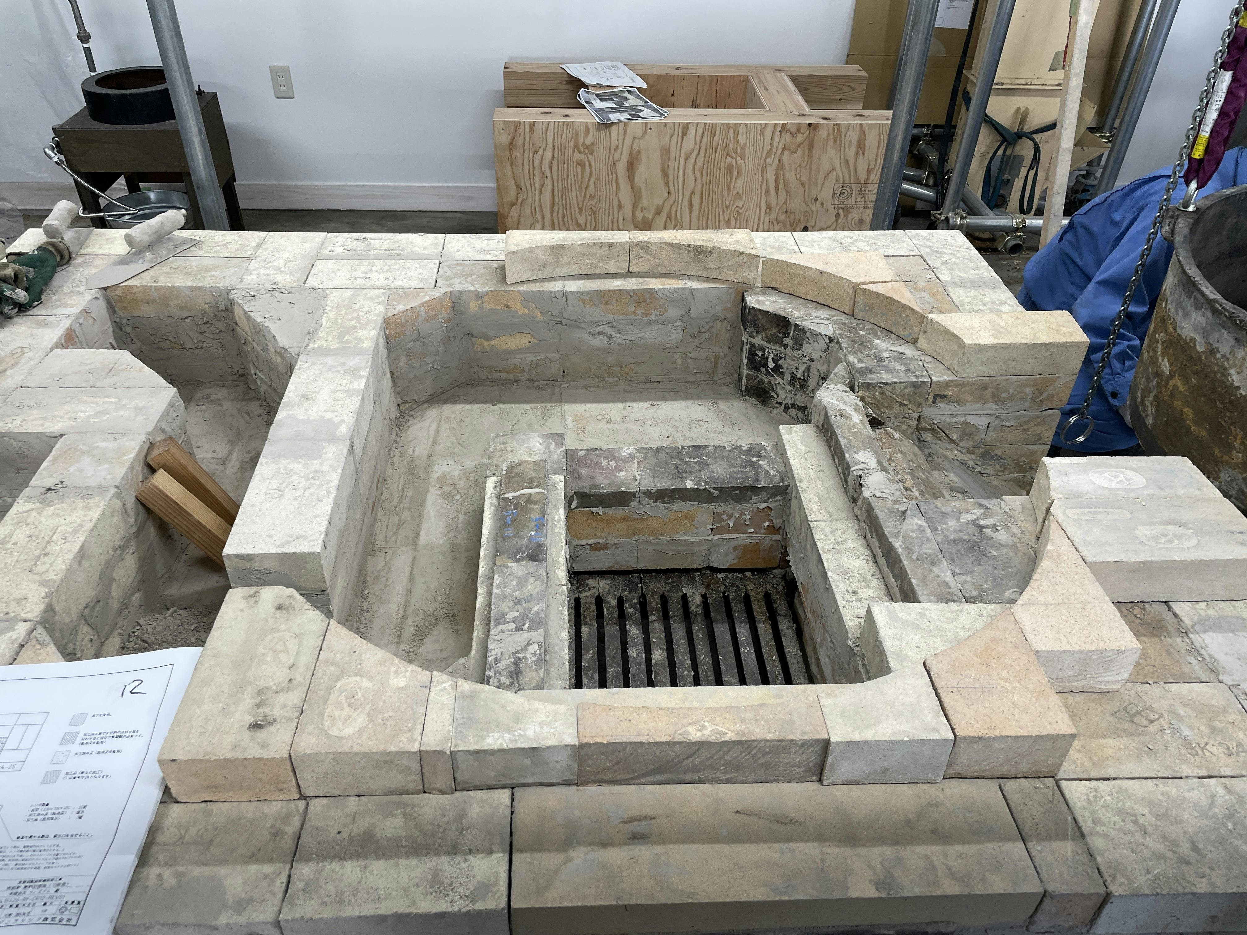 まず、釜の周囲にくるレンガを並べてみます。
