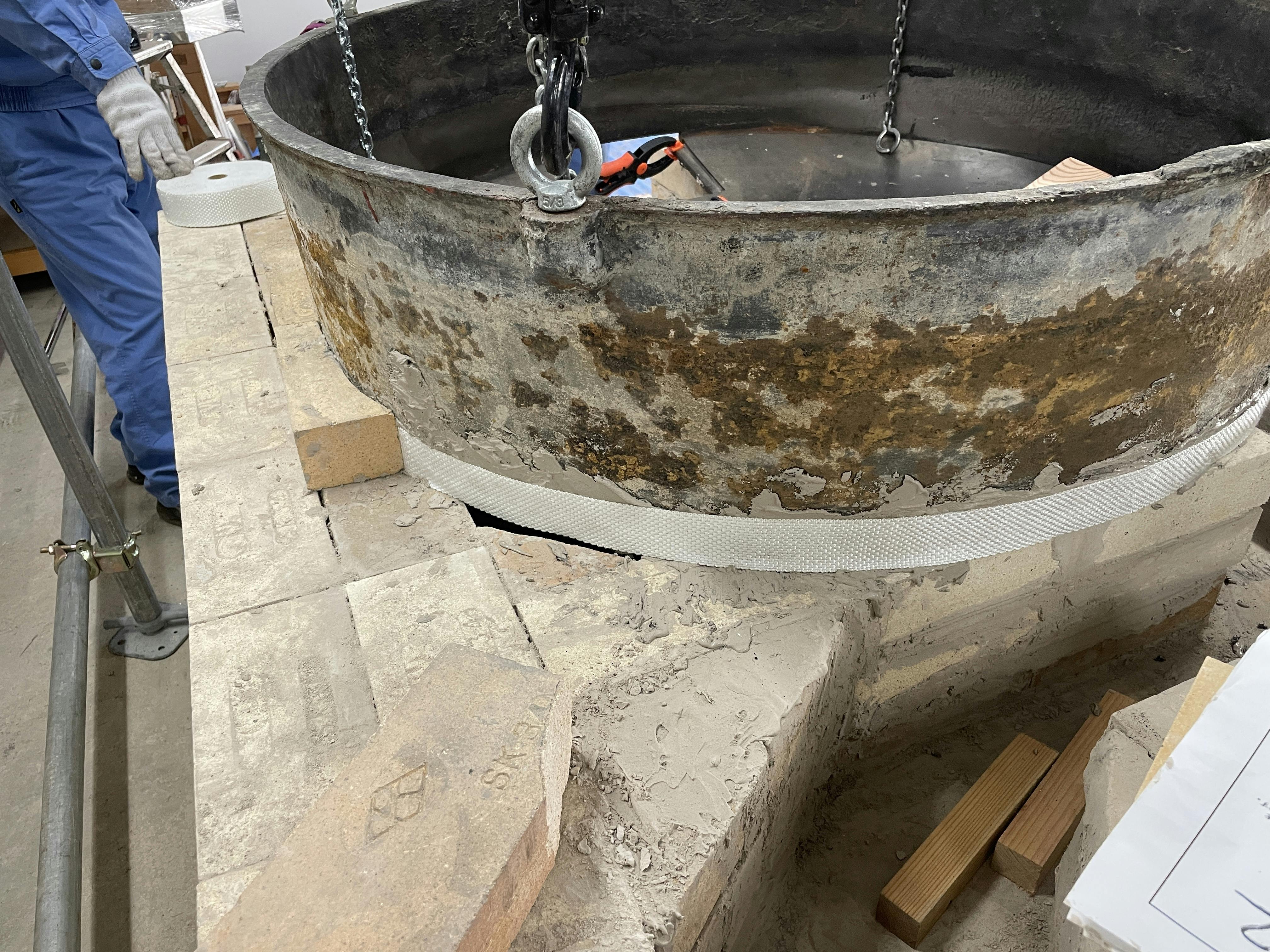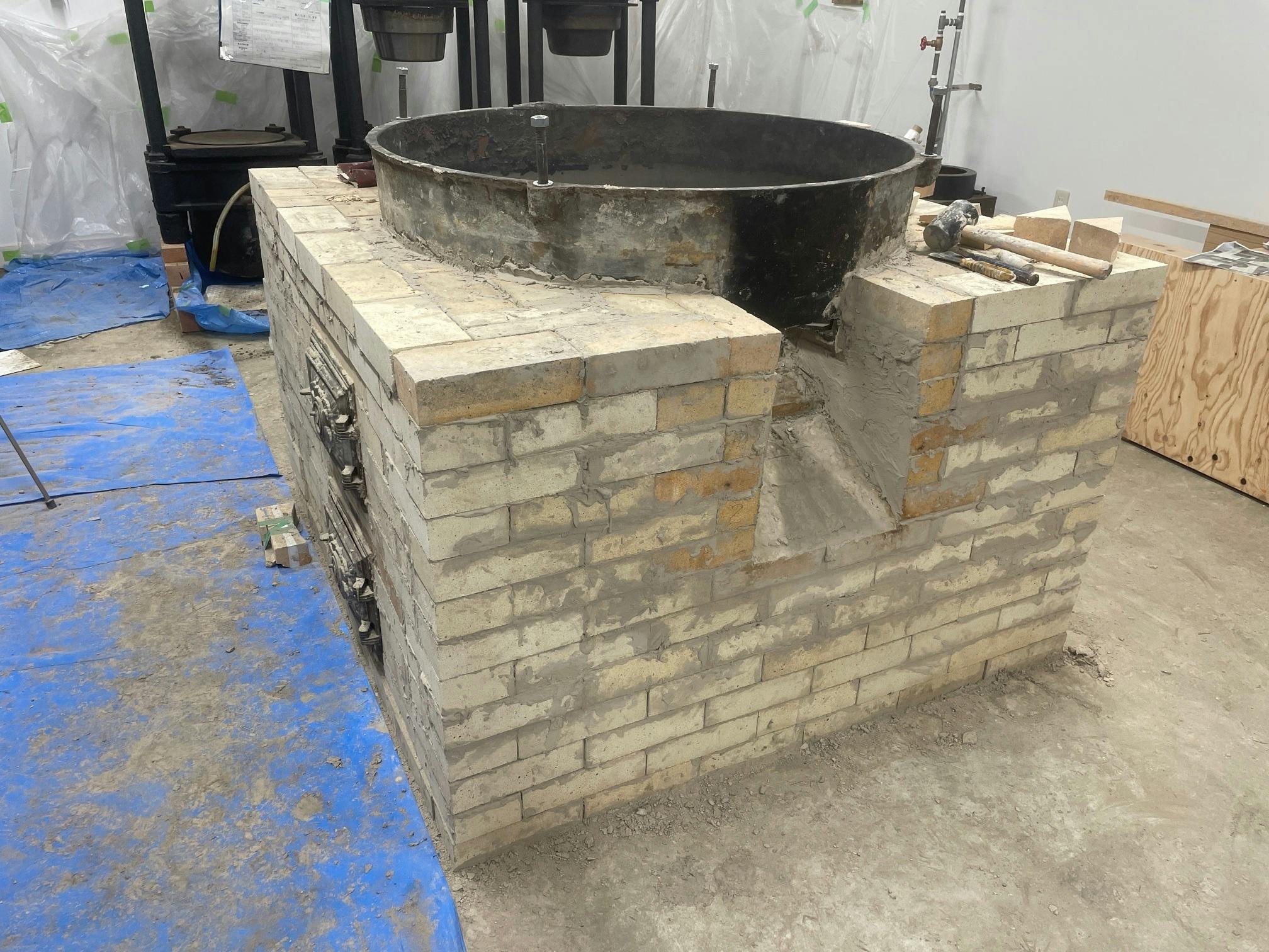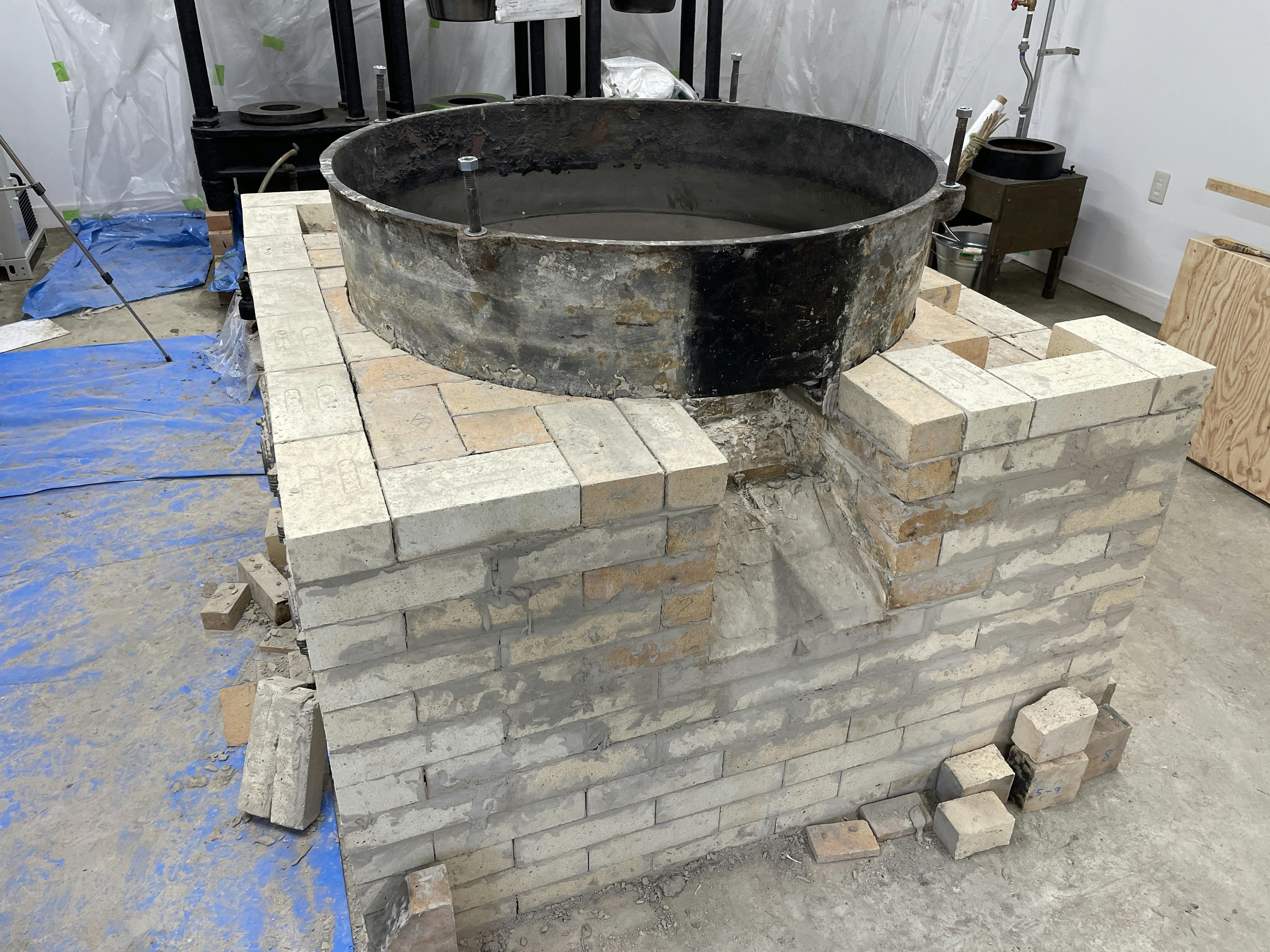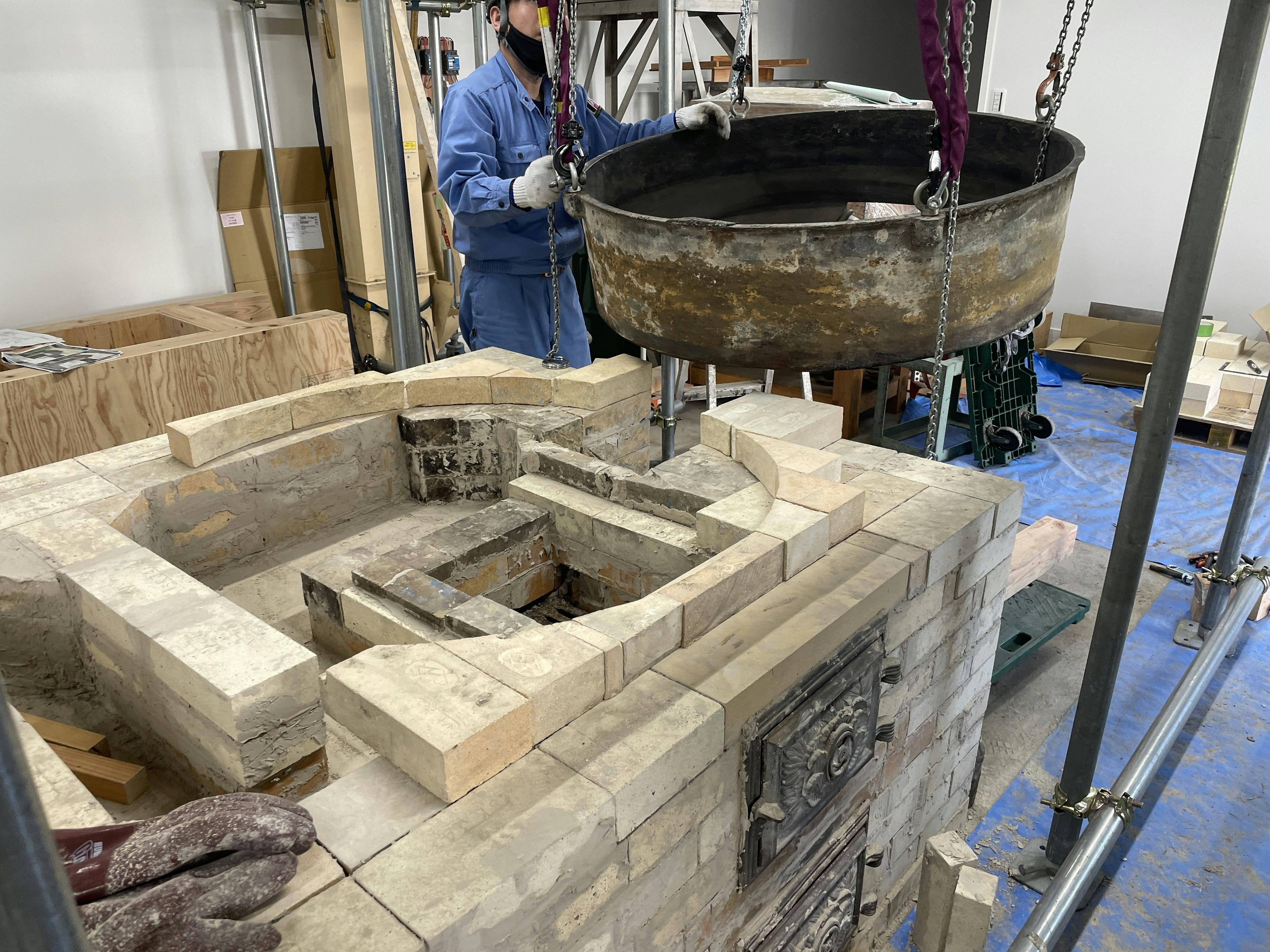 レンガが11段目まで完了したところで、鉄釜を載せました。玉川エンジニアリングさんのご協力により、準備に半日以上かけての大仕事でした。
