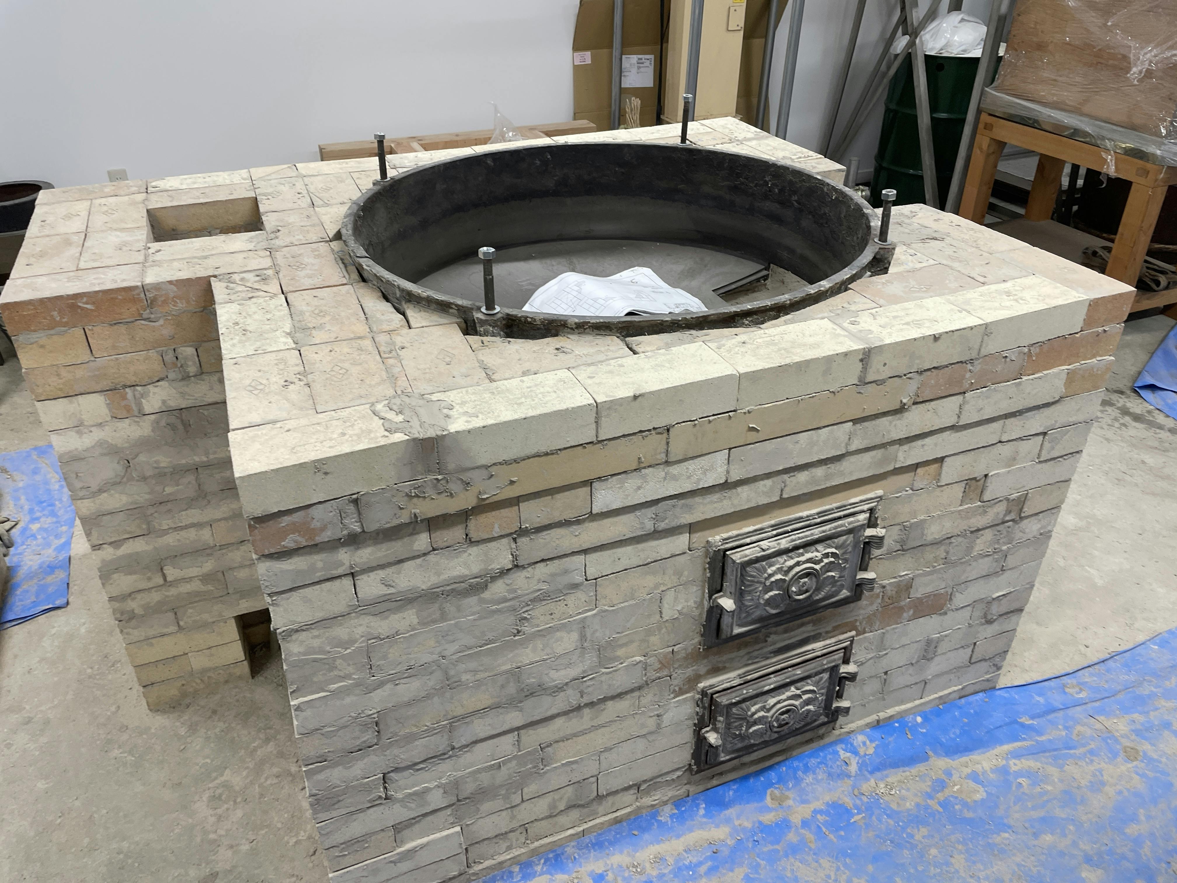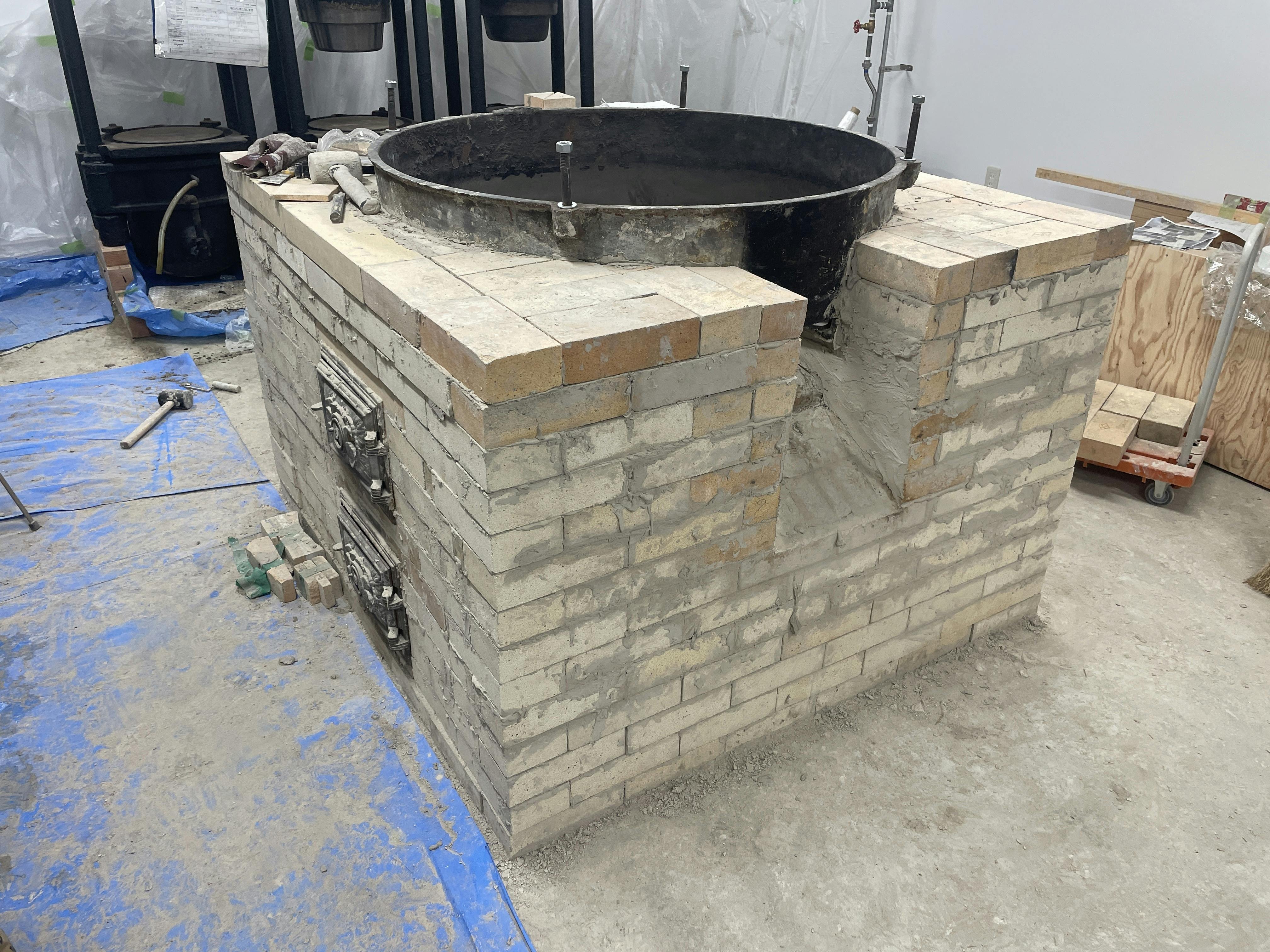 4/29(火)、最後の15段目にとりかかる。鉄釜に合わせてレンガをグラインダーでカットしたり削る作業が結構大変でした。豆腐屋がレンガ職人に。