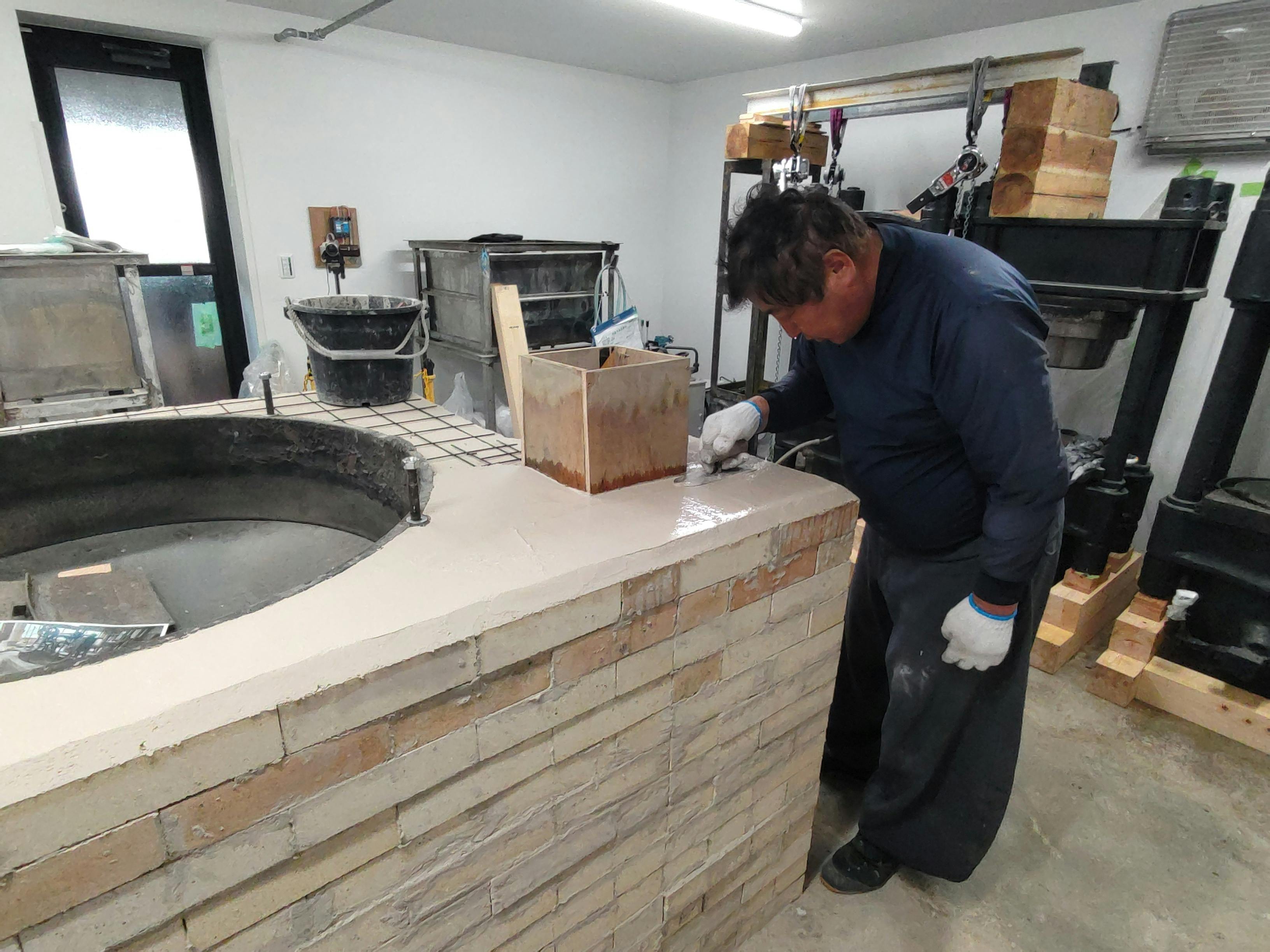 プロの左官屋さんに焙煎炉上部をモルタルで仕上げてもらいました。