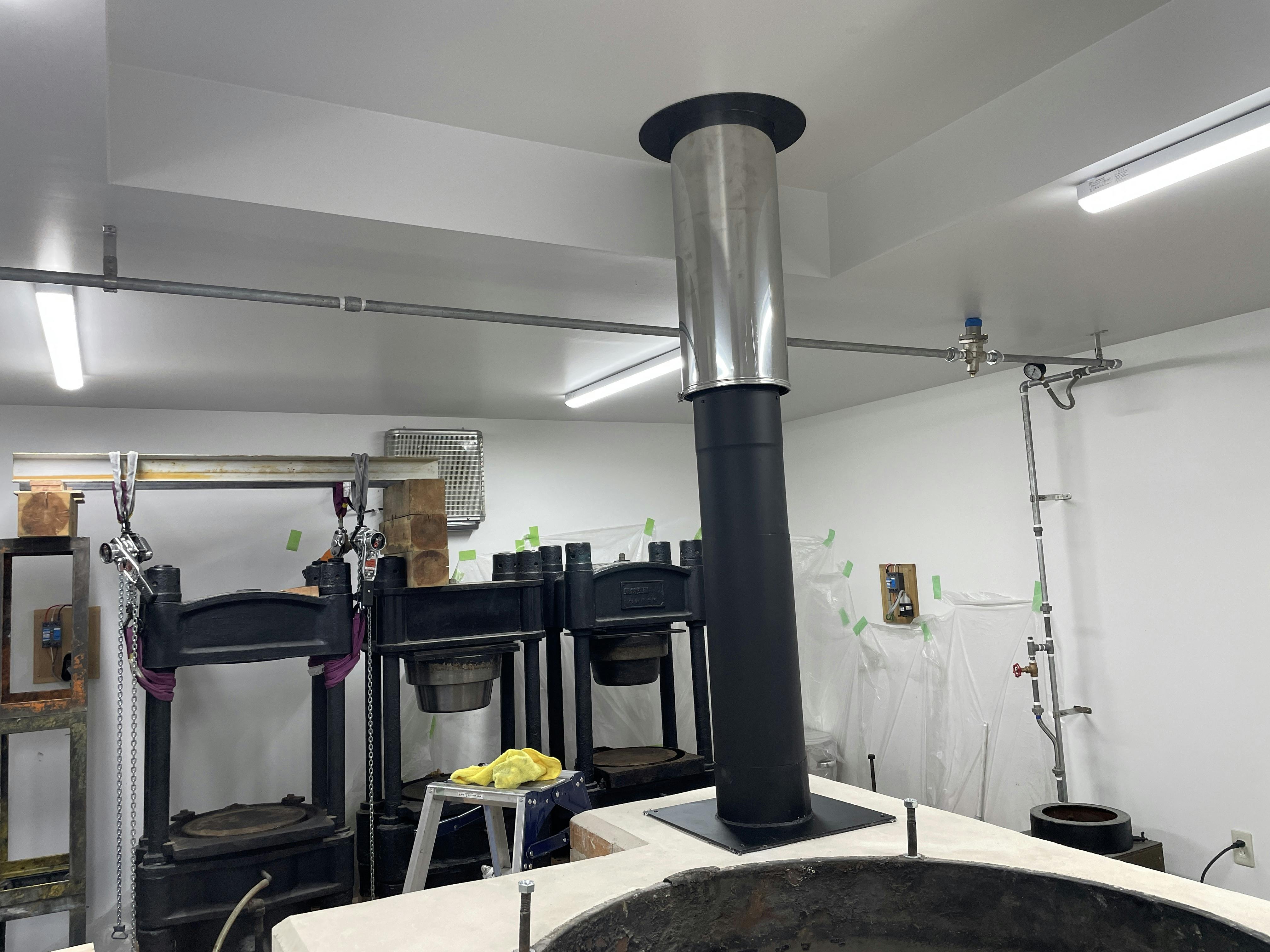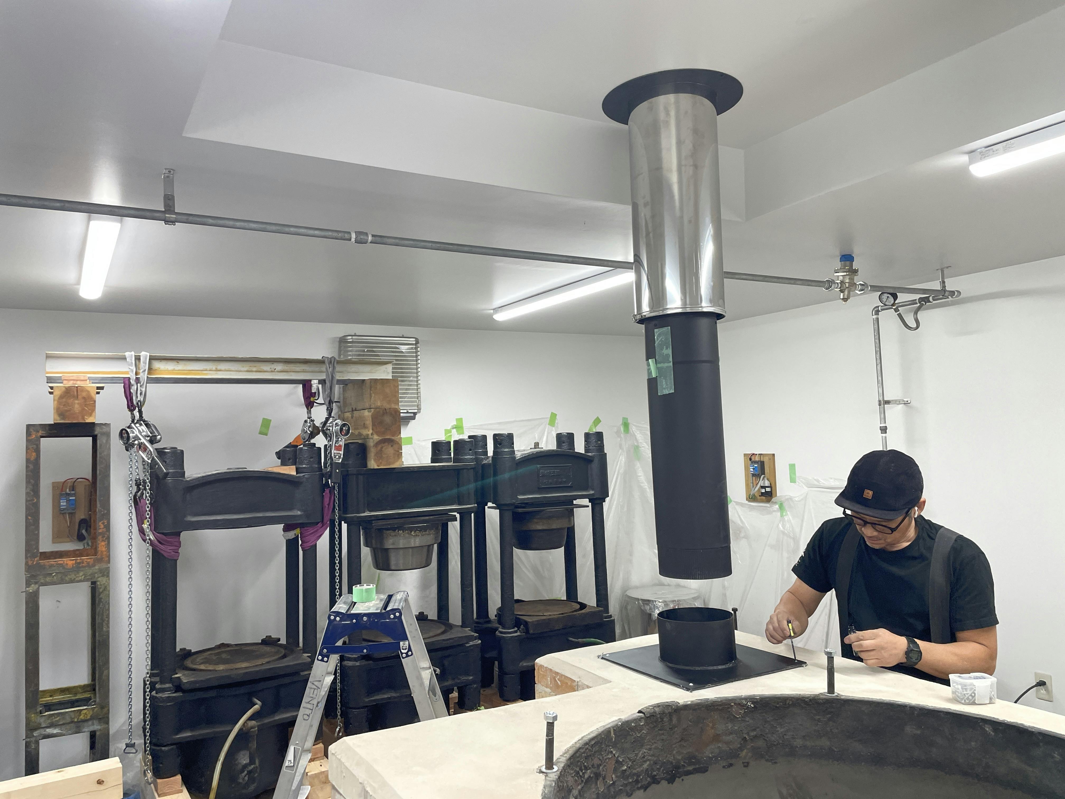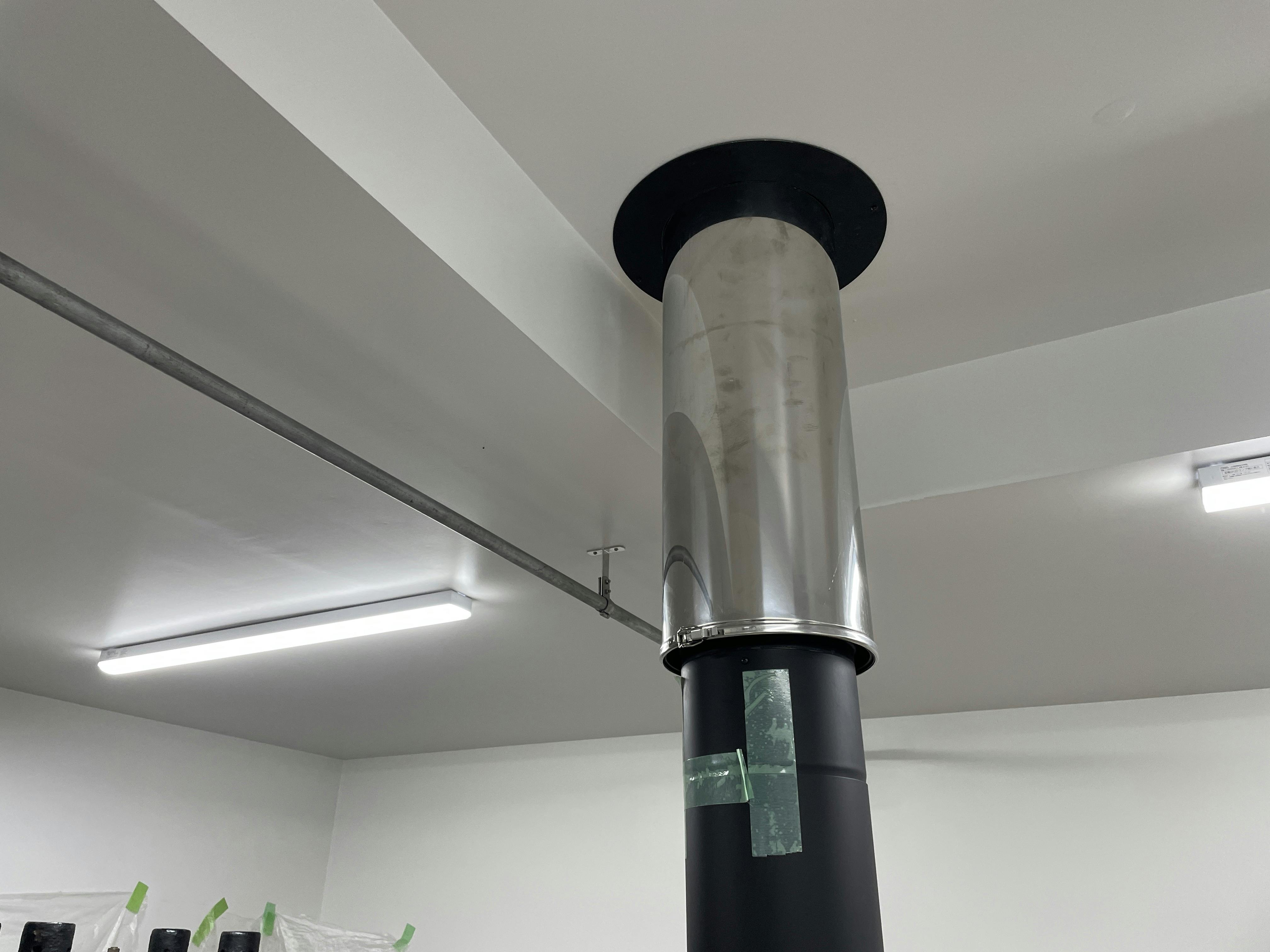 すでに煙突工事は屋根の上から天井まで完了していましたが、焙煎炉の上部モルタル仕上げが終わったので、焙煎炉との接続工事が行われました。