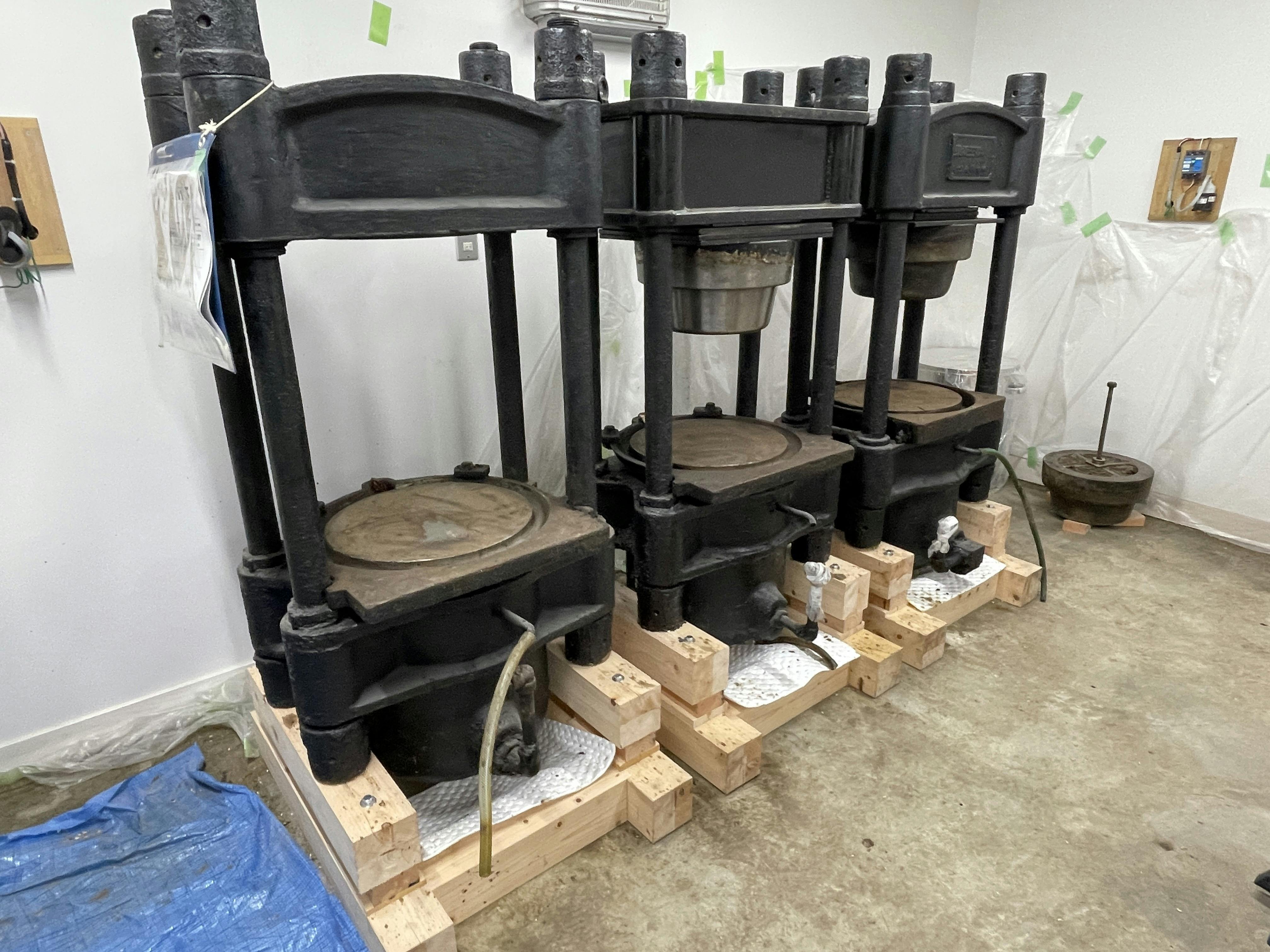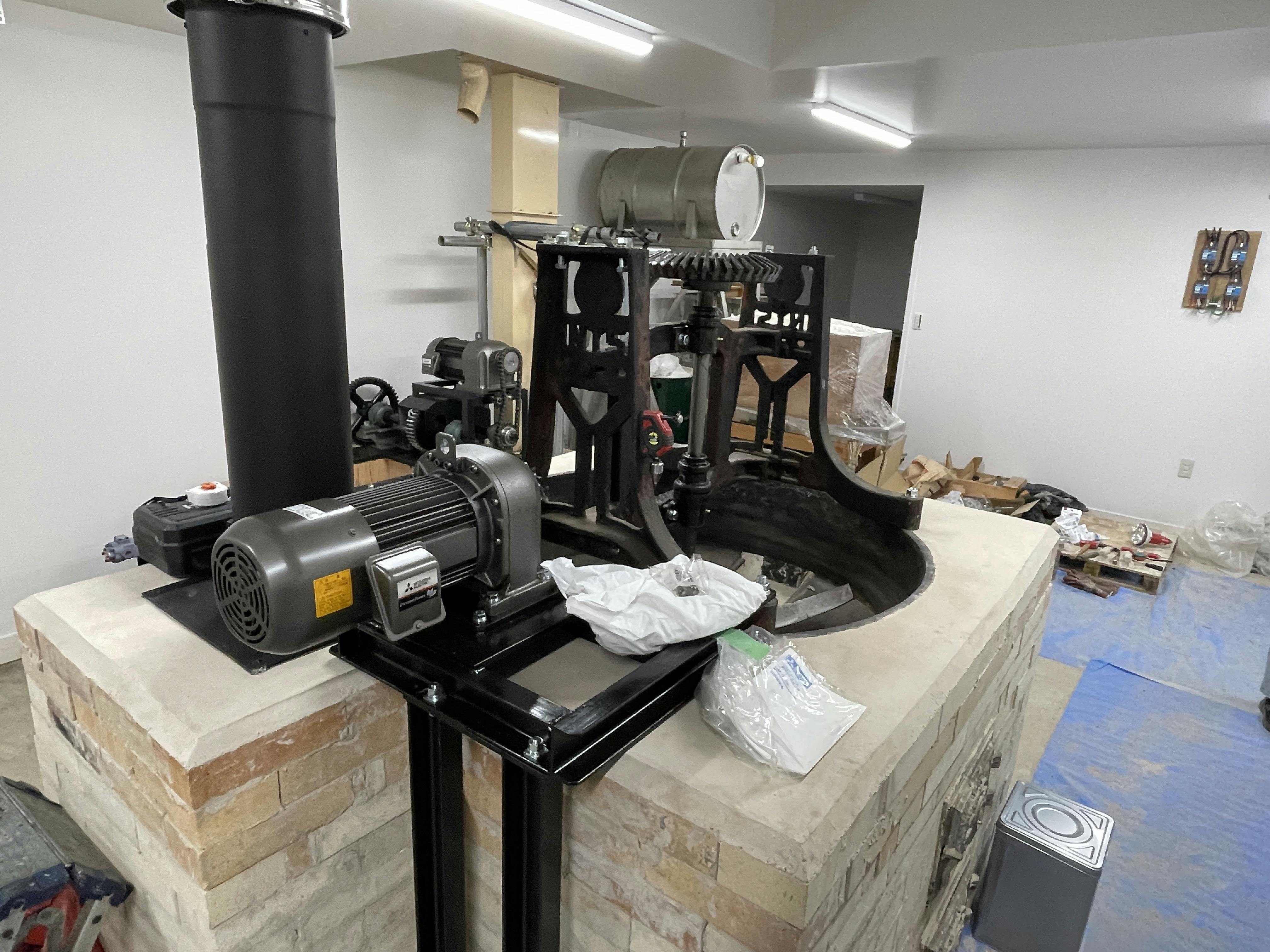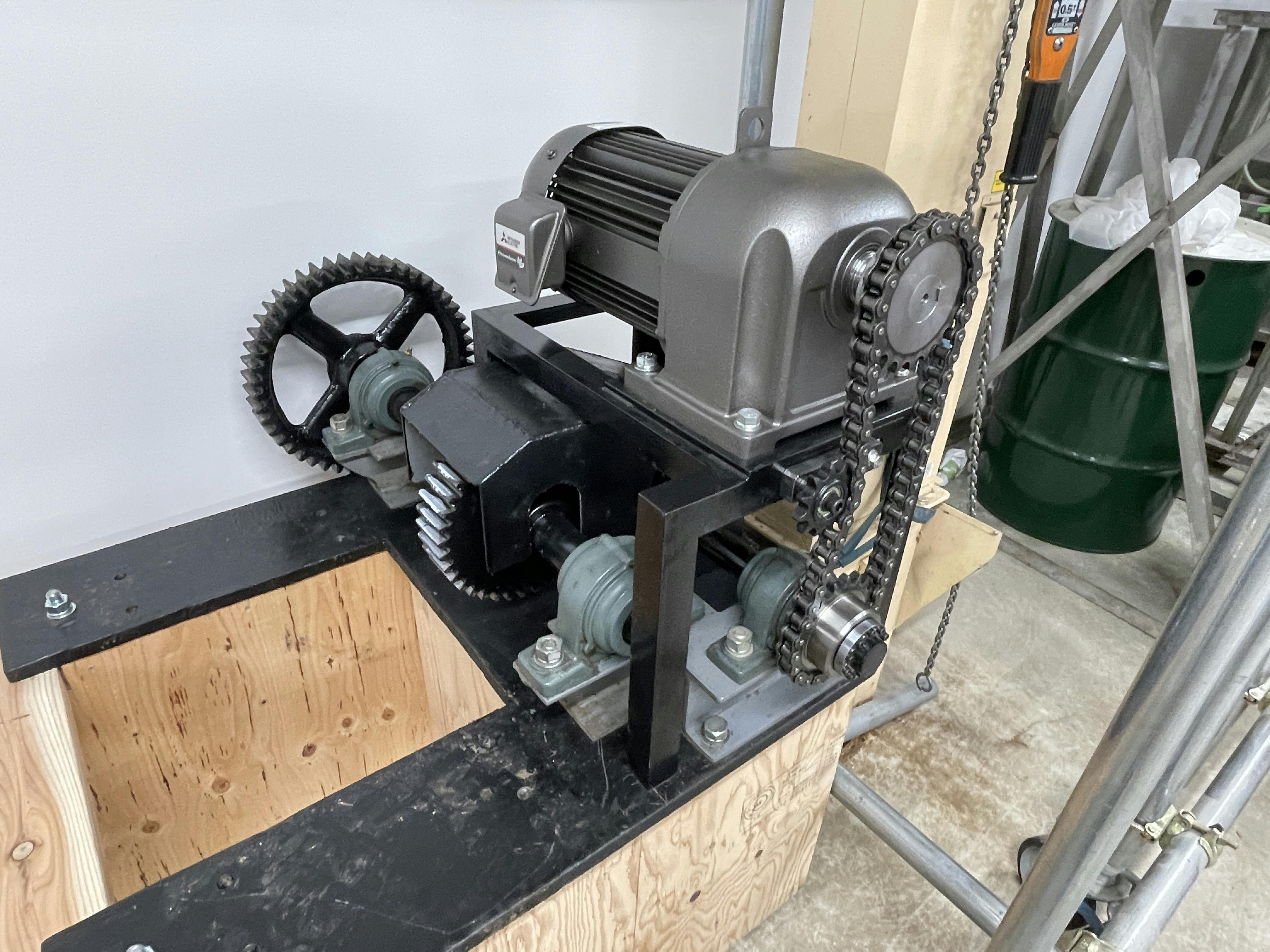 同じく圧偏機を動かすためのモーター駆動部分を設置。オーバーホールした圧偏機はこれから設置です。