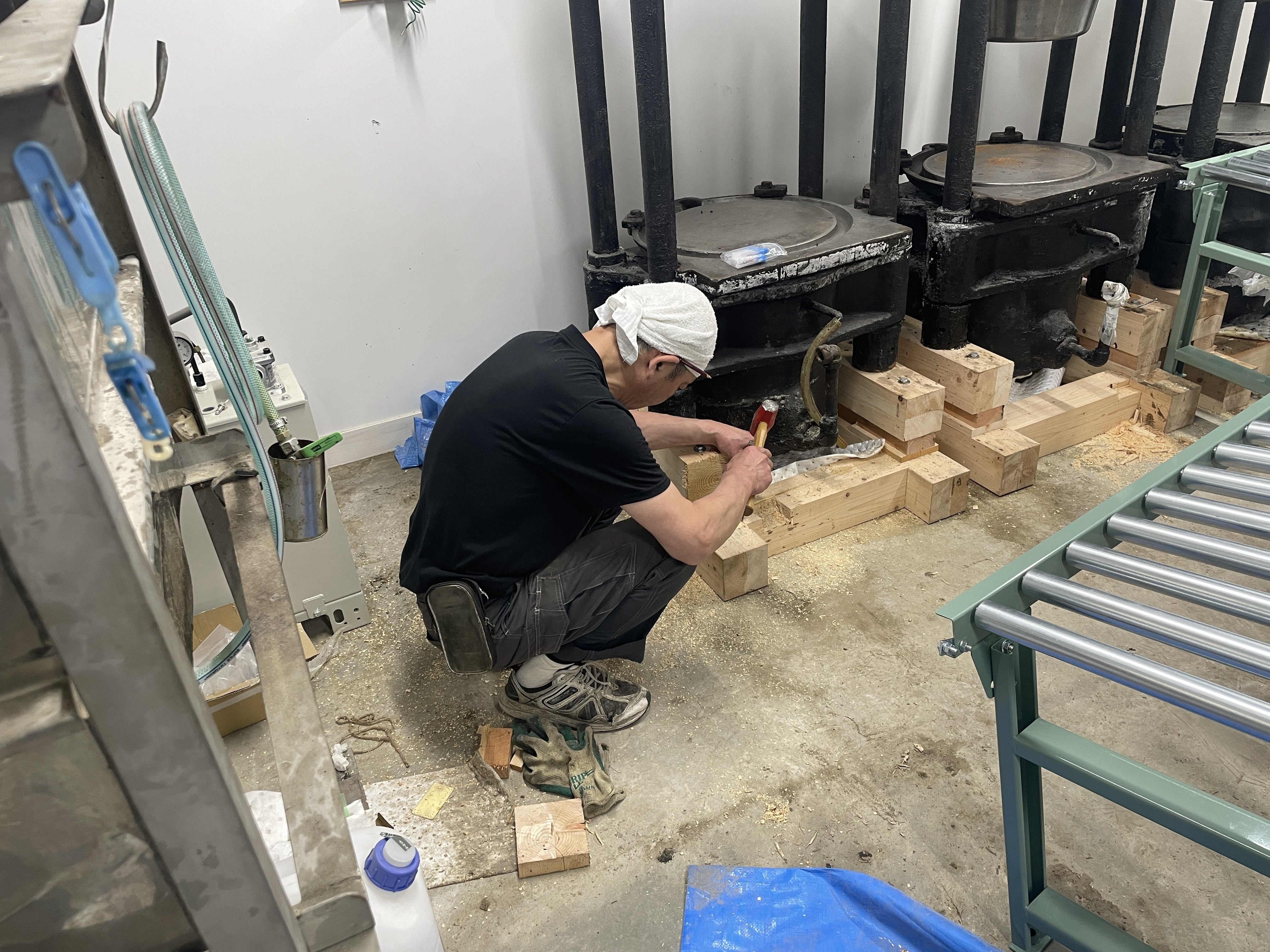 6月初めにローラーコンベア設置しましたが、油搾り作業をイメージしながら検討したところ、どうも使い勝手が悪いので、ローラーコンベアを追加して、桶にナタネを詰めるところを右側から左側に変更。油圧で上下するリフトテーブルの上で詰めることにしました。追加のローラーコンベアが届くのに時間がかかり、やっと作業に入れました。全体が長くなるので、ローラーコンベアの脚の位置も若干変わるため、あらためて玉締め機を支える木材を削り直しました。ノミと金づちでコツコツ掘りました。