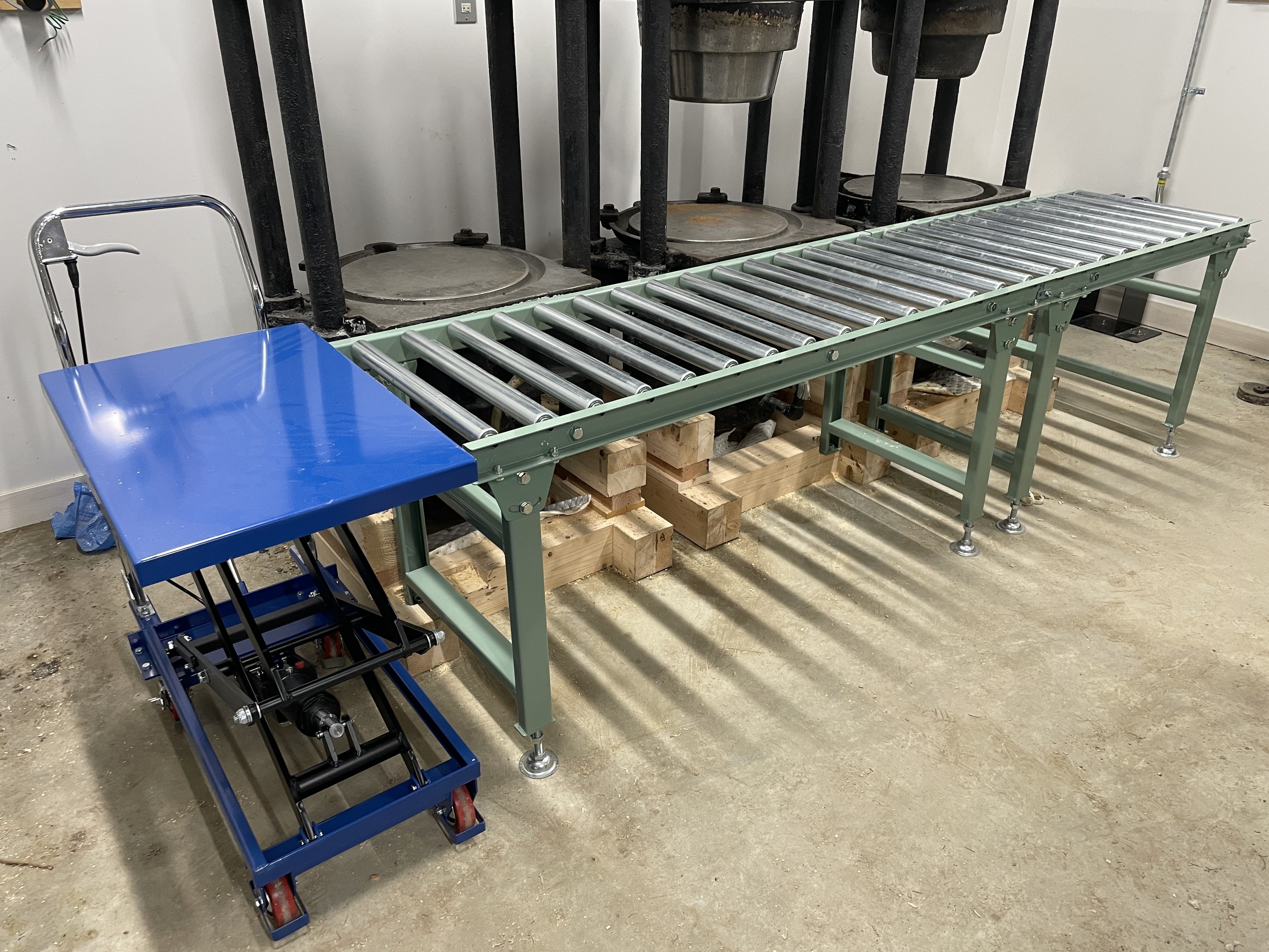下の写真が完成形です。左の青い台車がリフトテーブル。足のペダルで上下します。