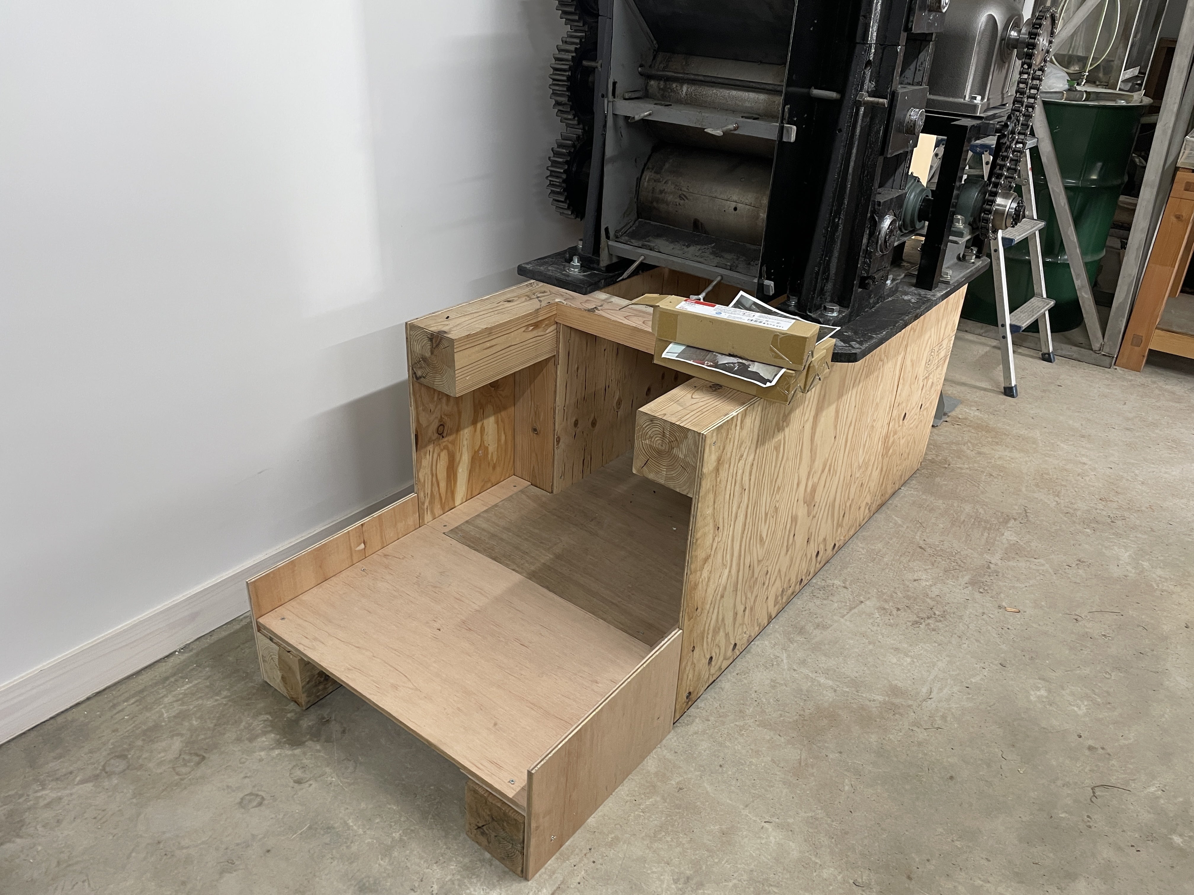 ナタネをつぶす圧偏機の土台は大桃建設工業さんに作ってもらいましたが、ナタネがコンクリに散らばらないように、受け台を作りました。下の写真は作業前。