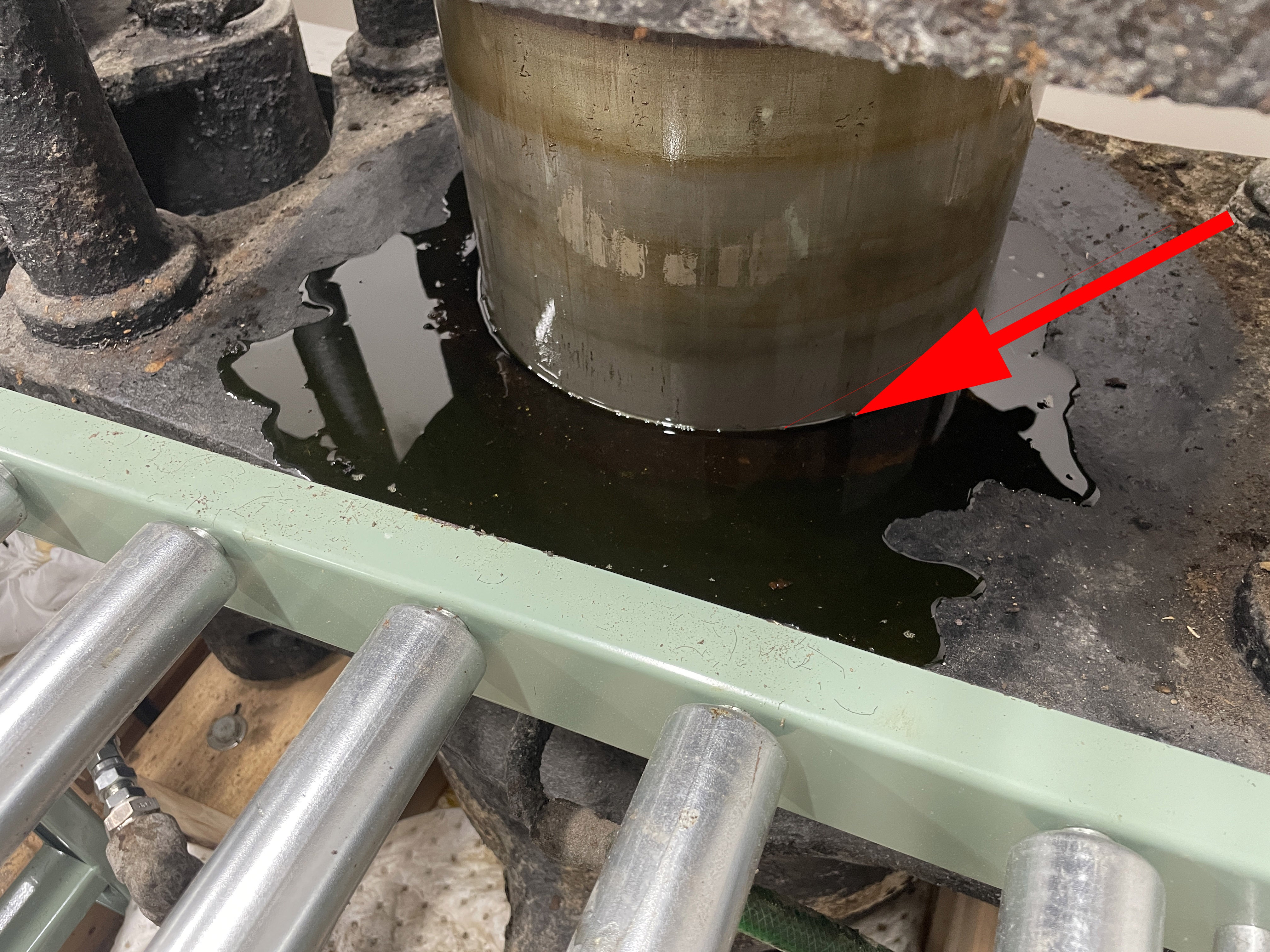 3基めの玉締め機は、パッキンが弱っているようで、シリンダの隙間から油漏れ。パッキンの交換が必要。玉川エンジニアリングさんに、1基めのパッキンを交換してもらってうまくいったので、これも大丈夫です。手間と力のいる大変な作業ですが、玉川エンジニアリングさん、よろしくお願いします。