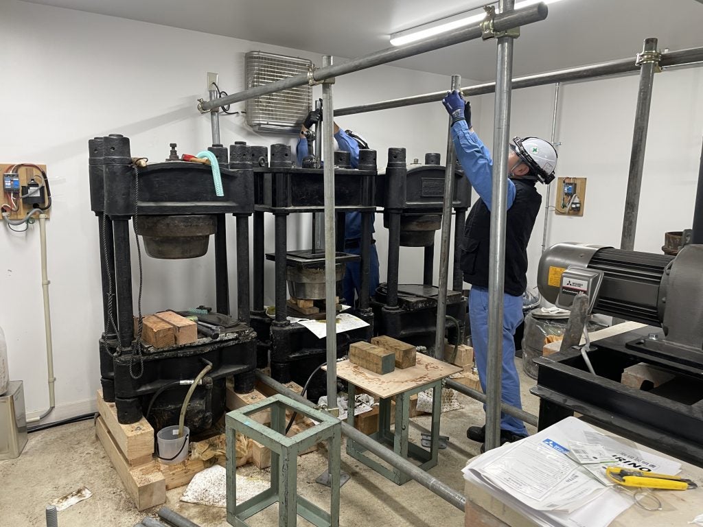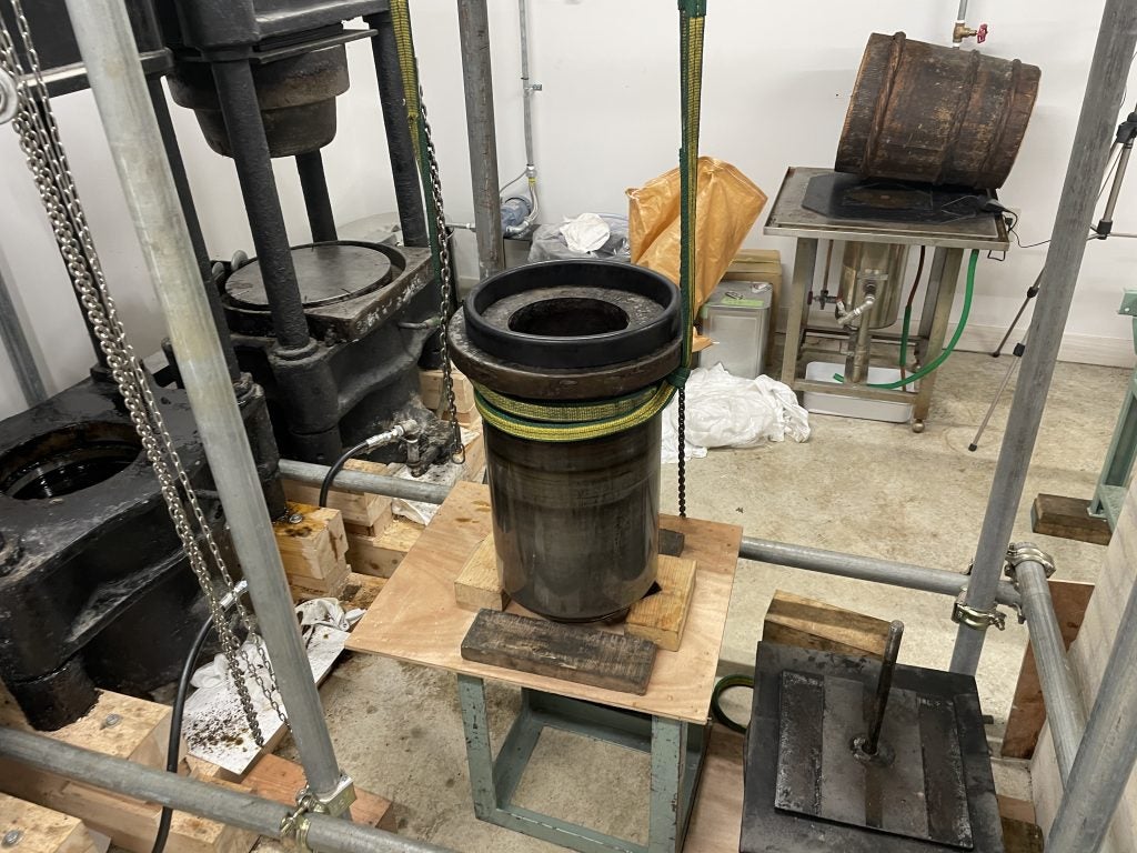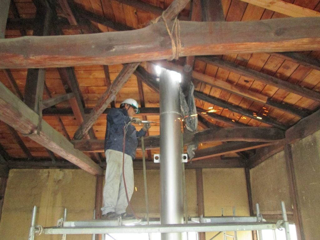 上下するピストンを抜くために、玉締め機の上側の「玉」も取り外さなければなりません。玉もピストンも非常に重いので、吊り上げるための足場が必要です。