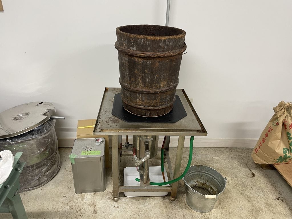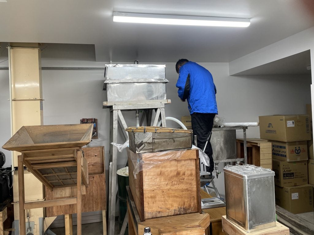 下は僕が作った蒸し台。上の桶とその下の黒い土台は平出さんから譲り受けたもので、その下の木製の台を自作しました。