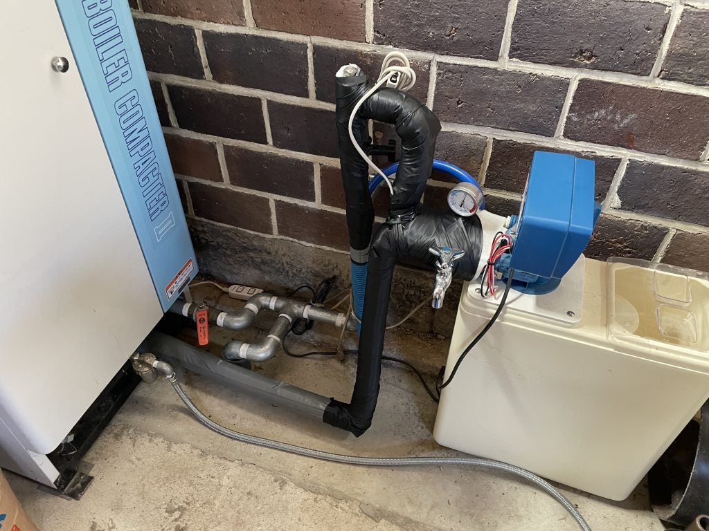 以前、大慶食機工業さんに設置してもらったボイラーには軟水器という水道水からミネラル分を取り除く機器も付属していますが、冬期の配管凍結が心配なため、凍結防止用のヒーターの巻き付けもやっていただきました。大慶食機工業さん、いろいろとありがとうございました!