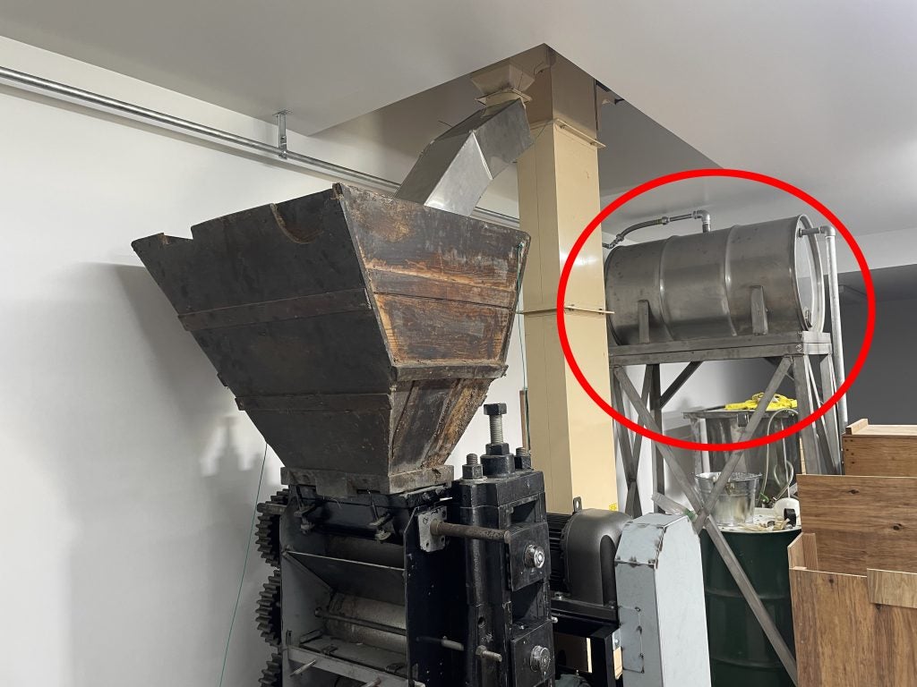 和紙で濾す前にナタネ油を貯めておく2次貯油槽を、平出さんが使用していたドラム缶から、完成したナタネ油をビンなどに詰めるためのタンクのひとつに交換することにしました。ドラム缶の底にナタネ油のオリがたまっていて除去が難しかったためです。