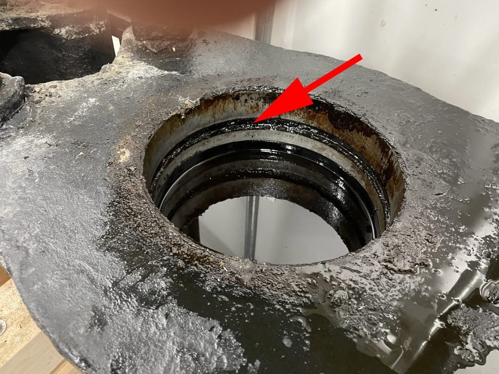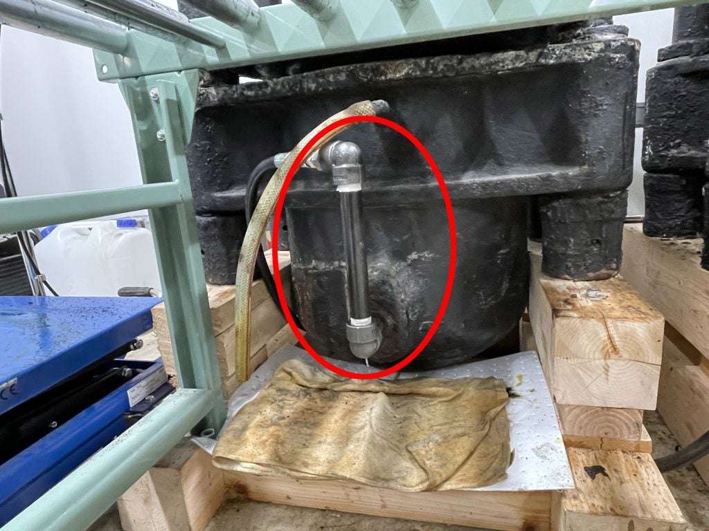 パッキンを取り出したあとです。油圧用のナタネ油が見えます。万が一の油漏れに備えて、油圧用にも古いナタネ油を使っています。