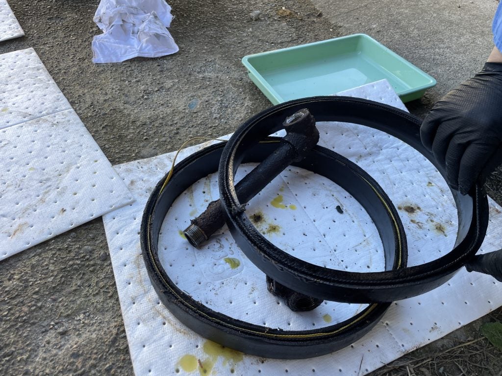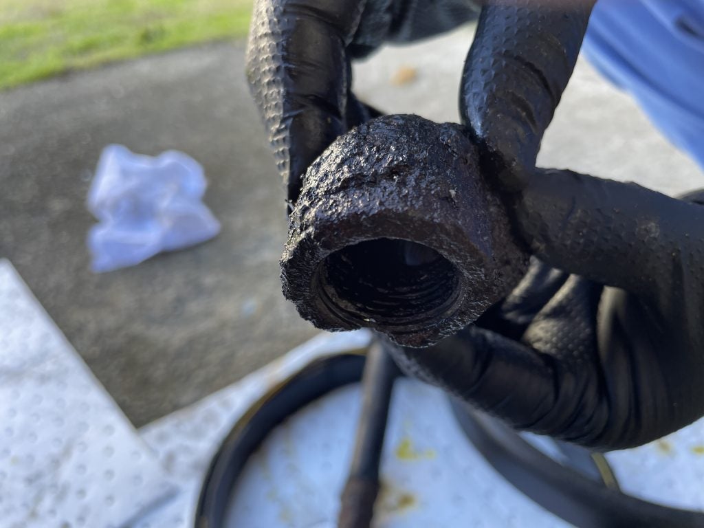 油漏れをしていた配管部分。大正時代から100年以上たつ間に腐食したようです。