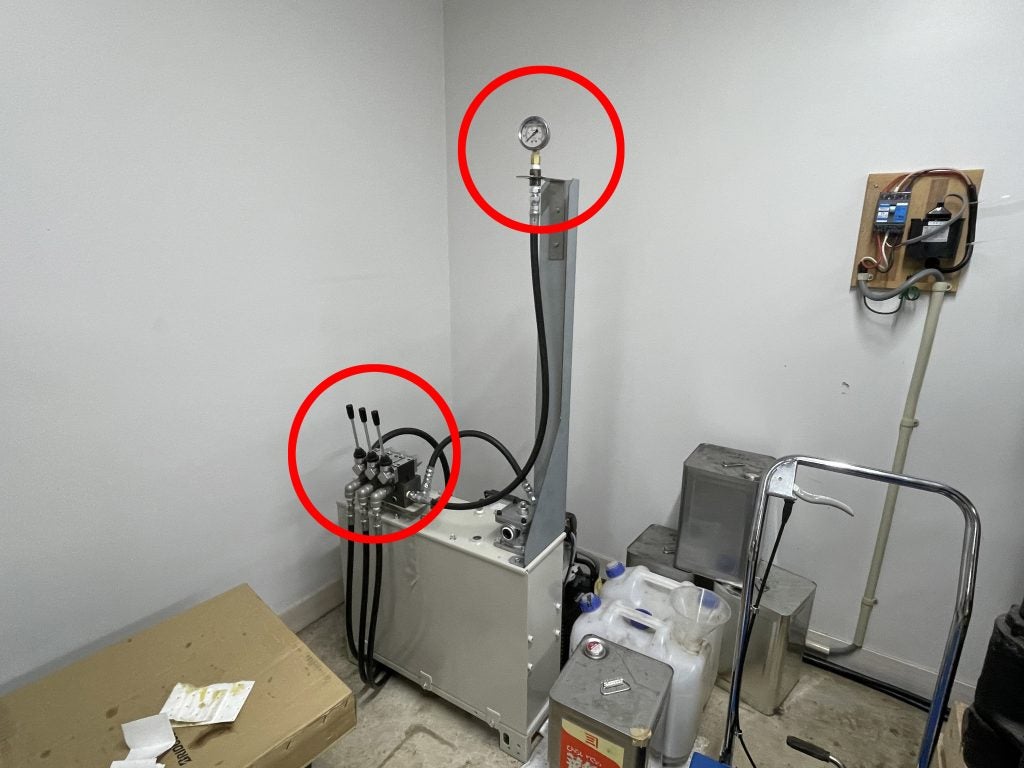 また、油圧ユニットの操作レバーの下に逆流防止のチェック弁の取り付けと、新しく購入した油圧計の設置もしてもらいました。