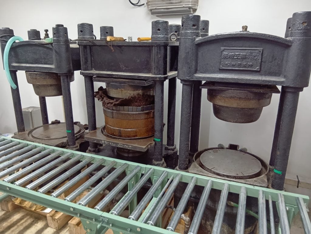 さらに油漏れのしていた配管も交換。平出油屋さんのところにあったときから、油漏れがあった可能性が高いです。玉締め機の下の部分は土の中に埋まっていて、油漏れがわからなかったようです。ただ、周りの土は油がしみ込んでアスファルト状になっていました。