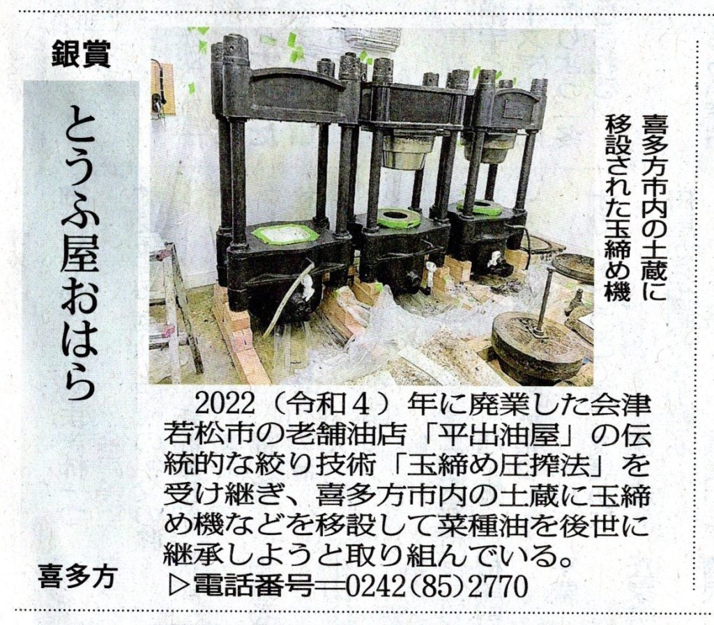 平出油屋プロジェクトのクラウドファンディングから移設工事までの取り組みが評価され、第11回ふくしま産業賞(ふくしま経済・産業・ものづくり賞 福島民報社主催)で銀賞を受賞し、12/24(水)付けの福島民報新聞で紹介されました。2026/2/6に福島民報社本社(福島市)で表彰式があります。何とか出席したいと思っています。