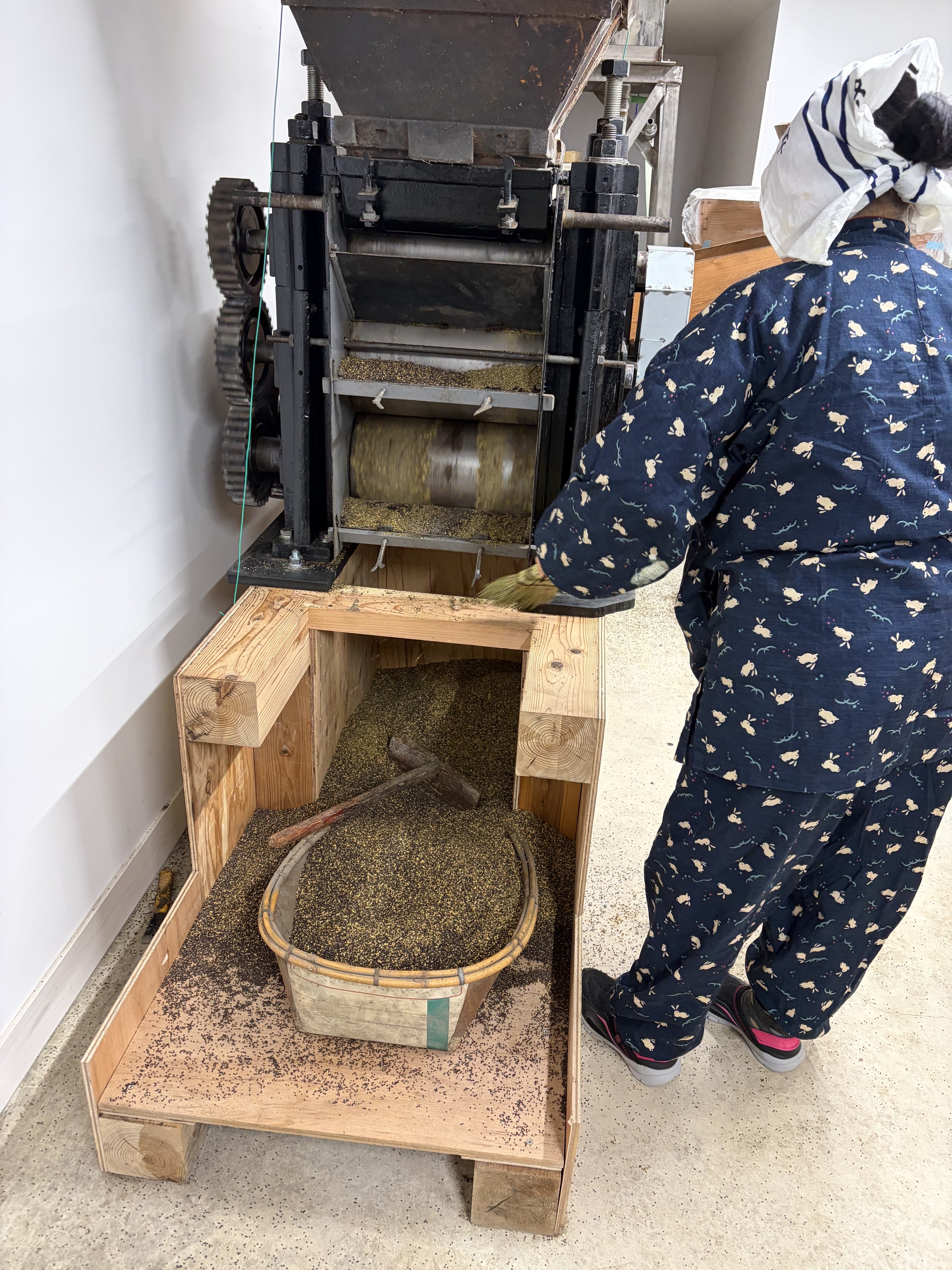 圧偏機もチェック。調整が不十分で、しっかりとナタネがつぶれてないことを指摘されました。