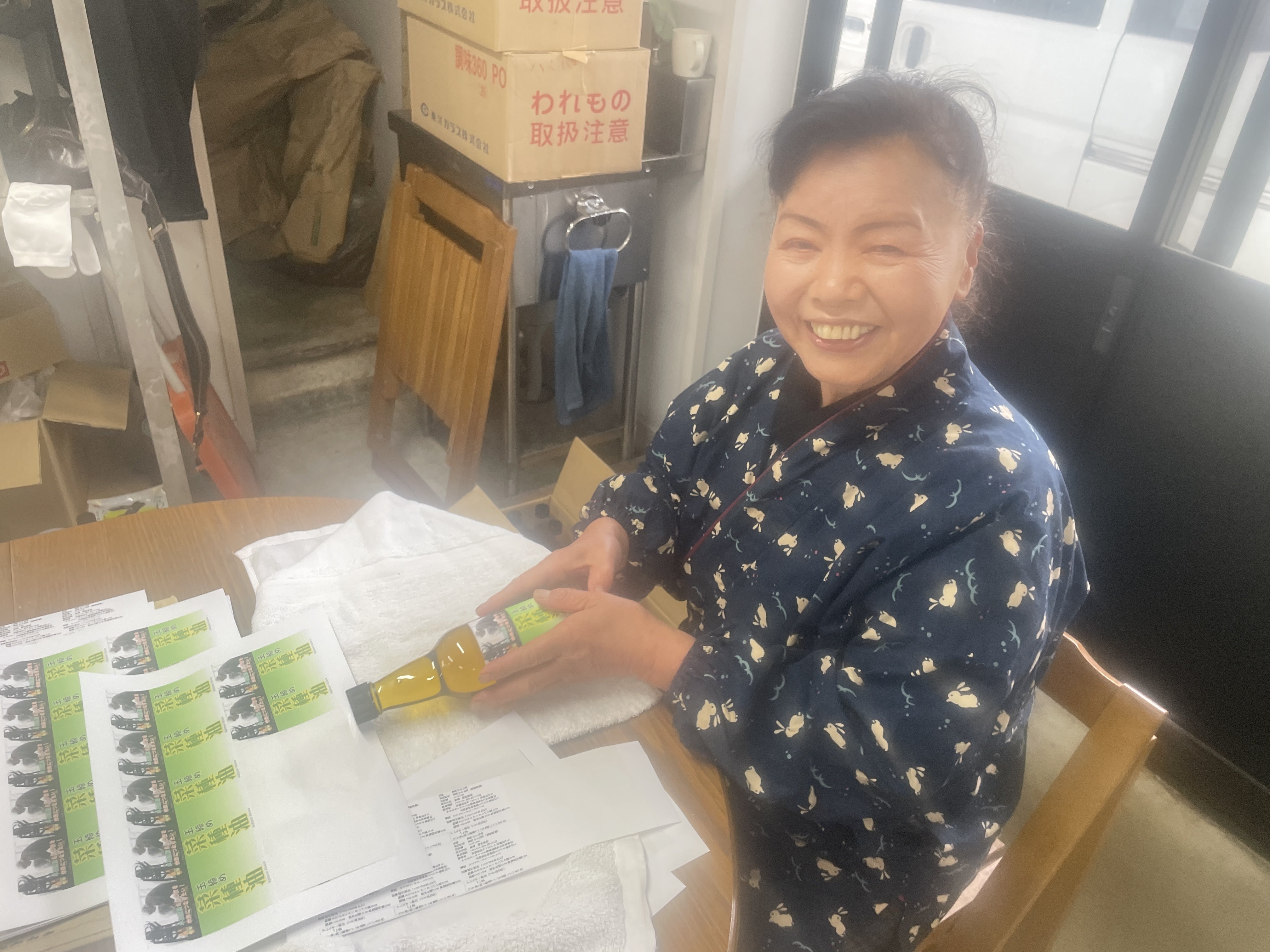 搾った油を2合瓶に詰め、ラベル張りをしてから箱詰めという作業になります。僕の妻が瓶詰めし、美穂子さんがリターン用特製ラベルを貼ってくれました。3/21に祐一さんの納骨が終わったばかりなのに、かけつけていただきました。