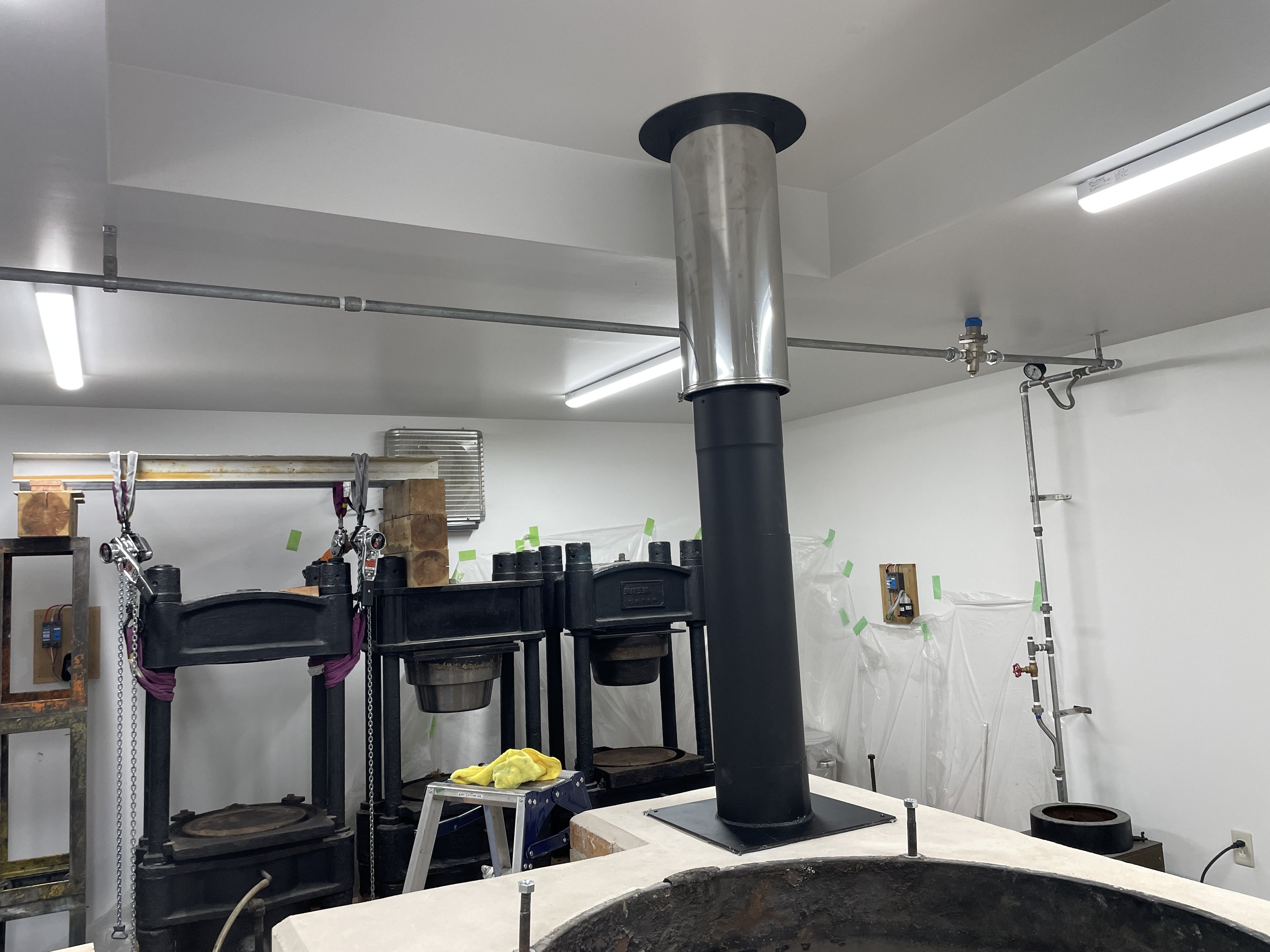 5/12(月) 煙突接続完了すでに煙突工事は屋根の上から天井まで完了していましたが、焙煎炉の上部モルタル仕上げが終わったので、焙煎炉との接続工事が行われました。煙突完了!上部の銀色の部分から上は二重(ダブル)煙突で、下部の黒い部分は一重(シングル)煙突になっています。黒い部分は取り外して煙突掃除ができるようになっています。天井裏に上がり、屋根を貫通する部分を案内してもらいました。あとは薪を焚く試運転を待つだけです。5/15(木)~5/16(金) 玉締め機の架台設置、焙煎炉の上部機構準備まず玉川エンジニアリングさんと大桃建設工業さんにより、玉締め機の下に正式の架台を設置してもらいました。3台の油圧台の高さがそろうように足を微調整。無事完了。玉川エンジニアリングさんが、焙煎炉の上部の羽根を回転させる機構を取り付けました。まだ完成ではありません。手前のモーターと歯車の接続が必要です。釜の中の羽根を回転させます。同じく圧偏機を動かすためのモーター駆動部分を設置。オーバーホールした圧偏機はこれから設置です。完成まであと少しです。2025/5/19記