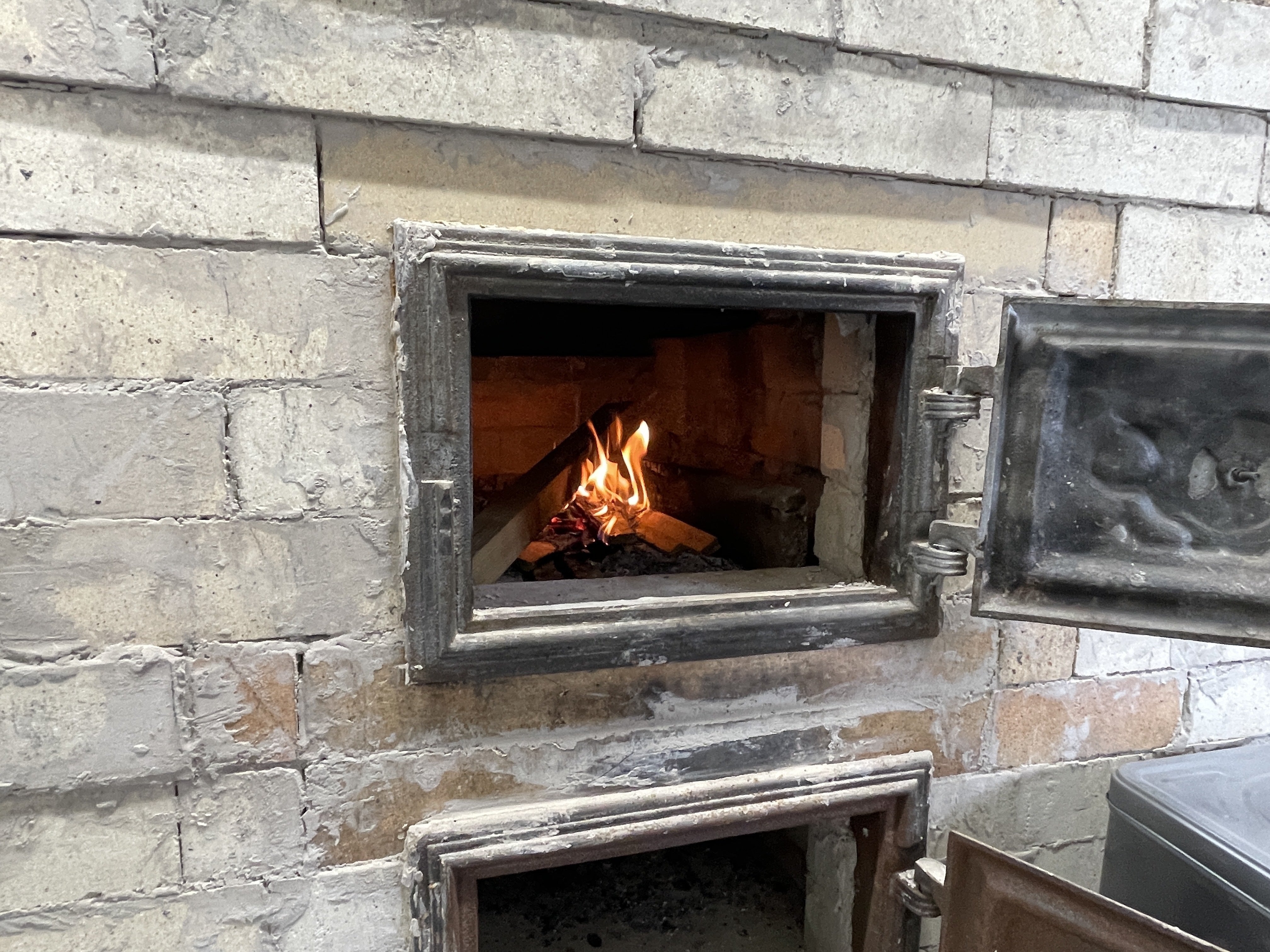 業者さんのスケジュールの関係や、こまごまとした作業が多くて大きな進展がなく、活動報告が久しぶりになりました。5/22(木) コンクリ床の穴あけ作業玉締め機からの油を貯める缶を設置するため、コンクリ床を斫(はつ)って穴をあける作業が大桃建設工業さんによって行われました。玉締め機からの原油は樋(製作中)を伝って流れてきますが、それをいったん缶(貯油槽)で受けます。玉締め機は架台にのせてかなり高くなっていますが、それでも貯油槽を低くしないとうまく受けることができないためです。右上隅の穴がそれです。貯油槽を仮置きするとこんな感じです。この貯油槽の高さにあわせて樋(とい)を玉川エンジニアリングさんに製作してもらっています。5/27(火) ナタネを受ける作業台車の組み立て開始焙煎炉で炒ったナタネや蒸したナタネを受ける作業台車は小原の自作です。ホームセンターでカットしてもらったり、自分で切った材木を組み立て始めました。まだ材料が足りないので、完成までは時間がかかります。完成予想図がないので、どんなものになるかは完成してからのお楽しみ。6/2(月) 焙煎炉に初めてテストの火入れ!煙がレンガの間から漏れないで、ちゃんと煙突から出るかをテストするために、初めて焙煎炉に火を入れました。ちゃんと煙突から煙が出て、漏れはありませんでした!曇り空だったので、白い煙は写真にはうまく映りませんでした。6/3(火) ローラーコンベアの設置開始ナタネをつめた桶を移動しやすくするために、平出さんのアドバイスでローラーコンベアを設置します。とはいうものの、玉締め機の下に足として頑丈な木材を入れたために、それが邪魔になってうまく置けません。翌日6/4(水) 仕方がないので、木材をドリルやノミで斫って穴を開けることにしました。まだ高さの調整が必要です。疲れたので後日。同日6/4(水) 大桃建設工業さんにより、平出油屋さんの片付け工事が行われました。立ち会ってないので写真はありませんが、平出さんによるとすっかりきれいになったそうです。2025/6/8記