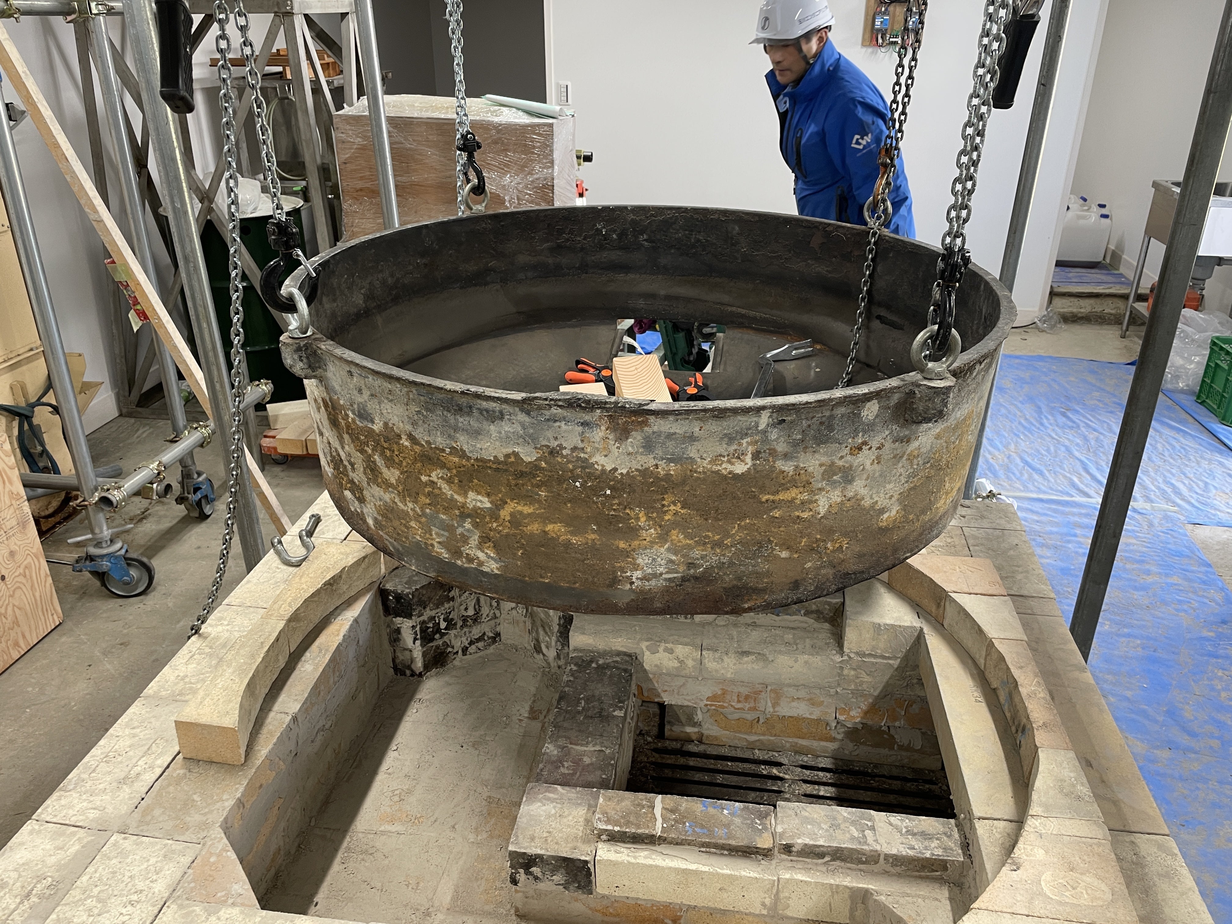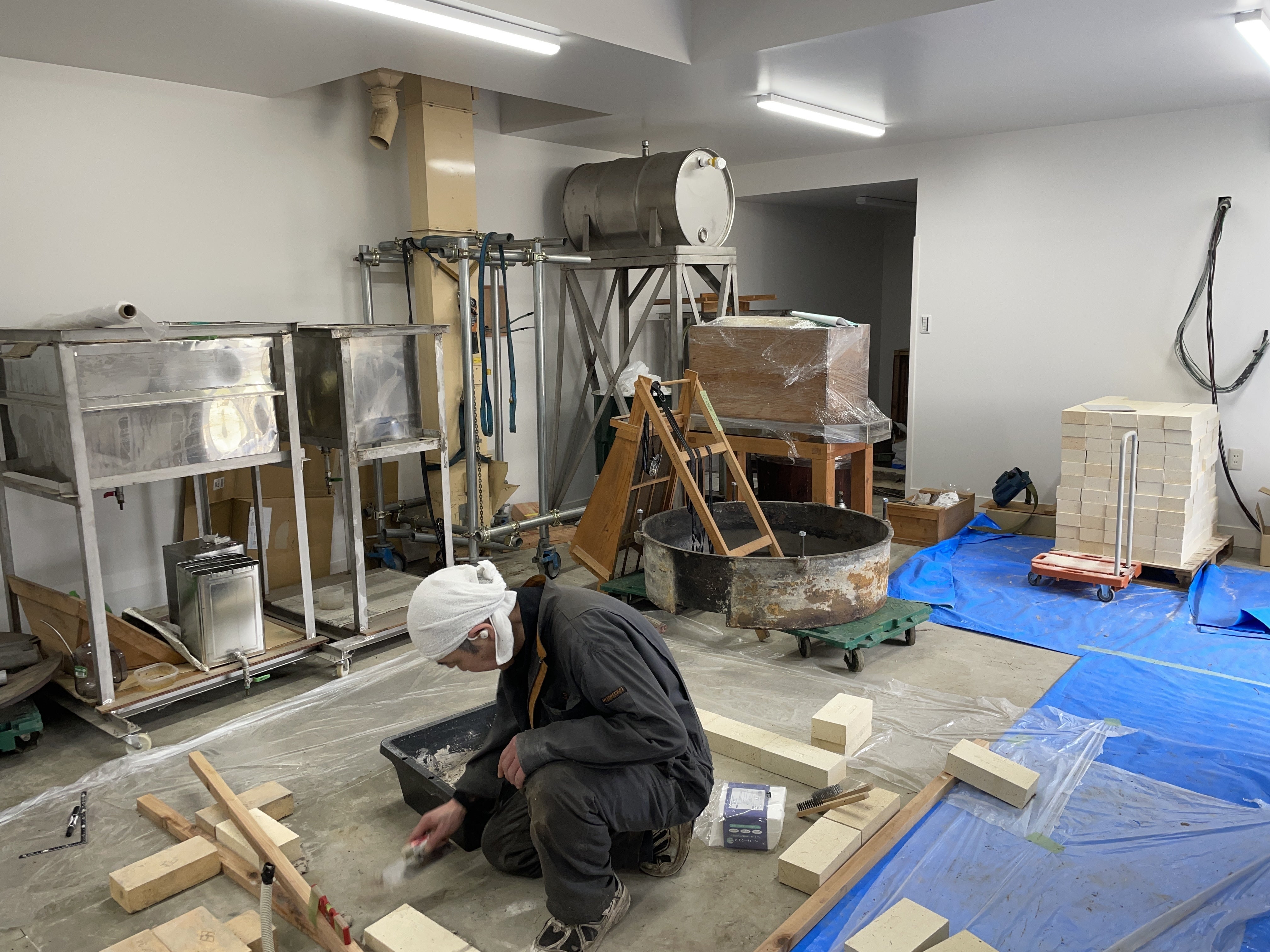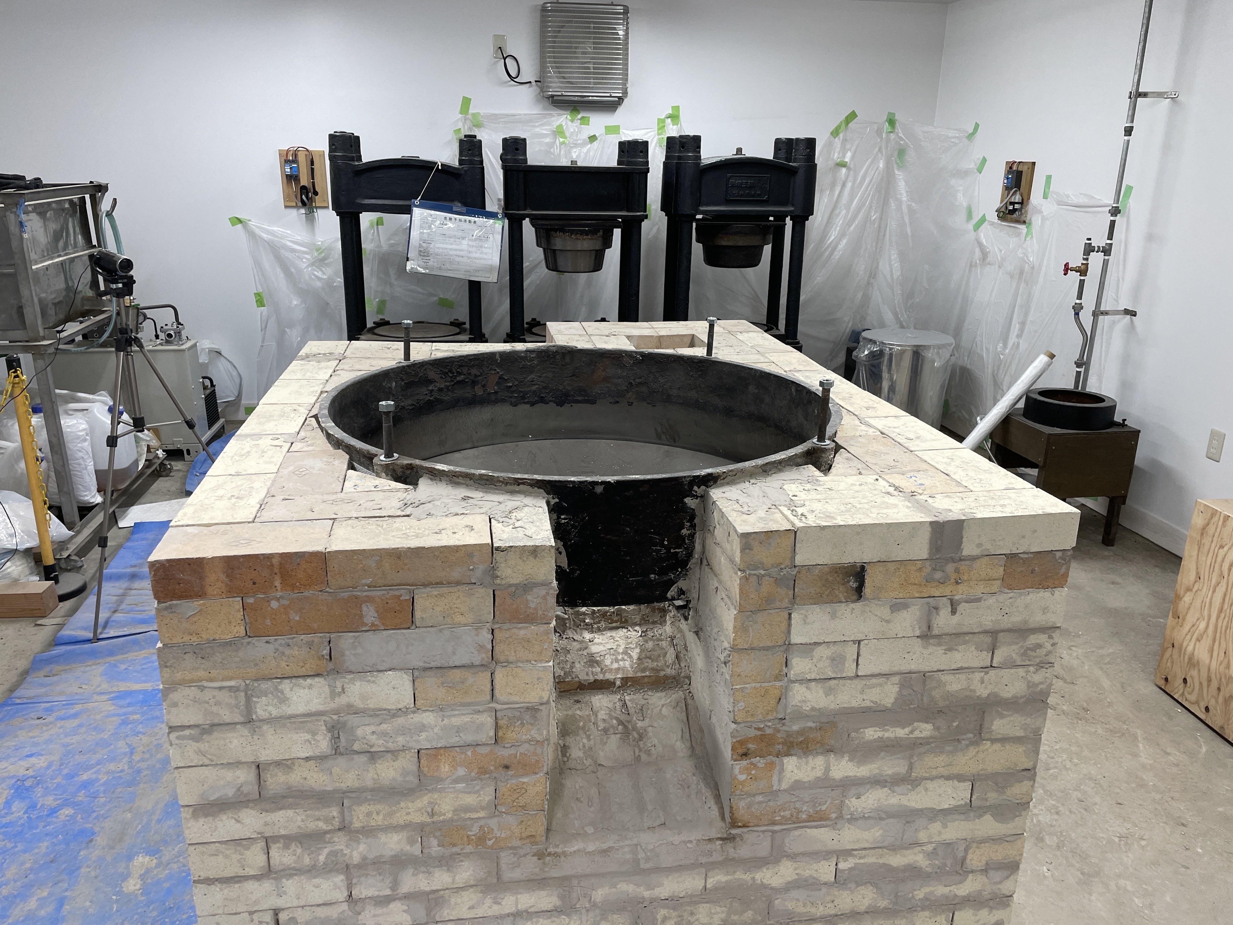 4/20(日)~4/26(土)の期間は、主に焙煎炉の組み立てでした。4/21(月) 焙煎炉に鉄釜を設置レンガが11段目まで完了したところで、鉄釜を載せました。玉川エンジニアリングさんのご協力により、準備に半日以上かけての大仕事でした。まず、釜の周囲にくるレンガを並べてみます。慎重に鉄釜を移動します。見事ピッタリと載りました!この日は、玉締め機の油受けの裏面の汚れを落として塗装もしました。長年の汚れを落とすのが大変でした。4/23(水) 焙煎炉の13段めまで完了しかし、15段まであと2段残して豆腐屋の臨時休業も終終了。あとは仕事の合間に少しずつ仕上げていきます。2025/4/27記
