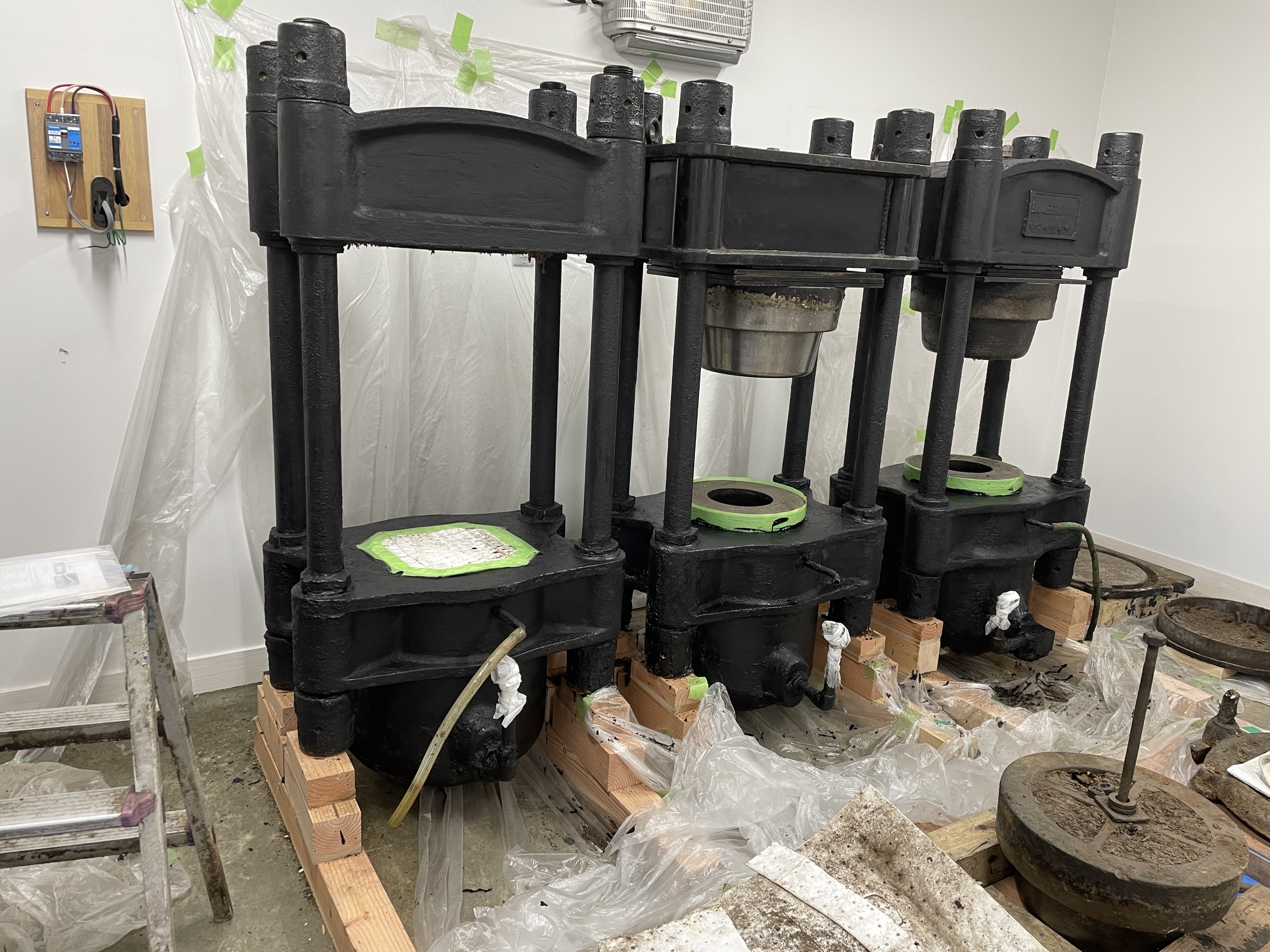 4/7(月)から4/23(水)まで豆腐屋を臨時休業にして、僕も油屋工事に入ってます。4/7(月) 圧偏機オーバーホール 見学2年以上使われていなかったためナタネをつぶす圧偏機が固まってしまい、玉川エンジニアリングさんにオーバーホールをお願いしています。これは元の姿。以下は、分解した様子です。こびりついたナタネや油をきれいに掃除していただき、塗装もしてもらいました。分解清掃に大変な苦労があったということです。下のローラーの軸がすり減っていて、本当は修理が必要なのですが、専門業者に修理に出すと1本あたり20万円程度の費用がかかるということです。3本あるので60万円ぐらいになってしまいます。とりあえず、修理せずに組み立ててもらい、動かしてみてから判断することにしました。下のギアもきれいになりました。4/8(火) 玉締め機の清掃 焙煎炉設置の準備玉締め機を長持ちさせるため塗装しようと思っていますが、その前に100年にわたってこびりついた油の膜やさび落としの下処理に一日かかりました。下は、煙突屋さん、玉川エンジニアリング、大桃建設工業さん3者による、焙煎炉の位置決め作業です。煙突を屋根から出すので、梁にあたらないように慎重に確認しました。4/9(水) 入口周辺の塗装と焙煎炉組み立ての準備塗装屋さんによって、入口周辺の塗装が行われました。完成。さすがプロです。4/10(木) 焙煎炉組み立て 1日めやっと準備もでき、耐火レンガを組み立てを始めました。耐火モルタルという耐熱性の特殊で高価なモルタルを使います。初めての作業なので、慣れるまで時間がかかります。豆腐屋はレンガ屋に挑戦です。電気工事も進み、照明がついたので助かりました。1日がかりで、やっとここまでできました。1段目が完了しませんでした。全部で15段あります。2025/4/11記